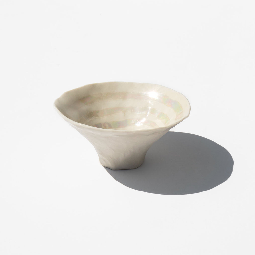Hand pinched, glazed and fired porcelain pinch pot by Isabel Halley with subtle, iridescent mother of pearl glaze. Each bowl is made by pinching the clay from the center as far as the porcelain will allow. The process of pinching creates an organic, delicate form that is uniquely different in each piece. Perfect for salt and spices, rings and jewelry, or all manner of tiny treasures.