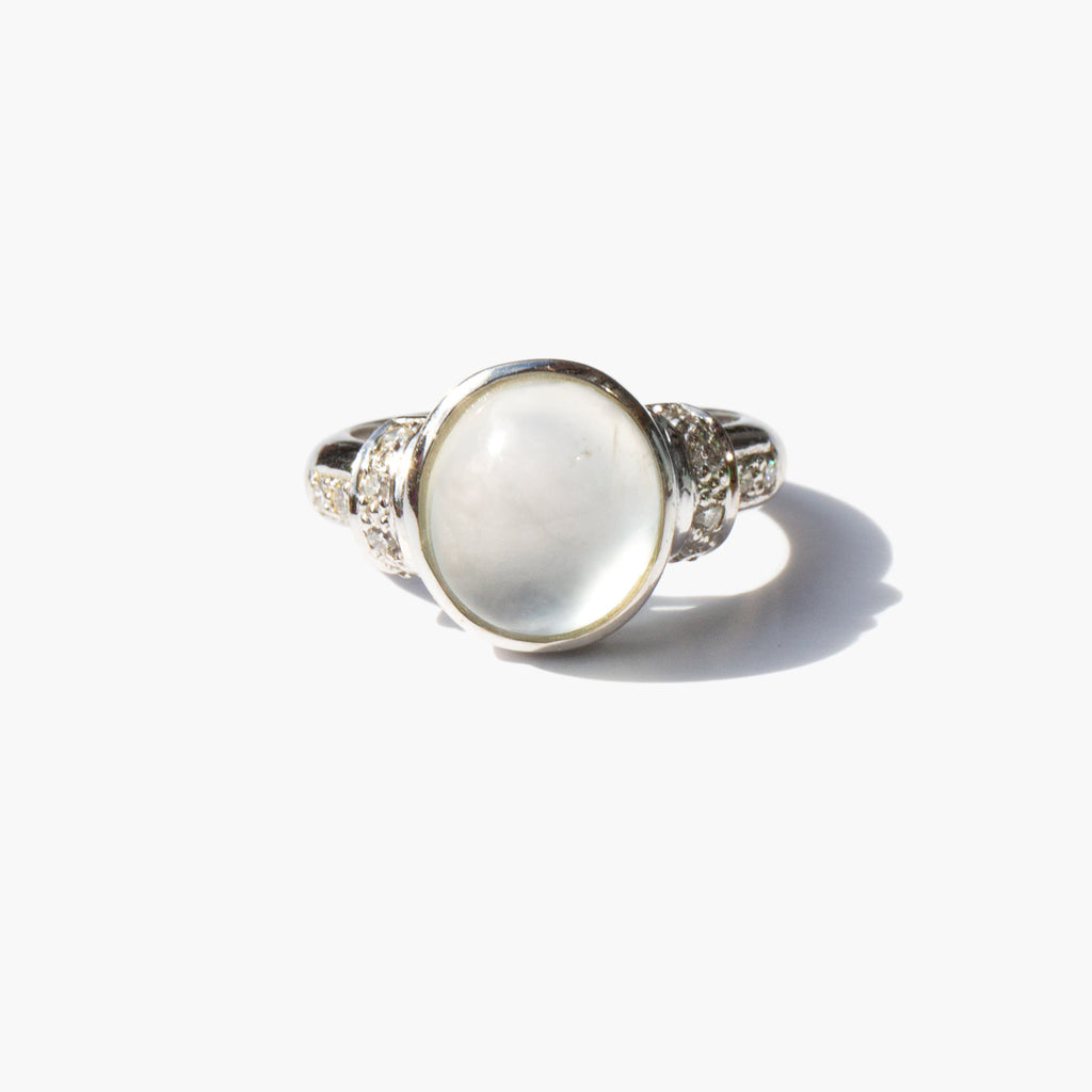 Moon-like ice jade cabochon set in 18k white gold and flanked by diamonds.