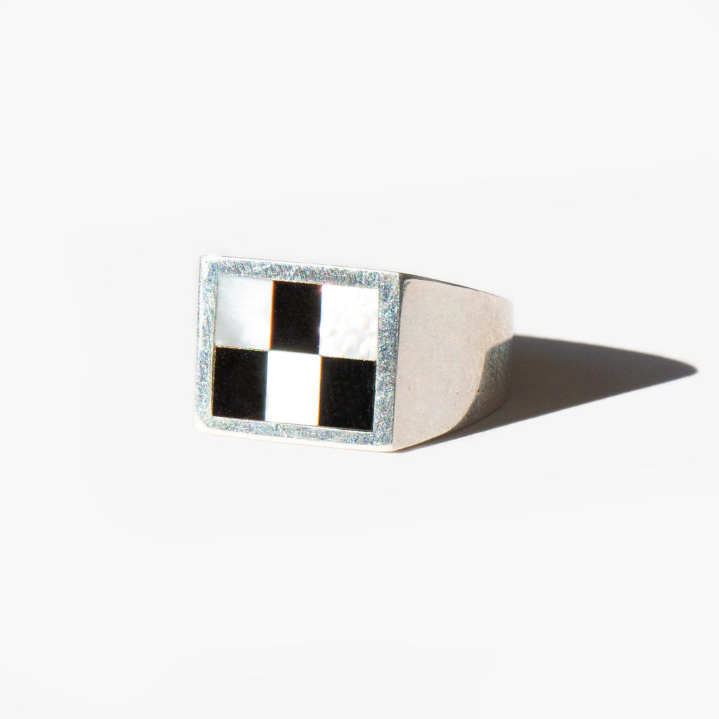 Signet style sterling silver ring with a chess pattern of ethereal, iridescent mother of pearl and inky, pigmented black onyx. The mother of pearl is responsibly sourced from New Zealand, where it is grown and harvested with special attention to the longevity and health of the mollusks that provide it. The onyx in this collection is responsibly sourced from North-Eastern India, where it is mined, chipped, and finished by a community of artisans. This ring is hand fabricated in Los Angeles using 100% post-consumer recycled gold and silver that is certified by the Responsible Jewelry Council and SCS Global Services to be ethically, environmentally, and socially sustainable.