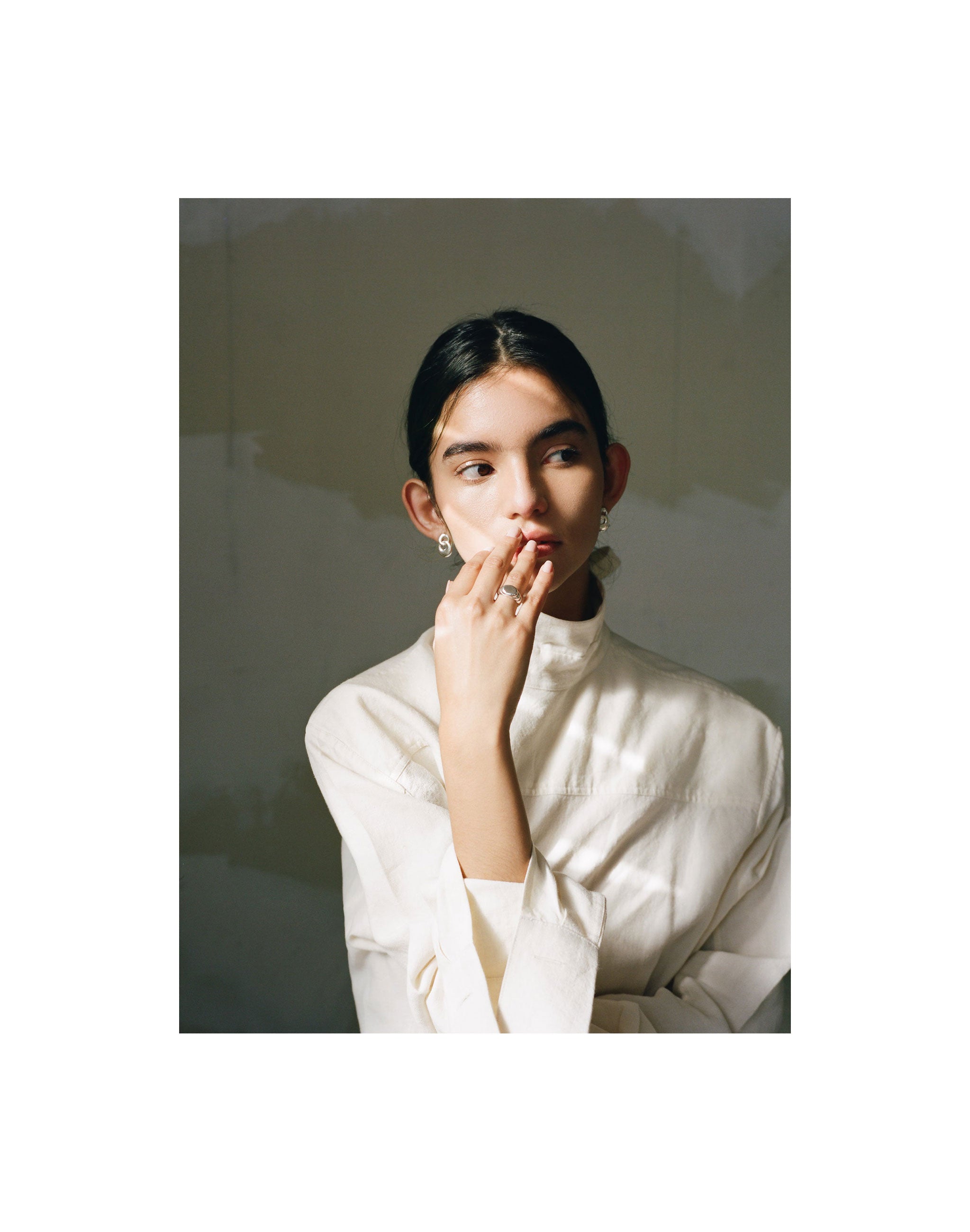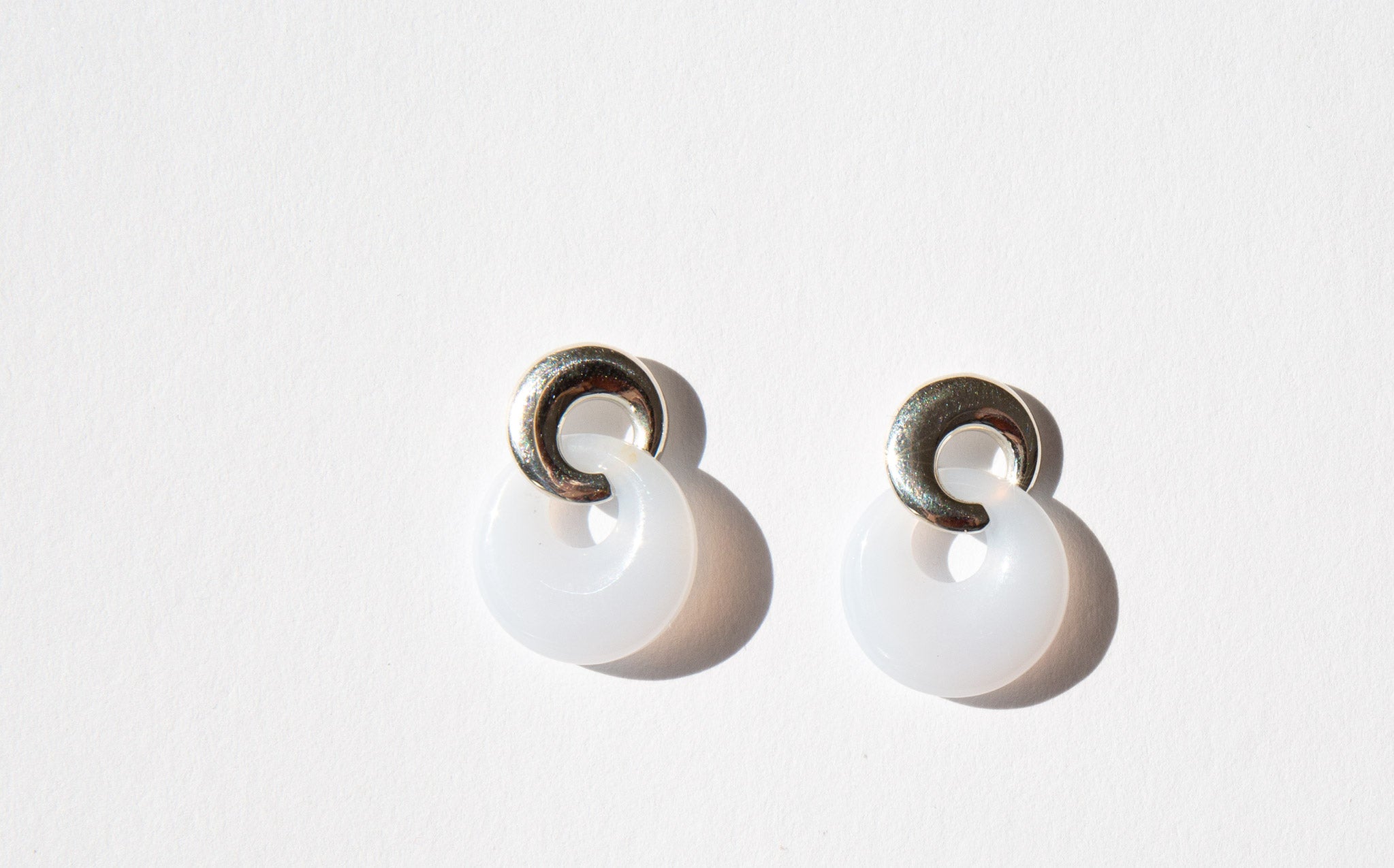 From a collection drawing on J. Hannah signature styles exploring the possibility of shape and proportion – interlocking sterling silver hoops that form door knocker style earrings with custom cut blue chalcedony stone. The blue chalcedony is sourced responsibly from eastern Oregon, and individually cut at a globally recognized leader in safe gemstone cutting. The earrings are hand fabricated in Los Angeles using 100% post-consumer recycled silver that is certified by the Responsible Jewelry Council and SCS Global Services to be ethically, environmentally, and socially sustainable.