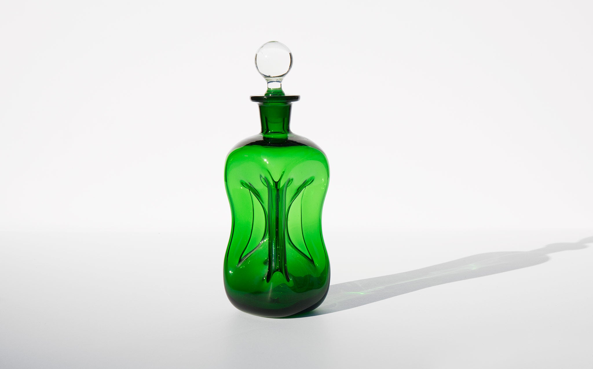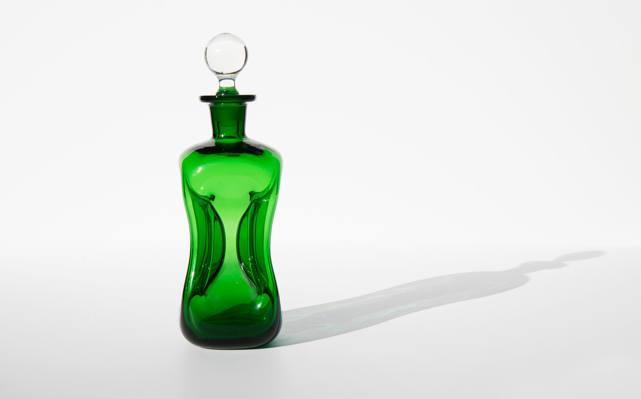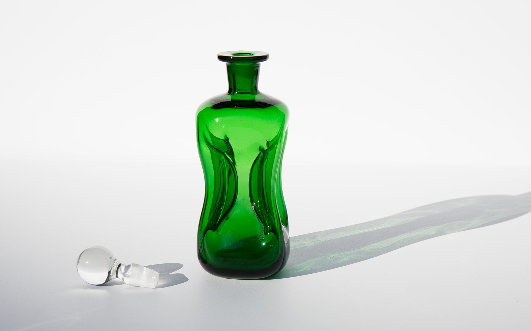 Brilliantly bright, translucent emerald green glass bottle with a crystal clear glass stopper.
