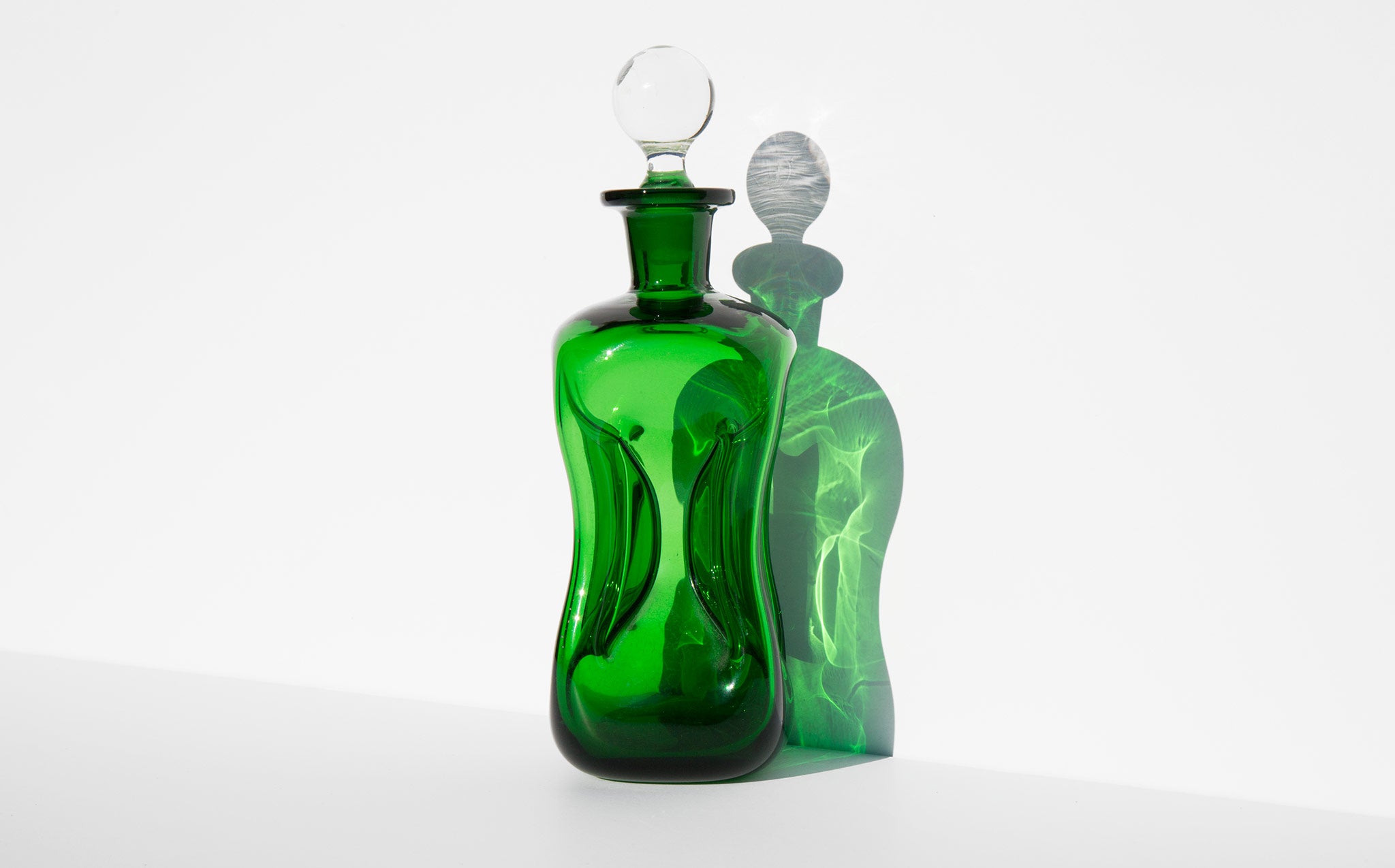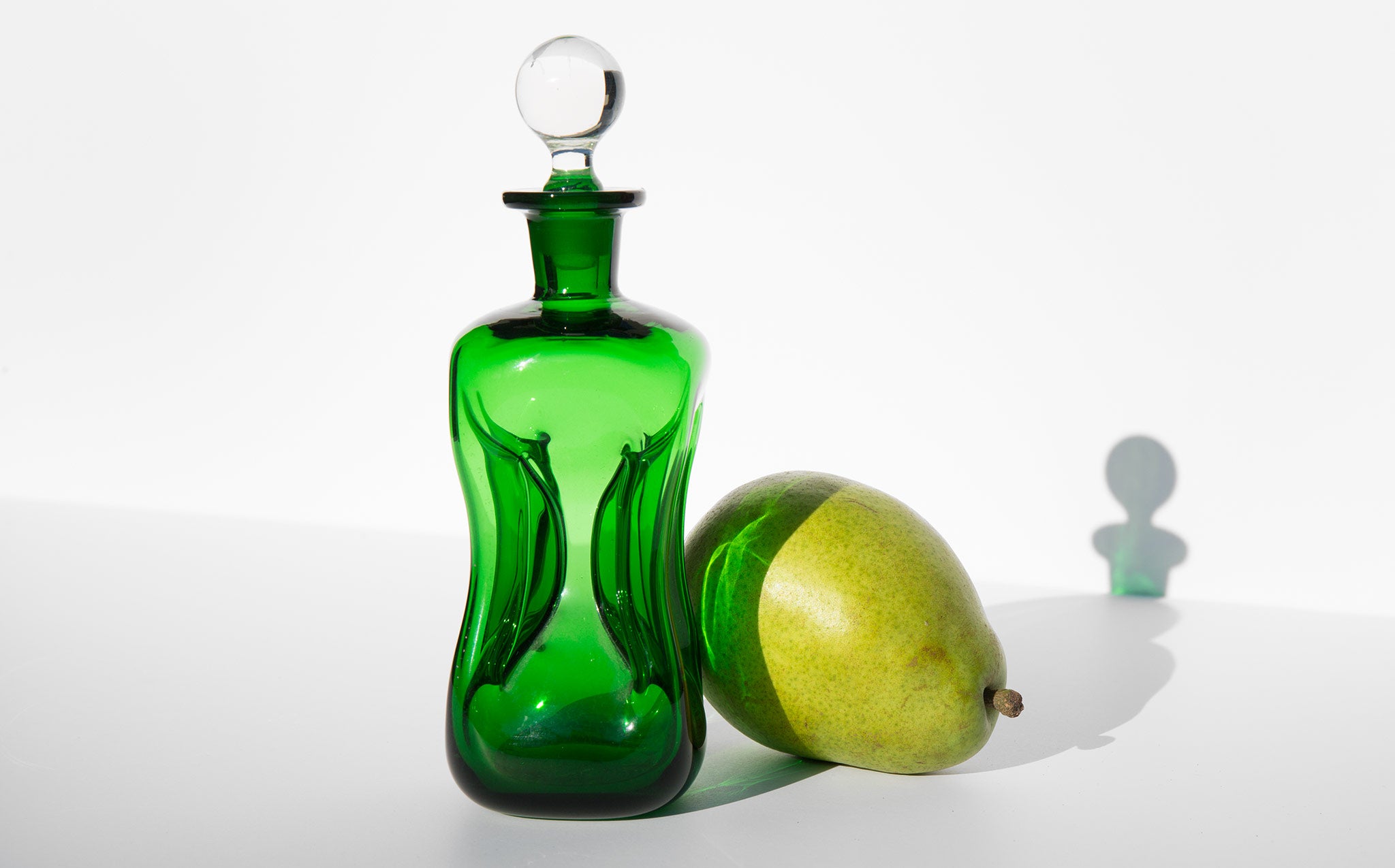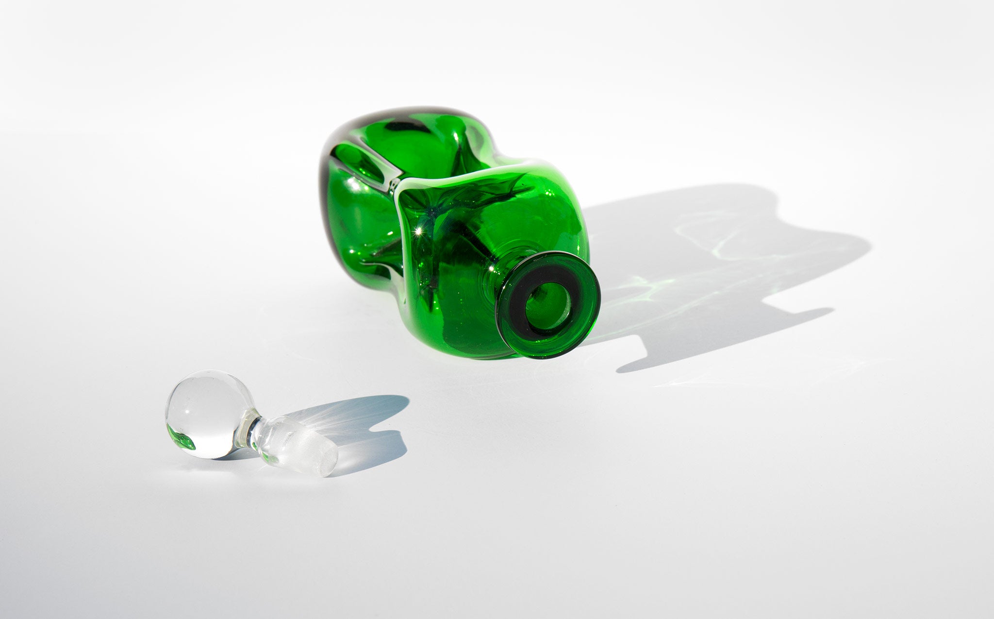 Brilliantly bright, translucent emerald green glass bottle with a crystal clear glass stopper.