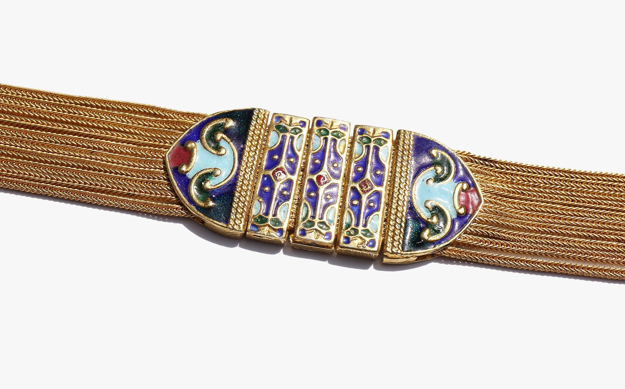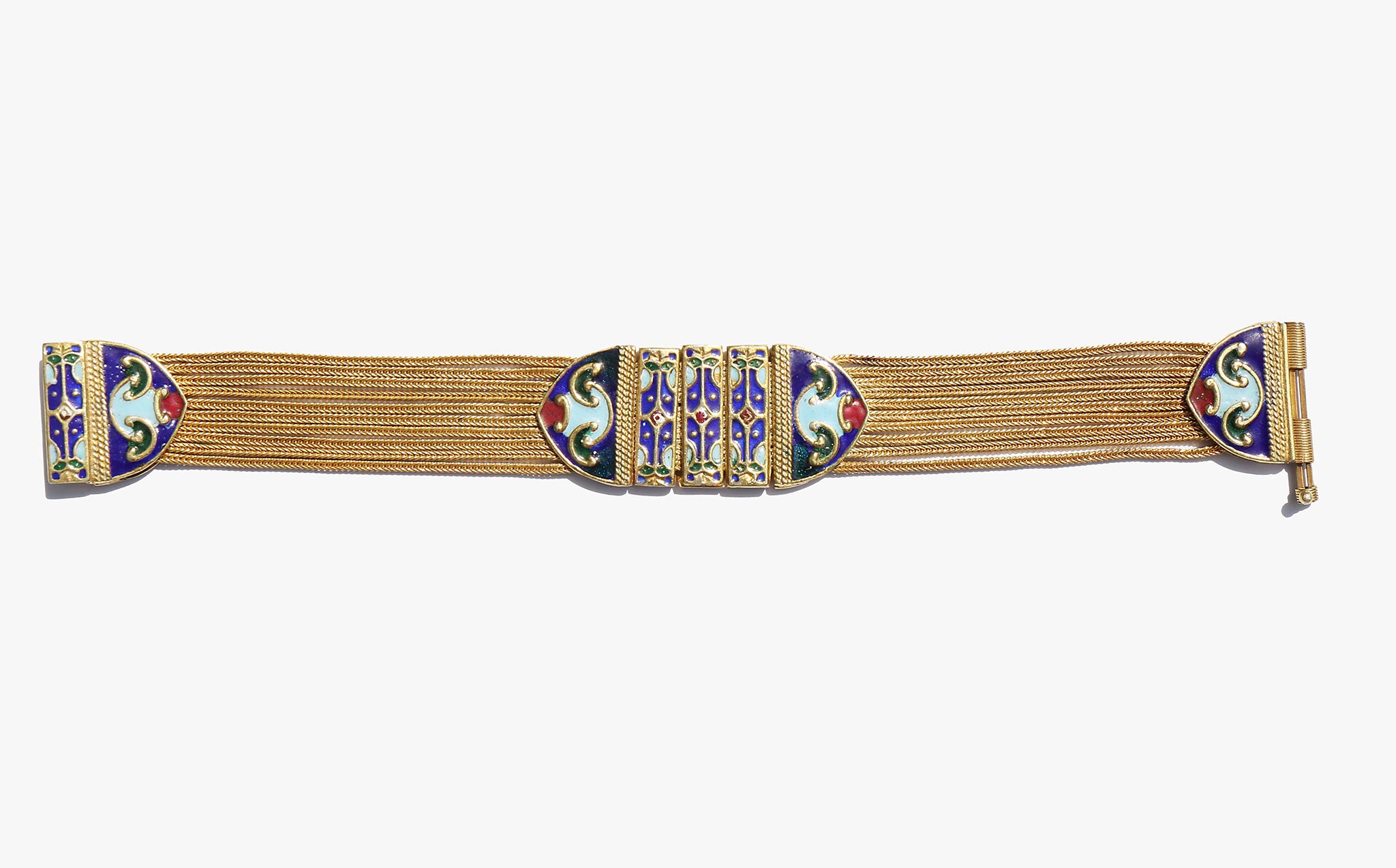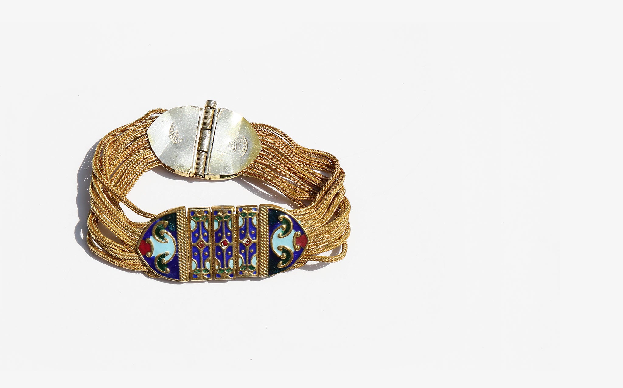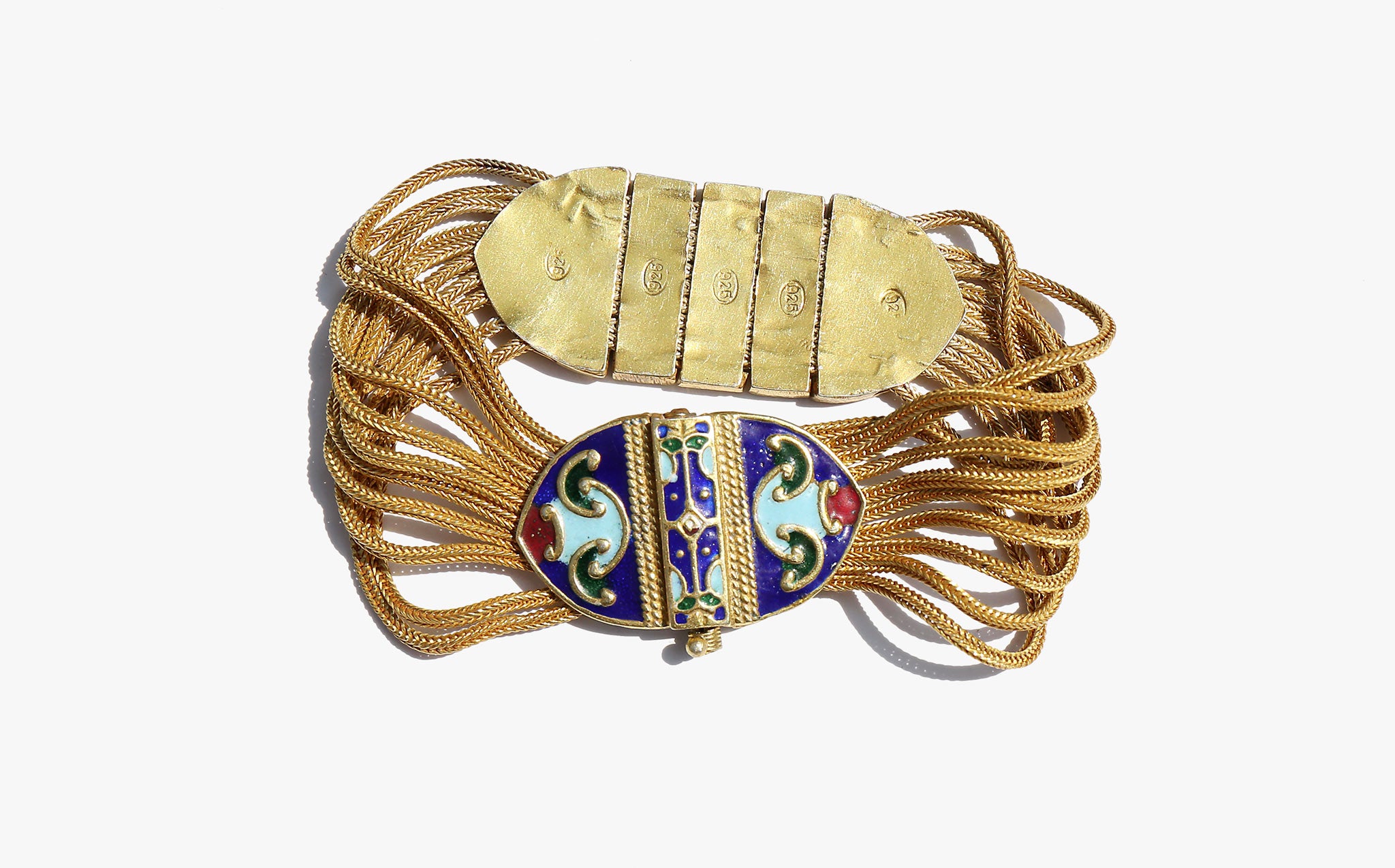 Weighty solid sterling silver bracelet with a gold wash and enamel work.