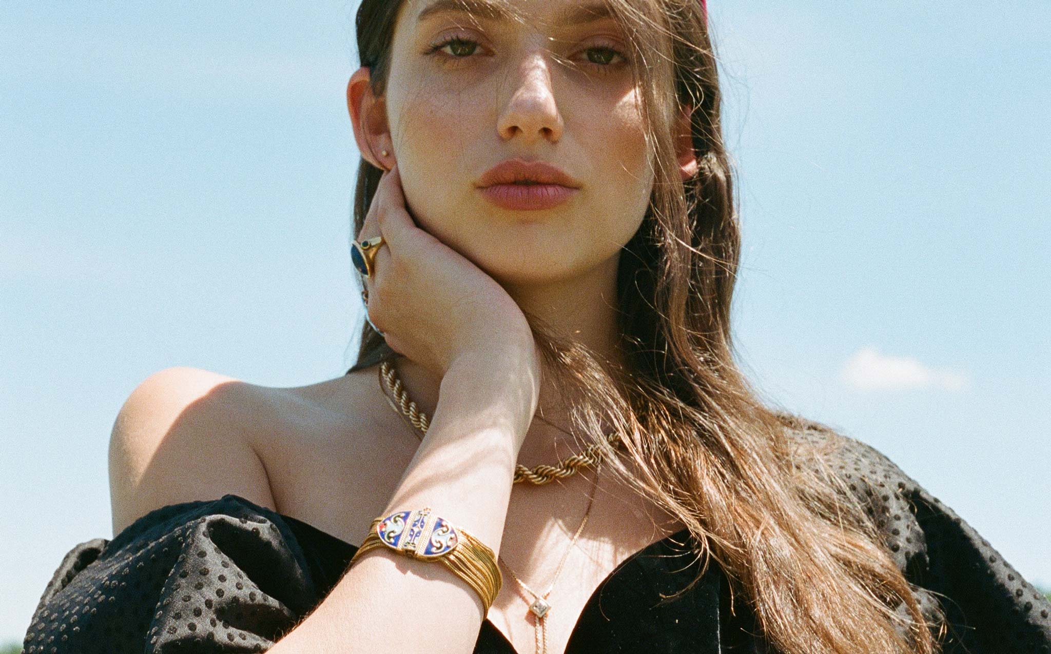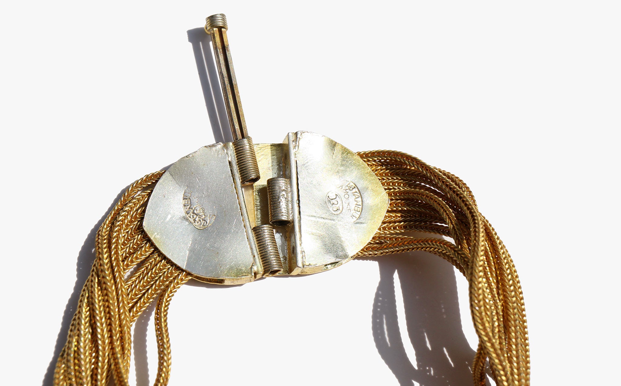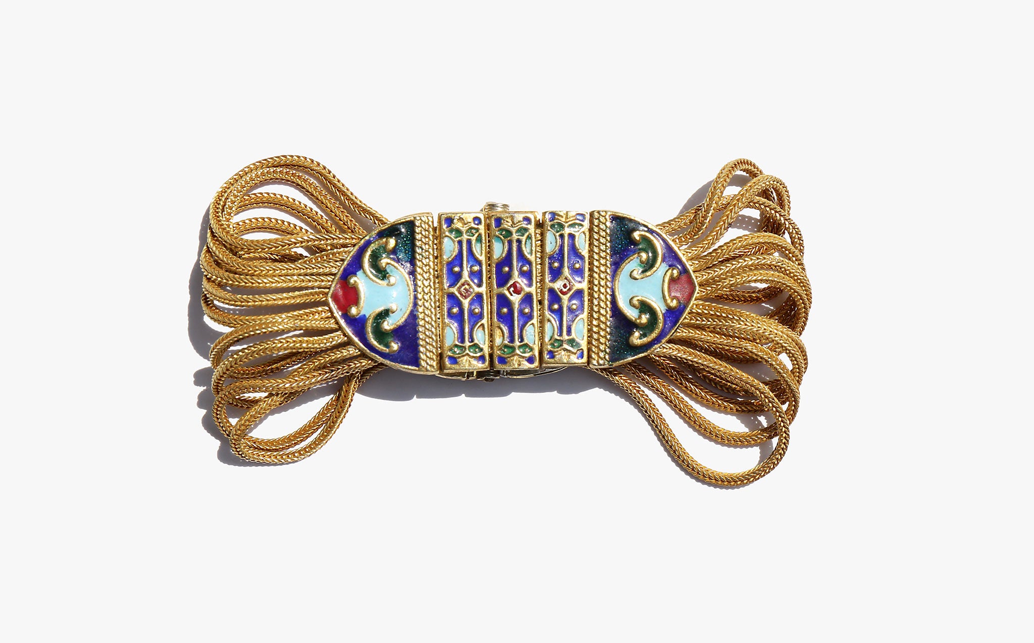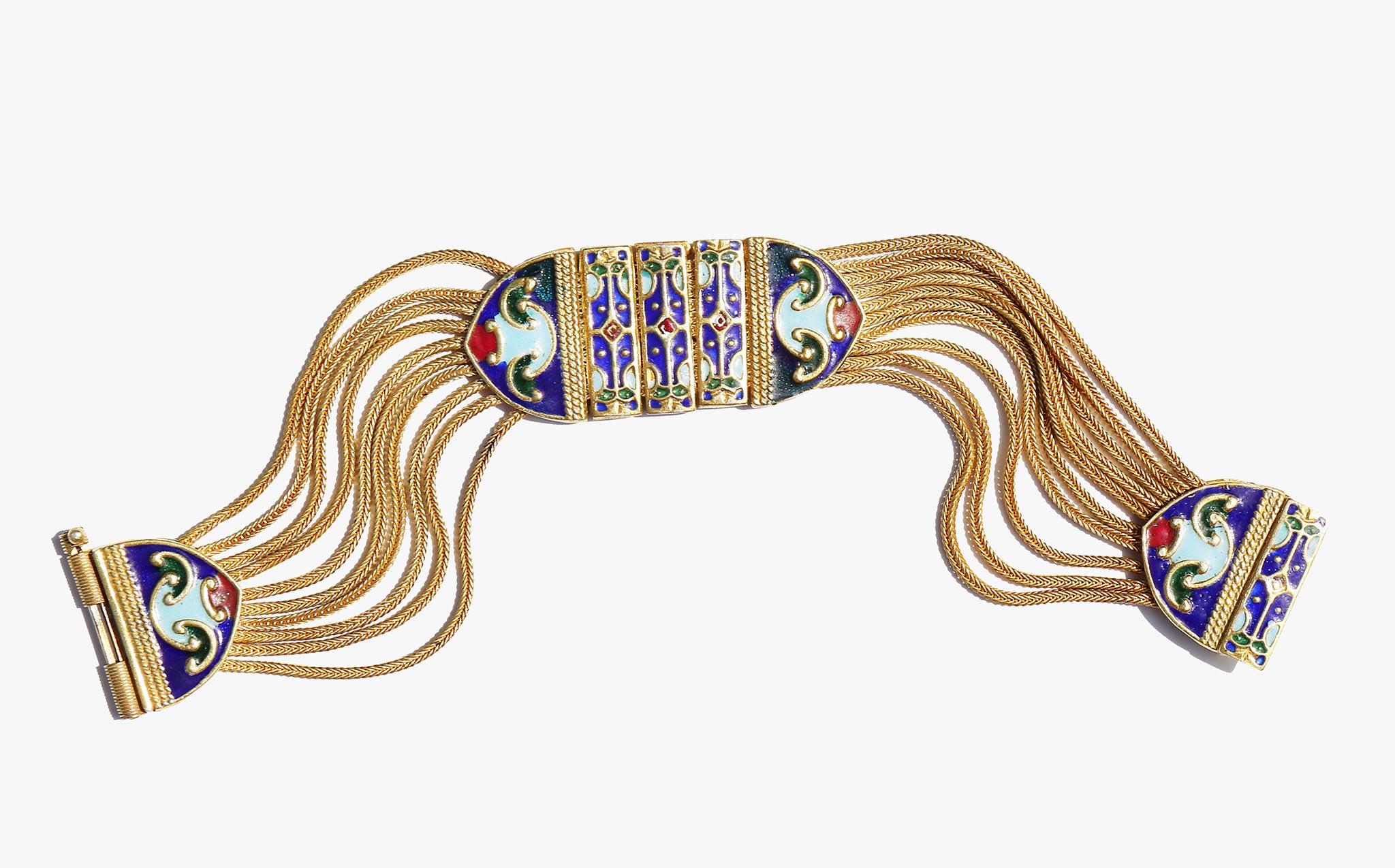 Weighty solid sterling silver bracelet with a gold wash and enamel work.
