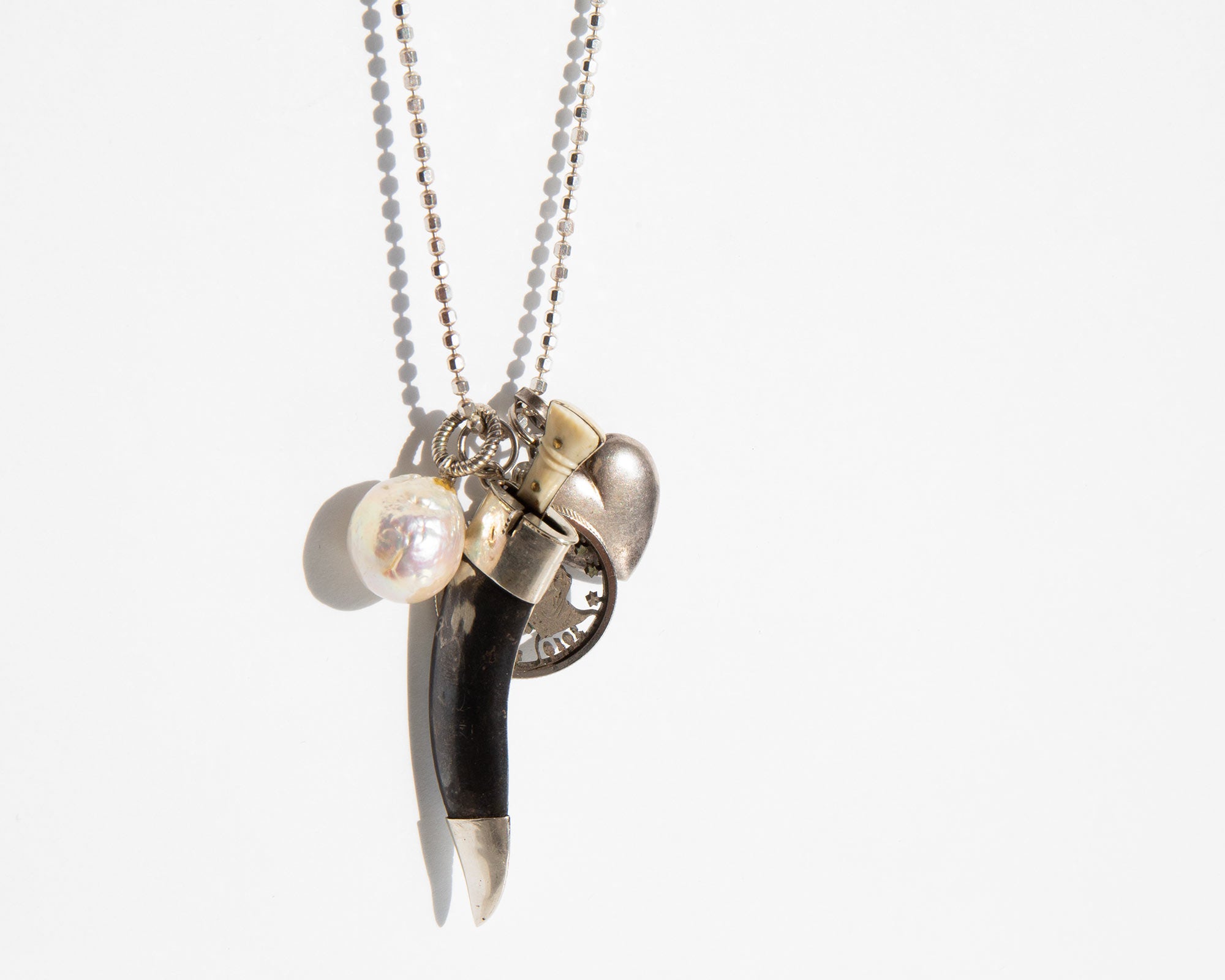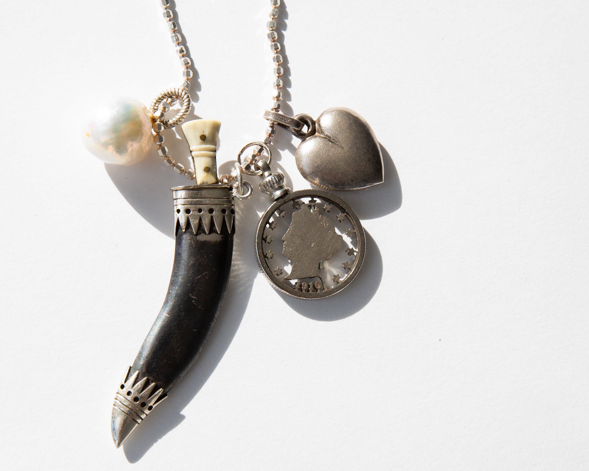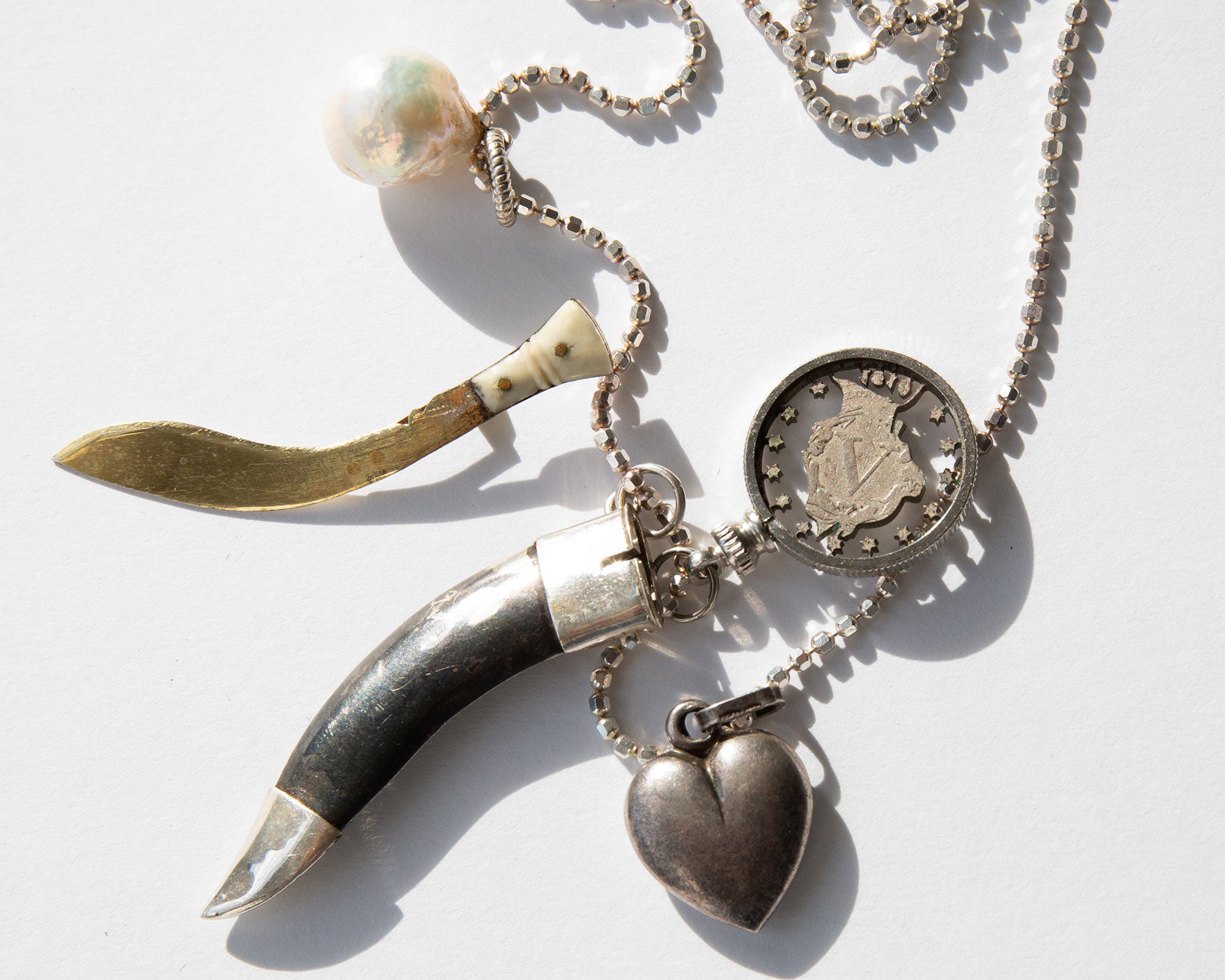 Extra long sterling silver chain with an array of fascinating charms – a liberty head coin, a knife that can come out of its sheath, a mabe pearl, and a sterling silver heart. Chain can be worn long and loose or doubled or tripled for a shorter necklace.