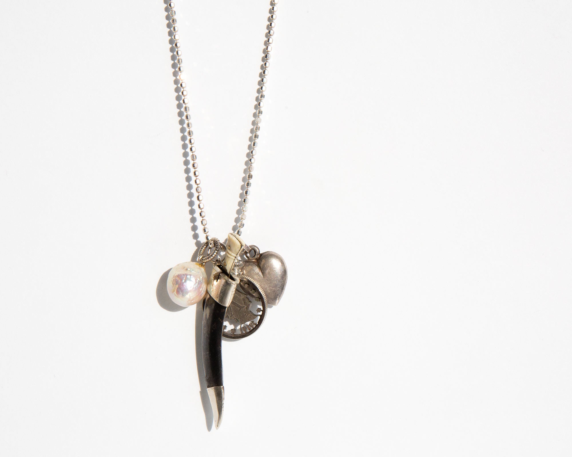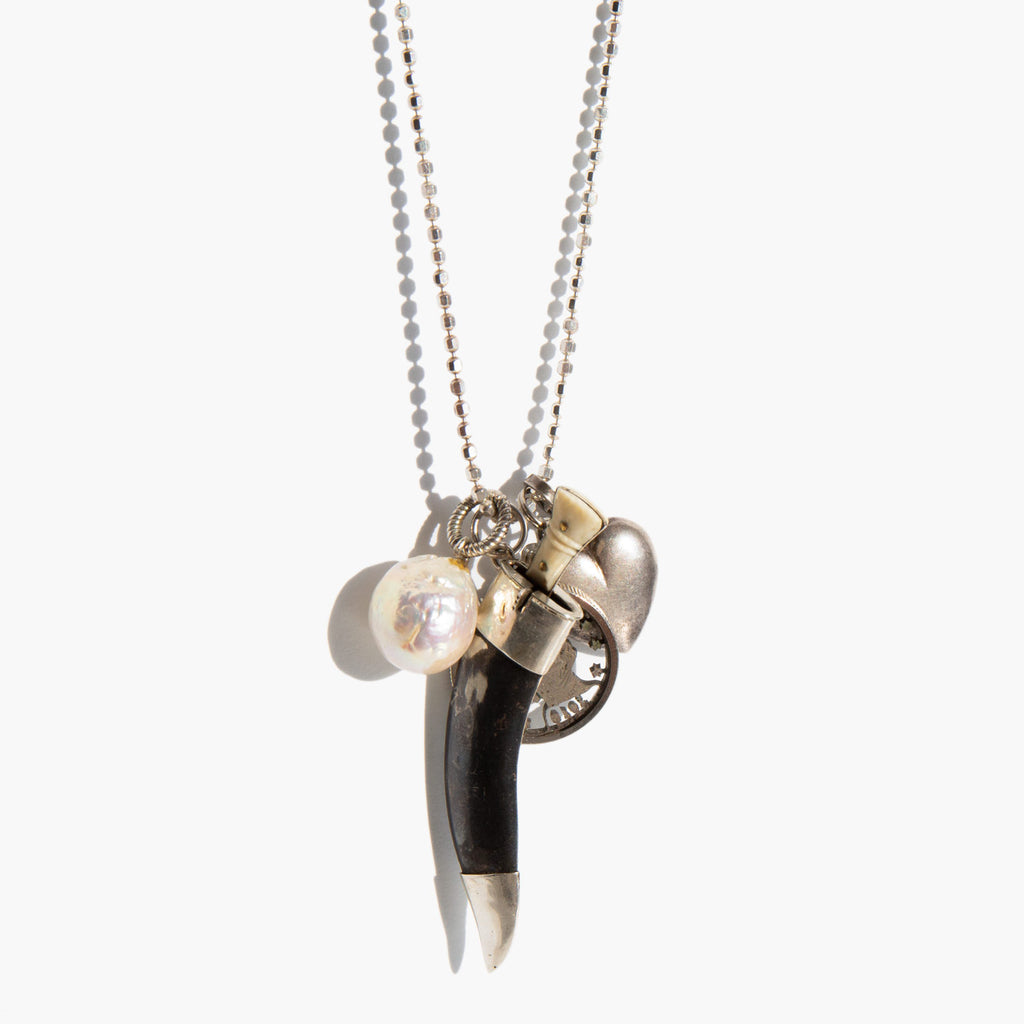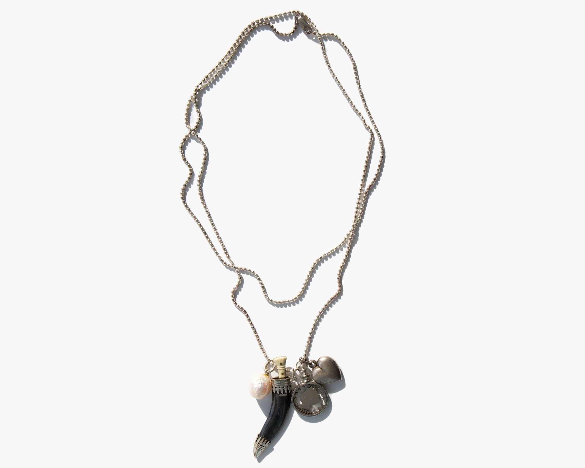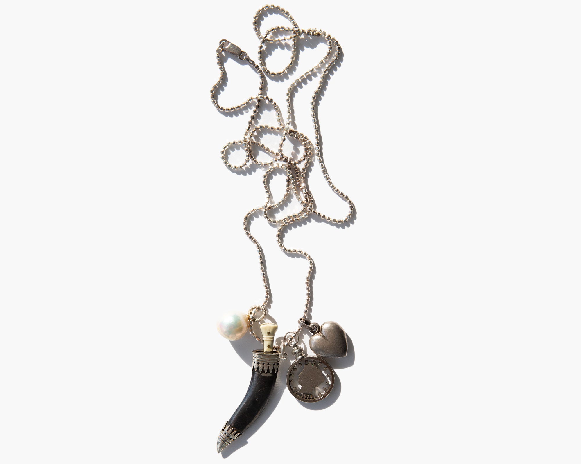 Extra long sterling silver chain with an array of fascinating charms – a liberty head coin, a knife that can come out of its sheath, a mabe pearl, and a sterling silver heart. Chain can be worn long and loose or doubled or tripled for a shorter necklace.