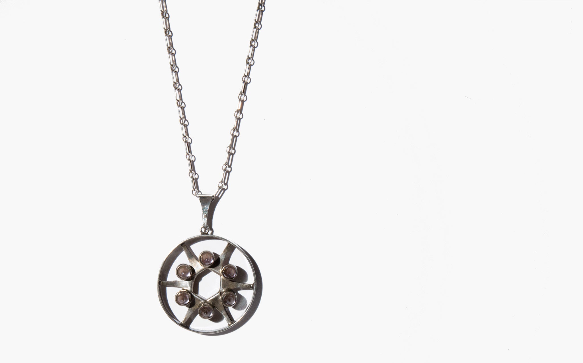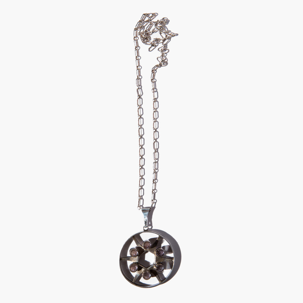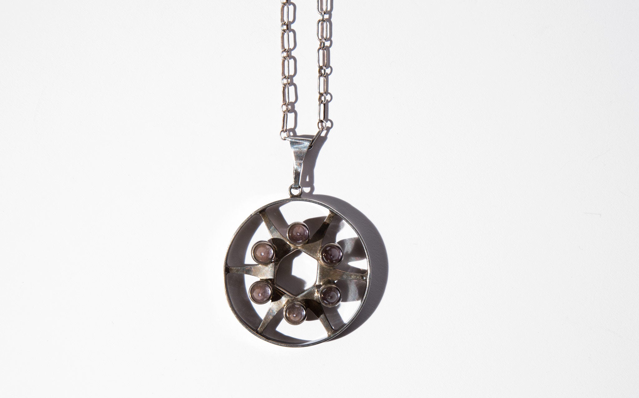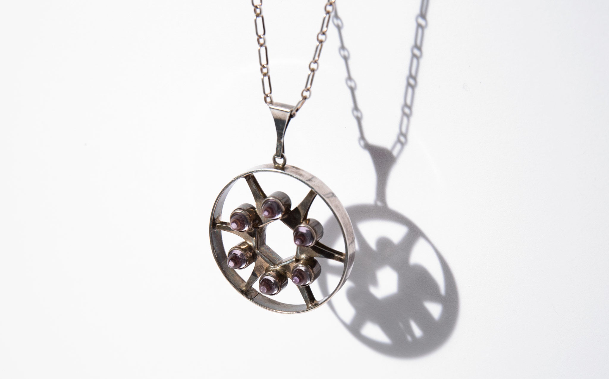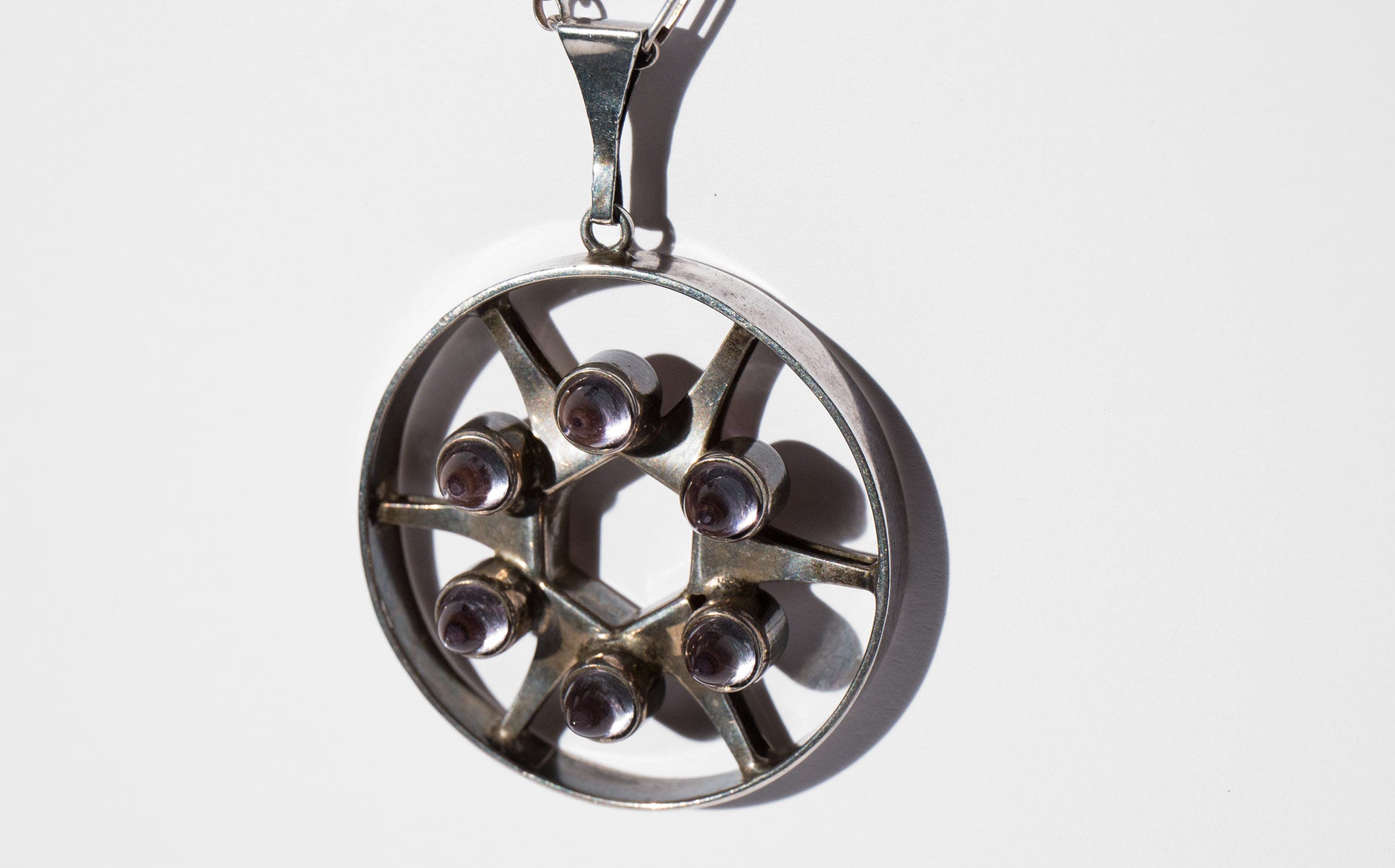Finnish sterling silver and amethyst statement pendant on a sterling silver link chain. A gemstone worn throughout the centuries as a symbol of purity and spirituality, an amulet of protection against evil, and as a talisman of success and wealth, the amethyst is today thought to be grounding, to alleviate stress and headaches, and to help those suffering from bad dreams and night terrors.