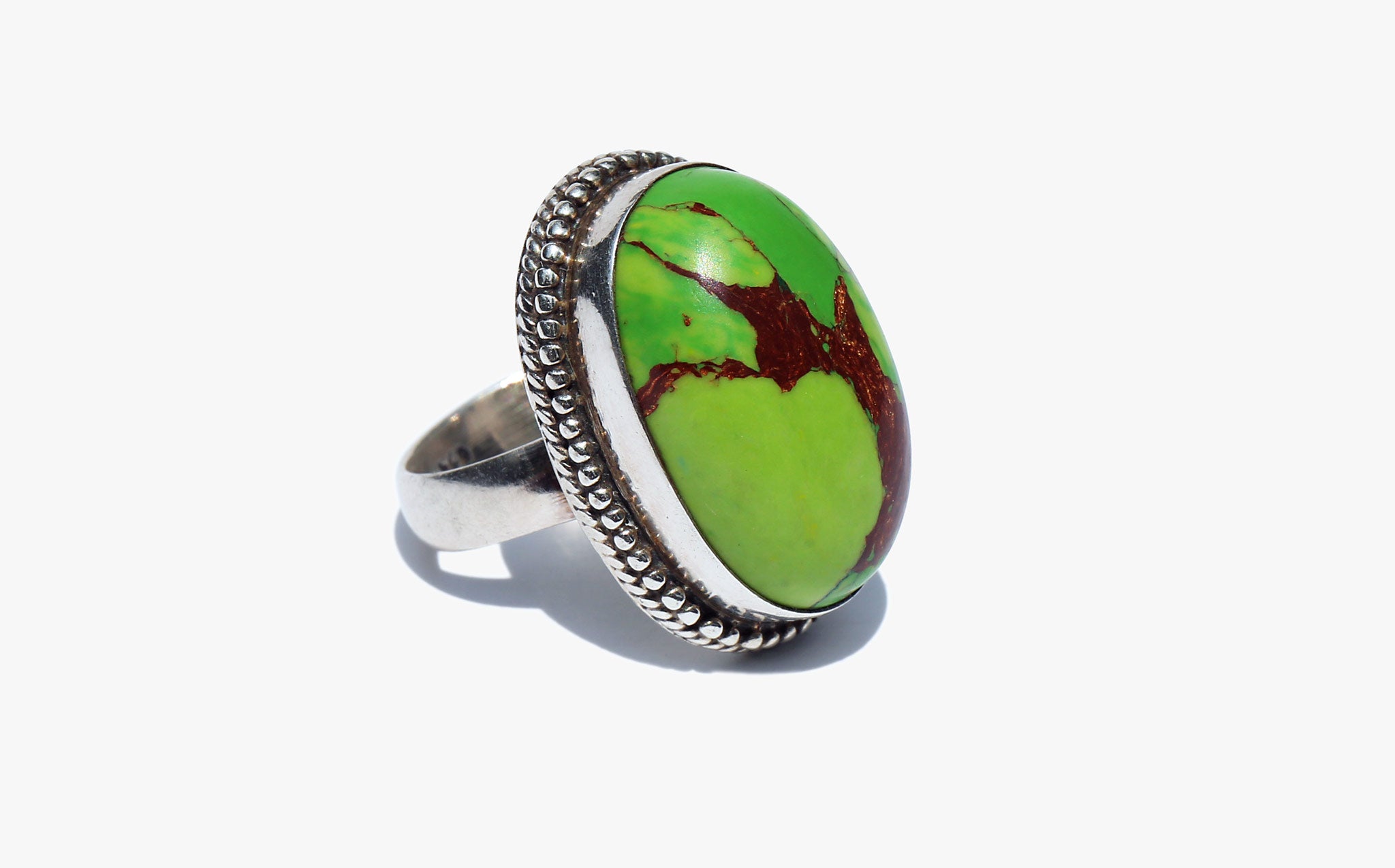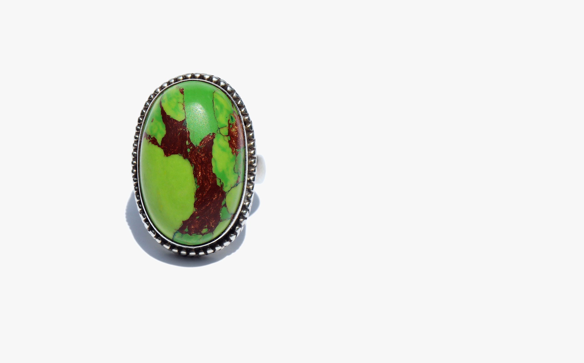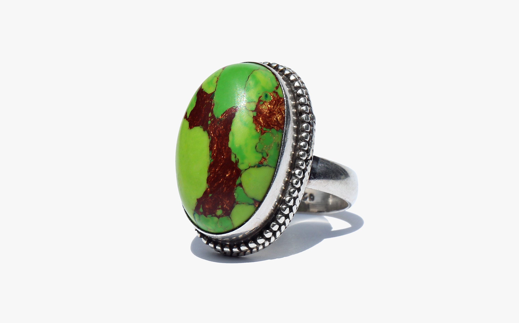 A large eye catching piece of green turquoise with copper veins set in a sterling silver frame. One of the oldest amulets known to humankind, turquoise is said to release negativity to free the mind for other, more productive pursuits.