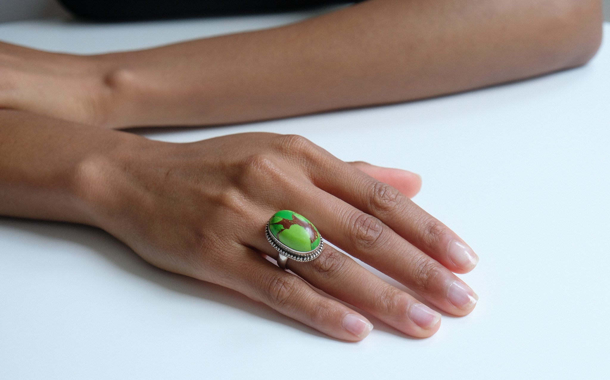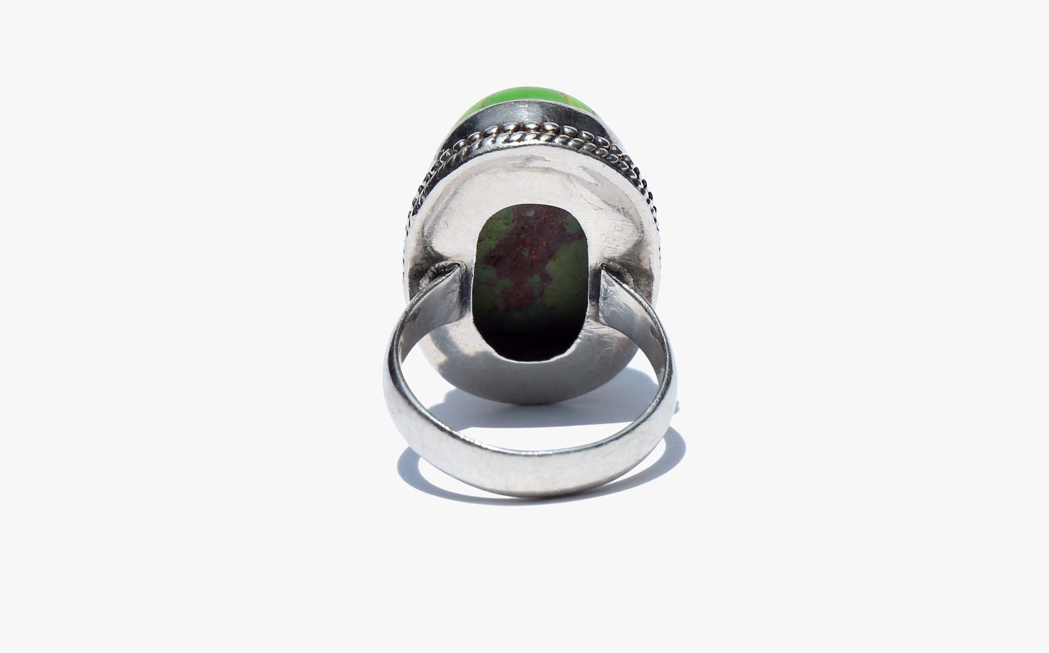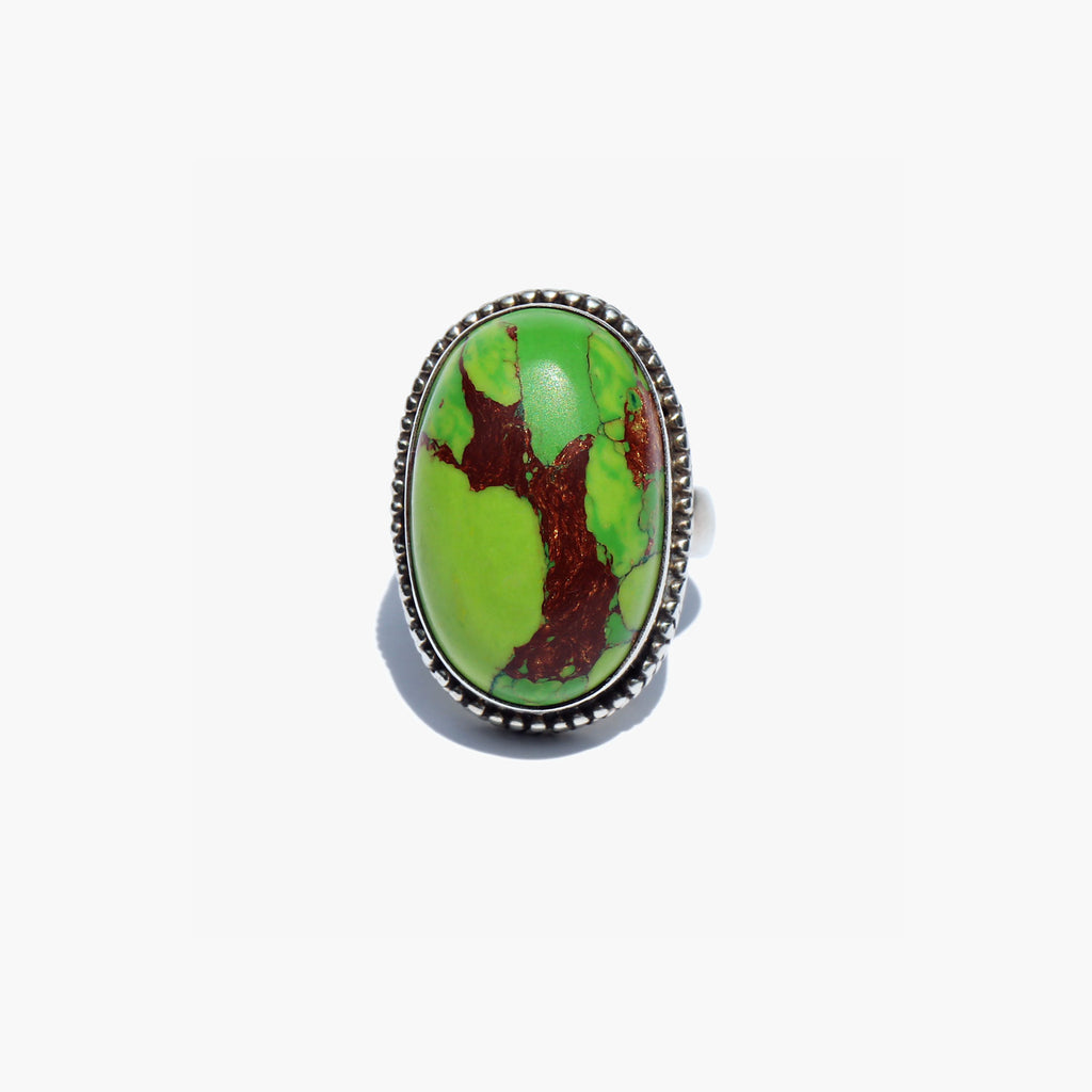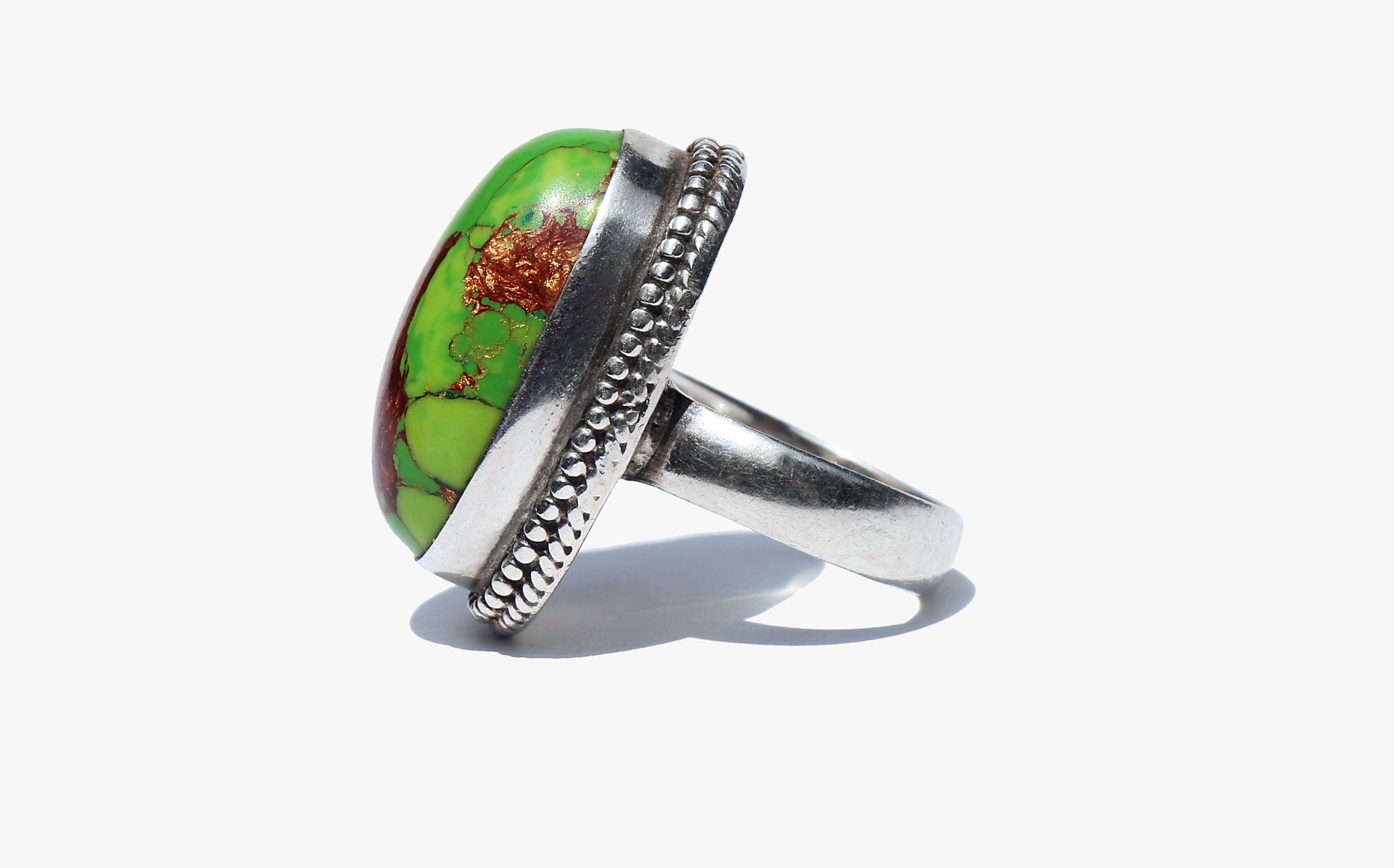 A large eye catching piece of green turquoise with copper veins set in a sterling silver frame. One of the oldest amulets known to humankind, turquoise is said to release negativity to free the mind for other, more productive pursuits.