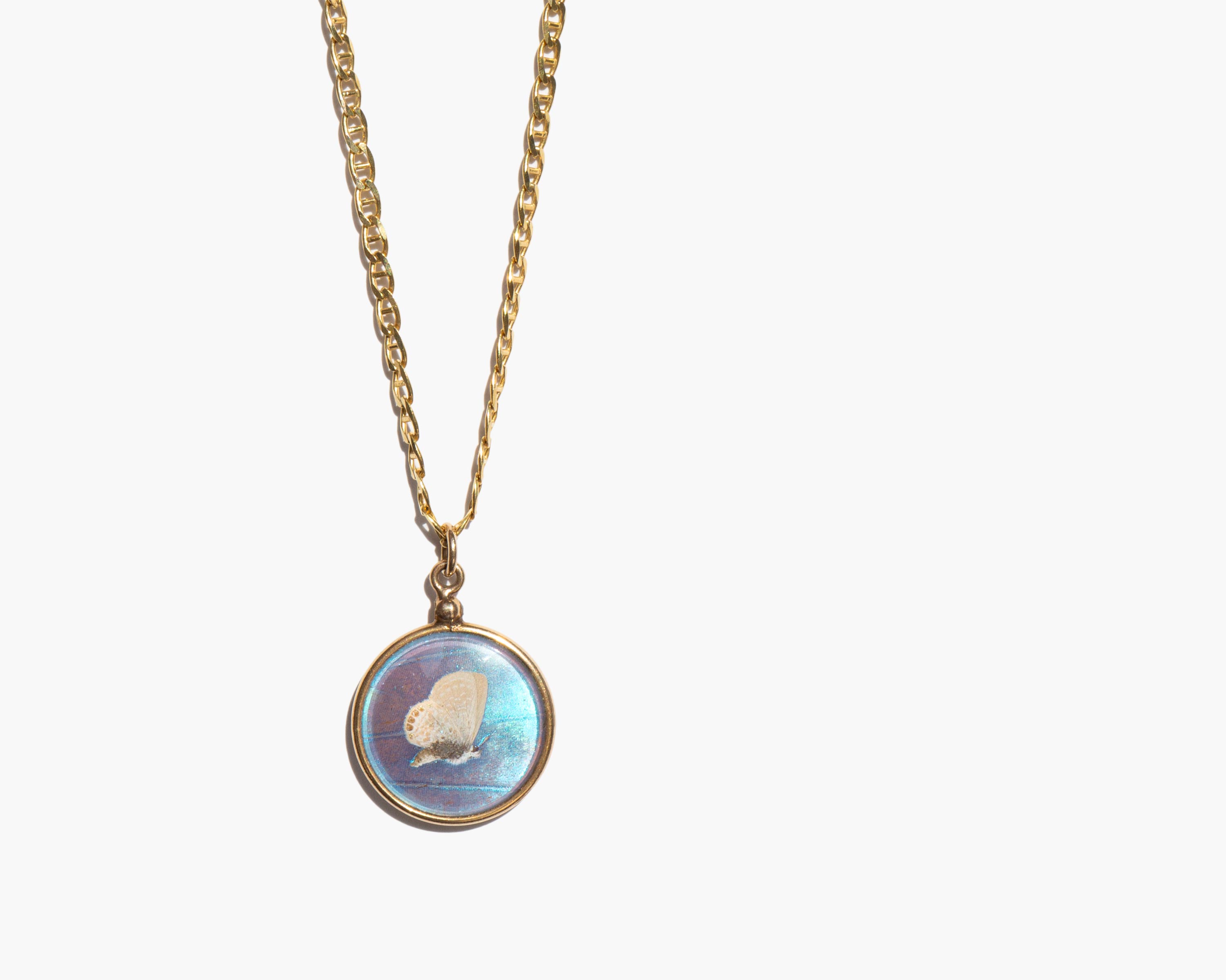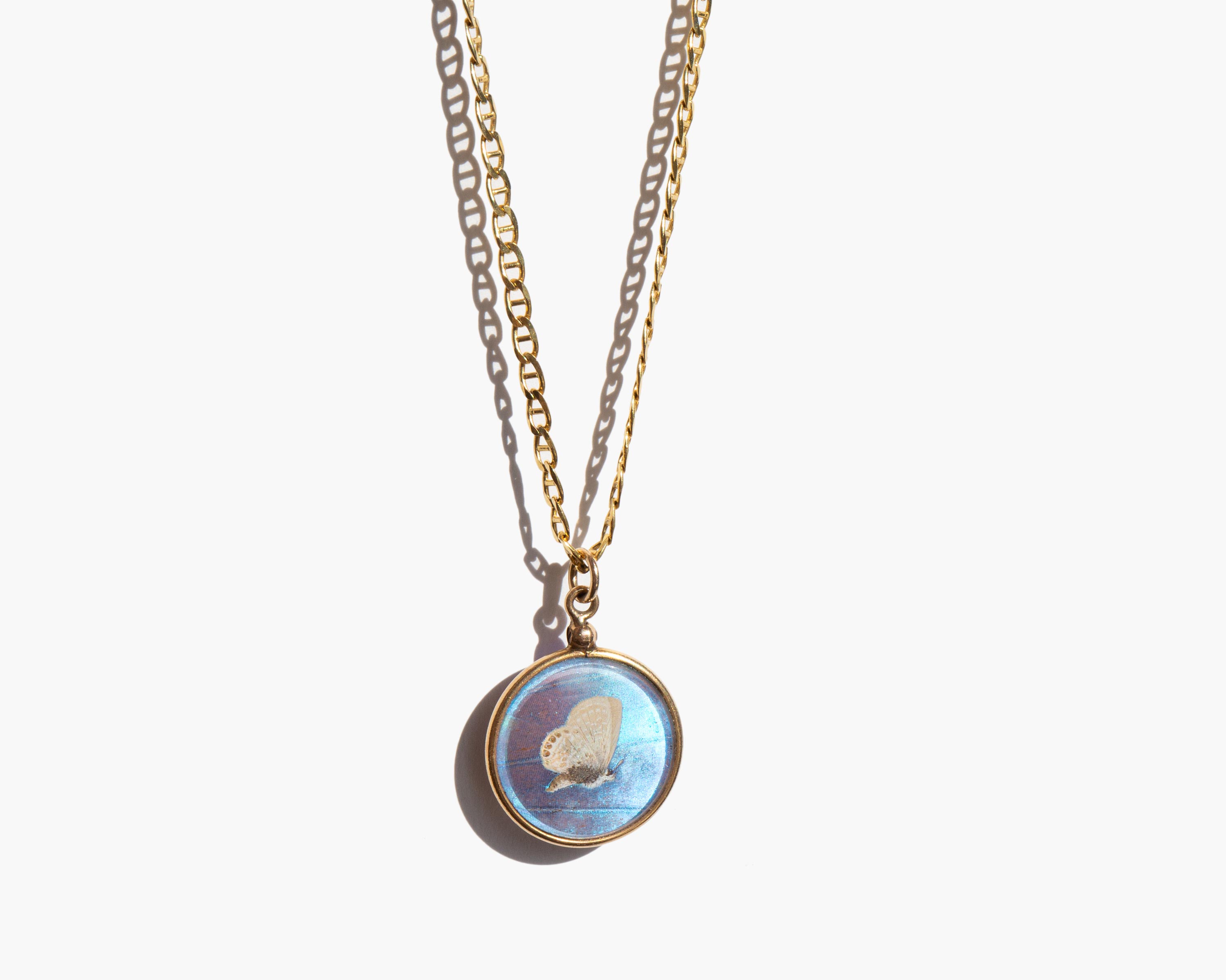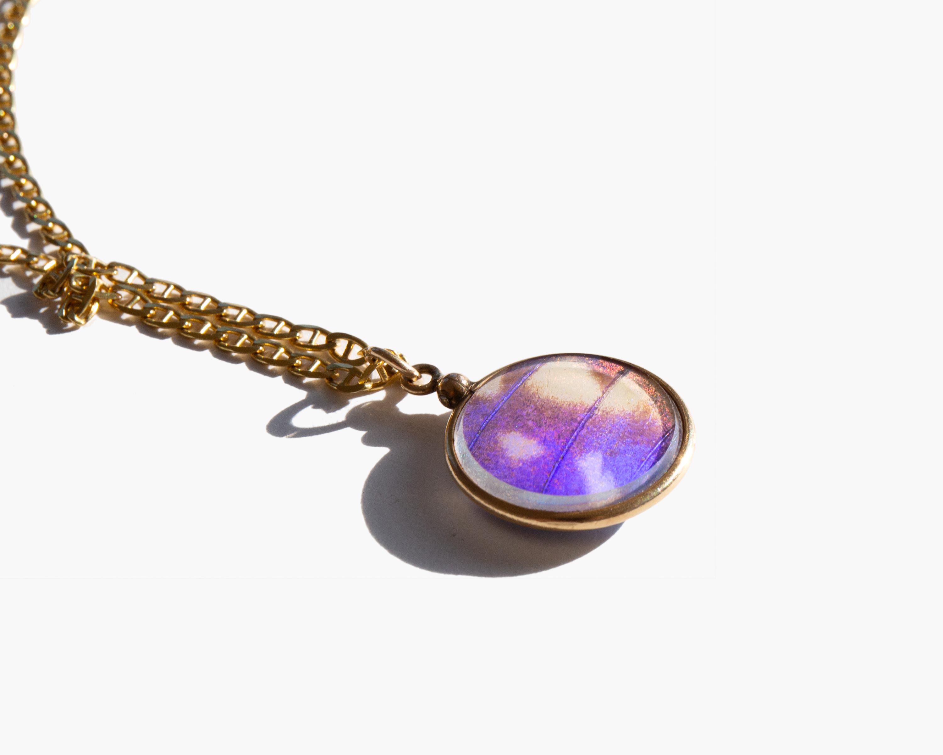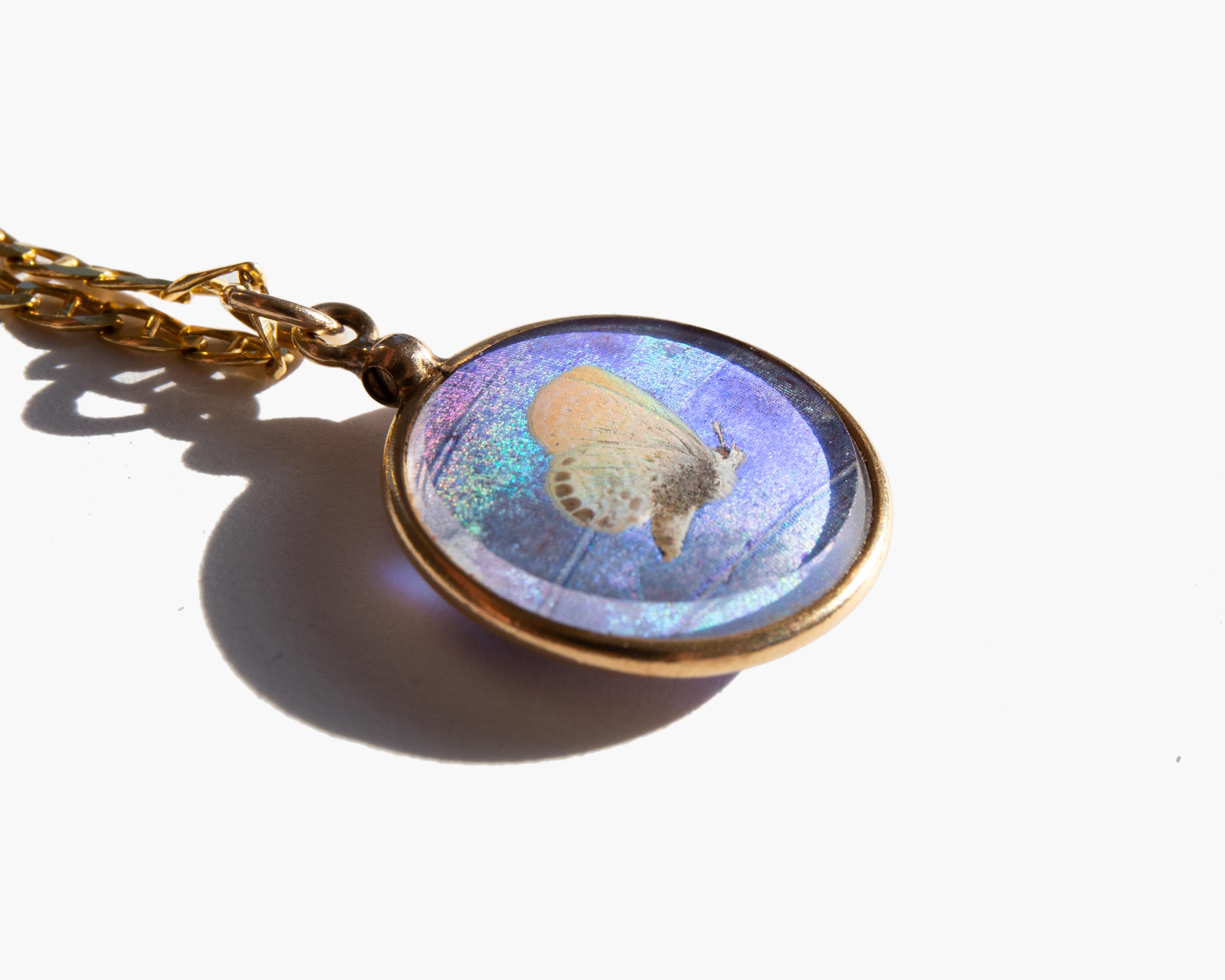 Antique Victorian 14k gold pendant with beautiful iridescence and a butterfly wing encased in the glass.