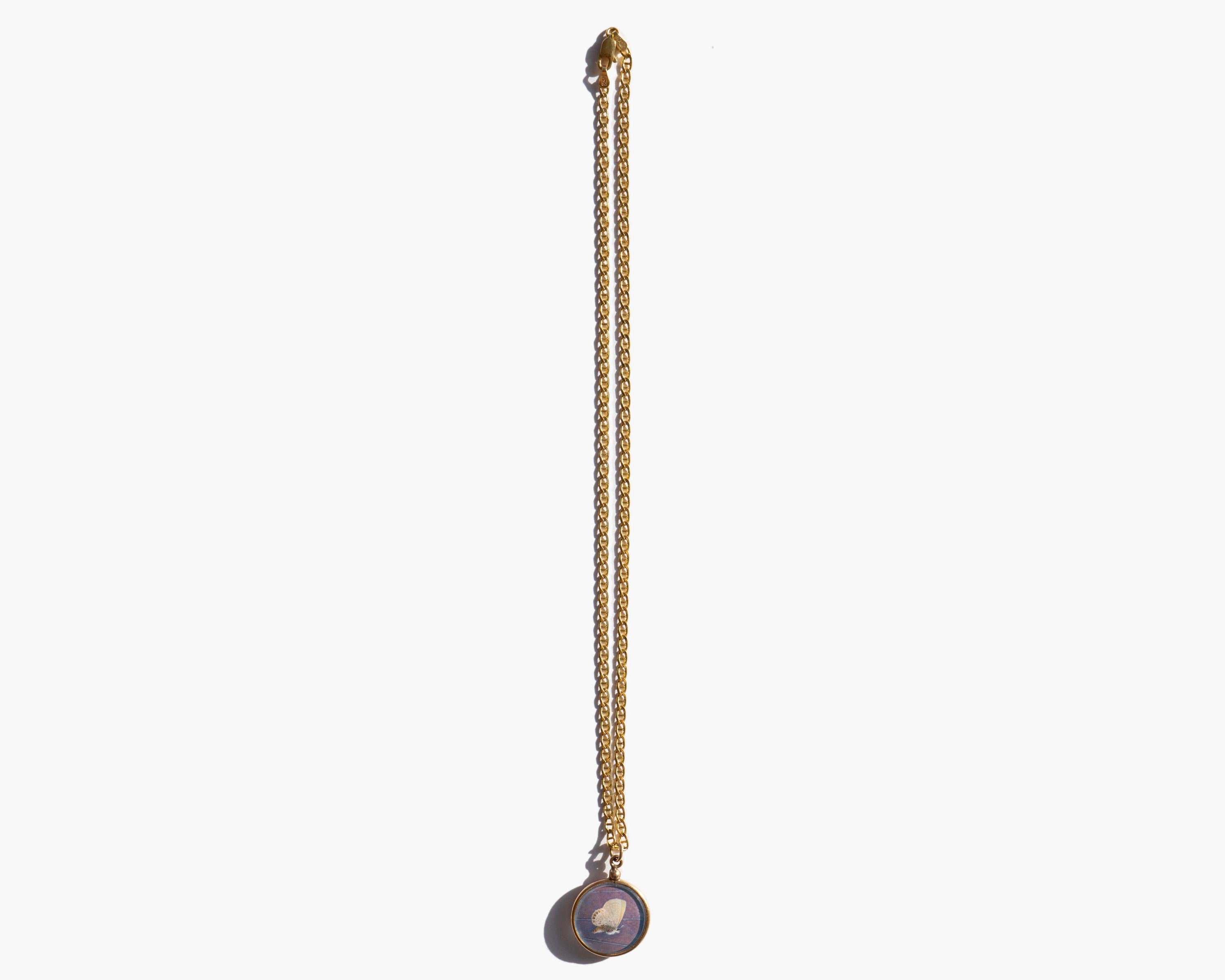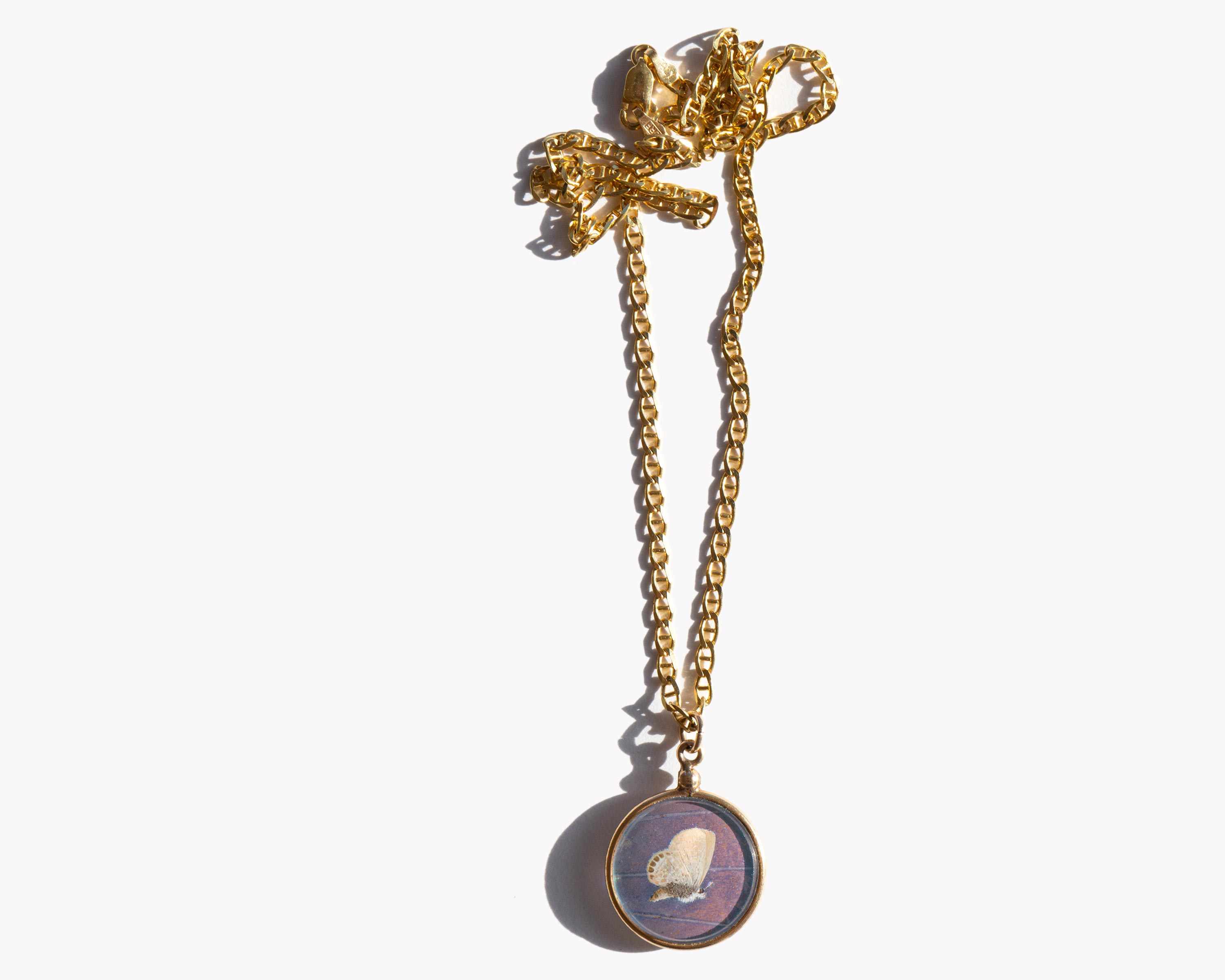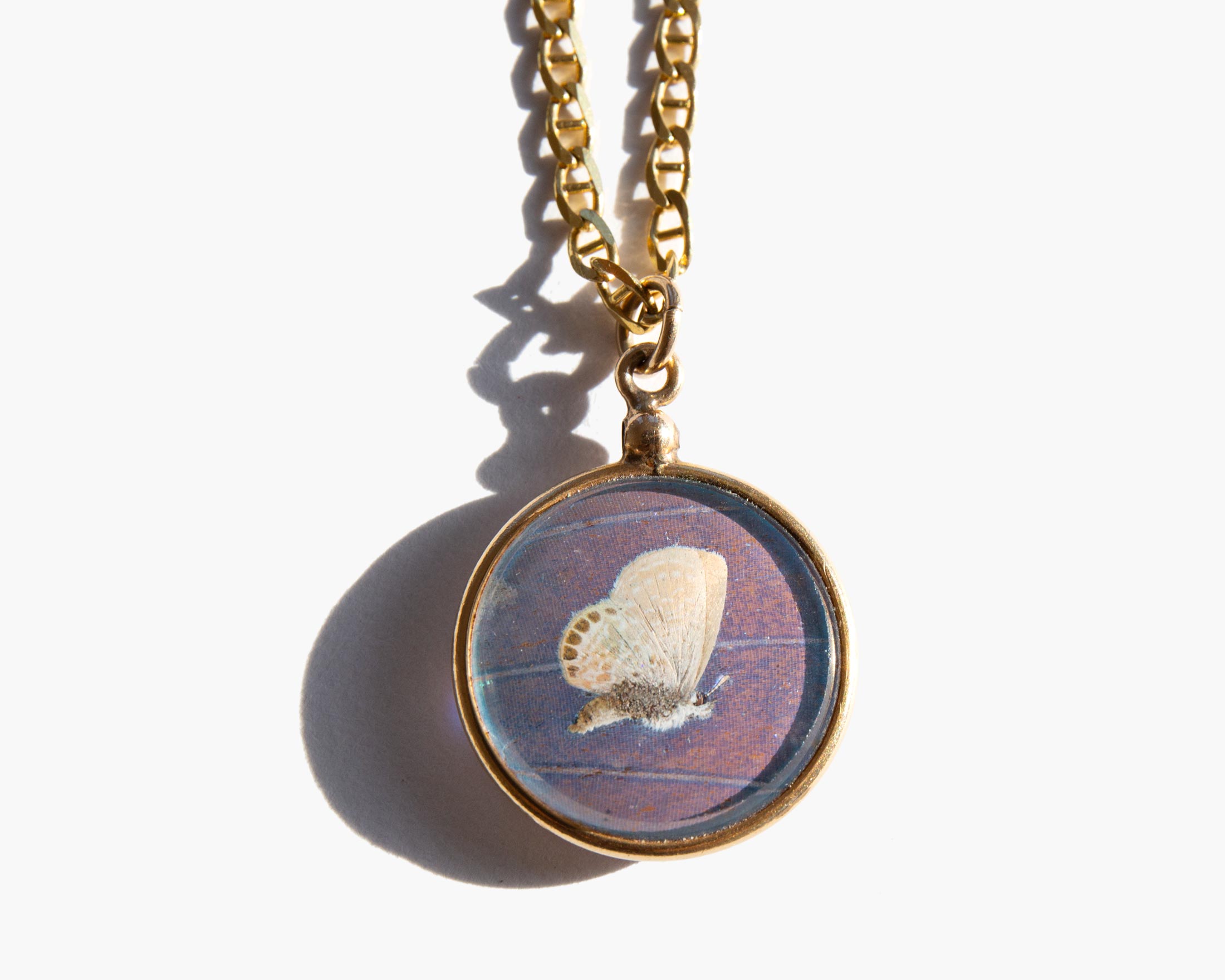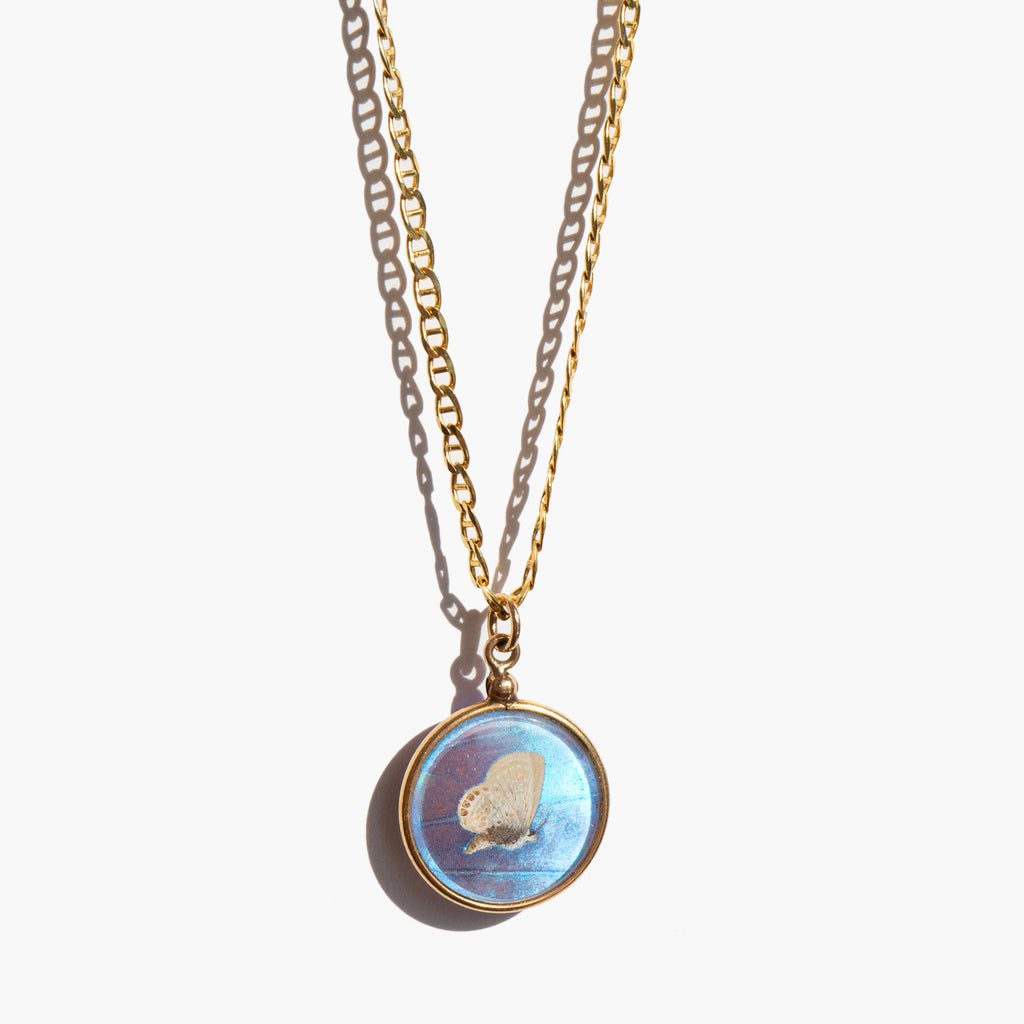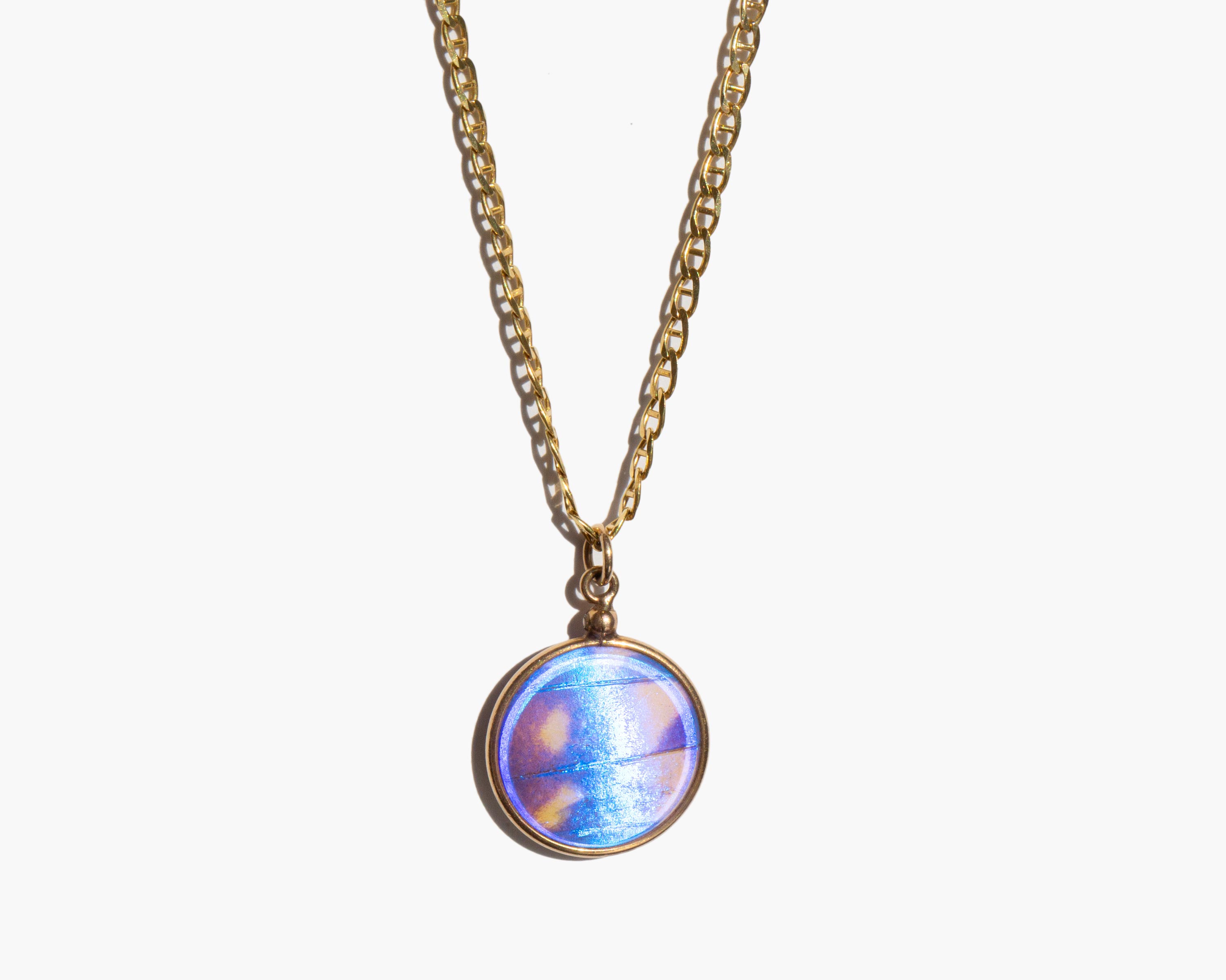 Antique Victorian 14k gold pendant with beautiful iridescence and a butterfly wing encased in the glass.
