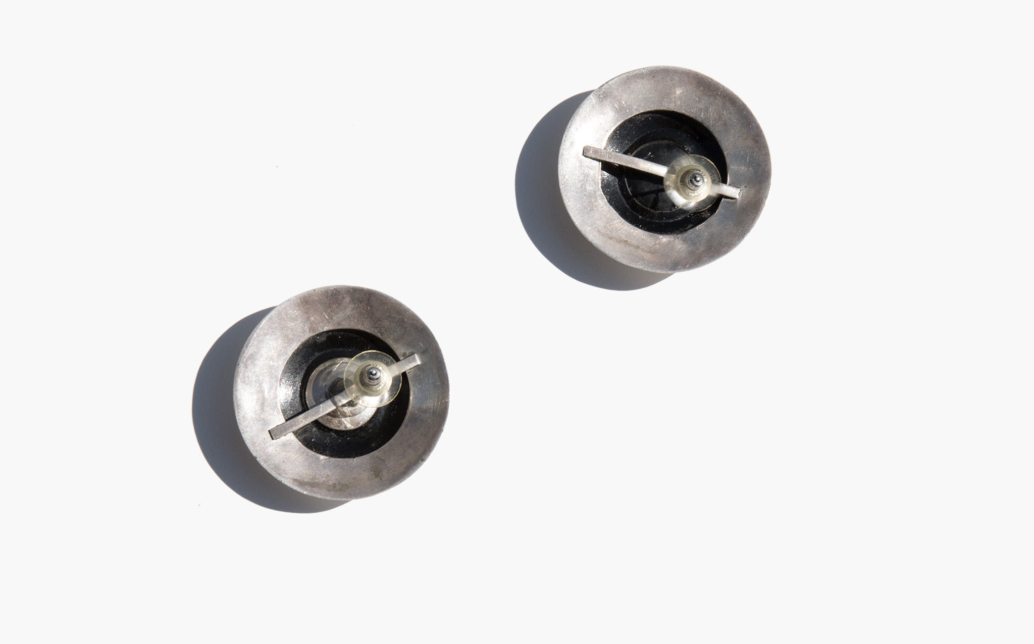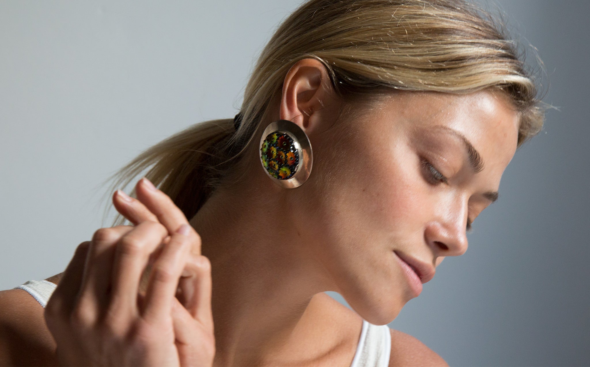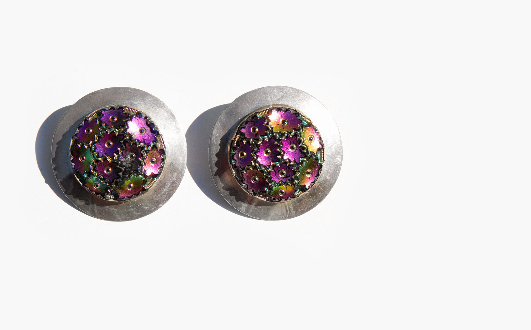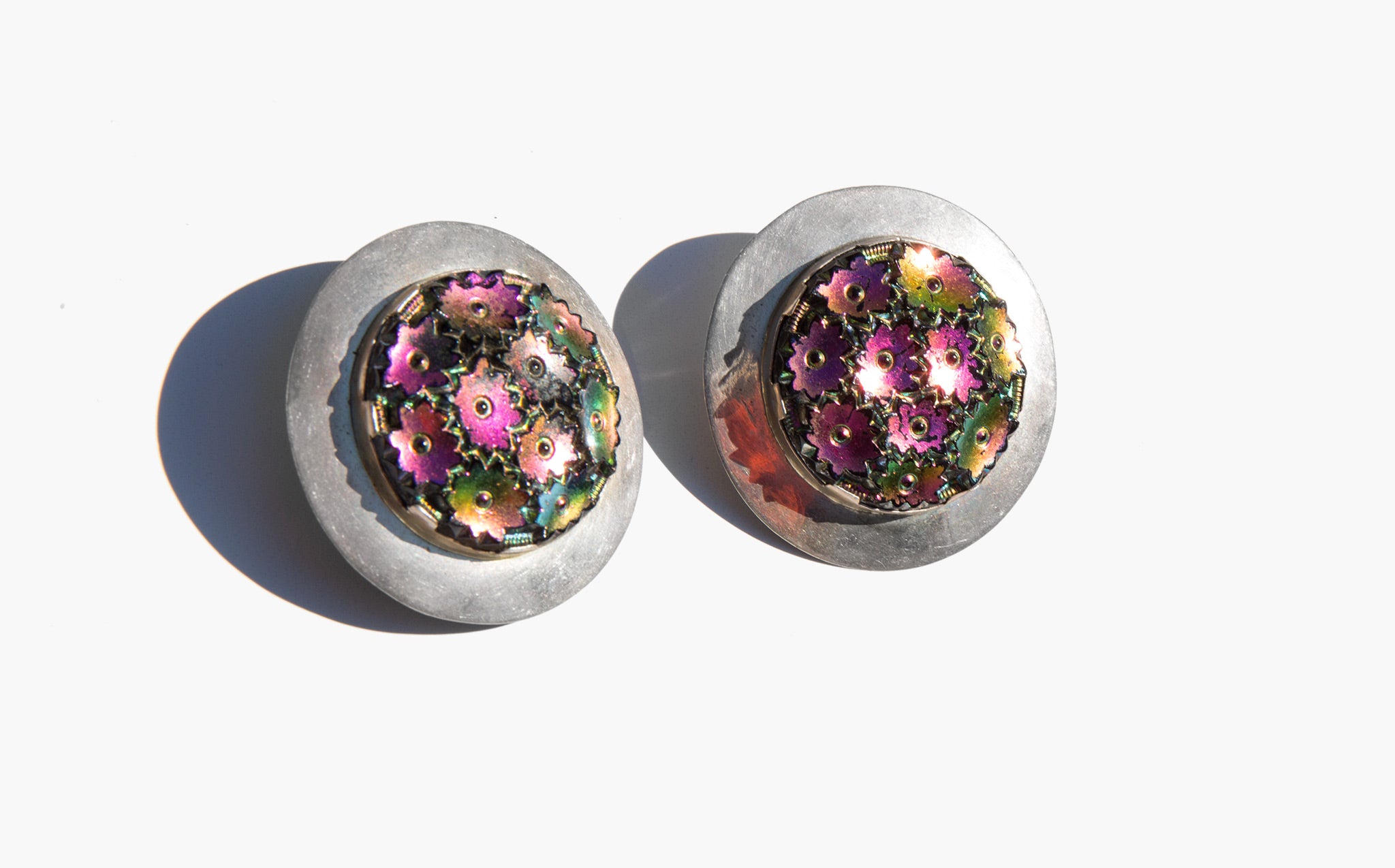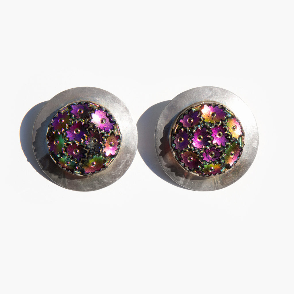 Handmade sterling silver statement earrings with colorful, iridescent metallic floral accents.