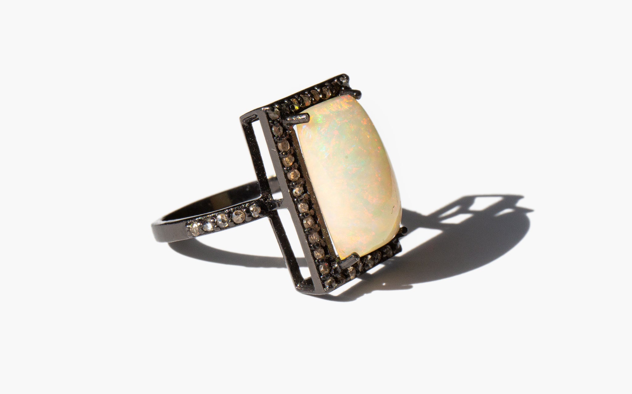 Golden iridescent Ethiopian opal with sherbet-hues of orange, pink, and lime set in black rhodium plated sterling silver and surrounded with accent diamonds.