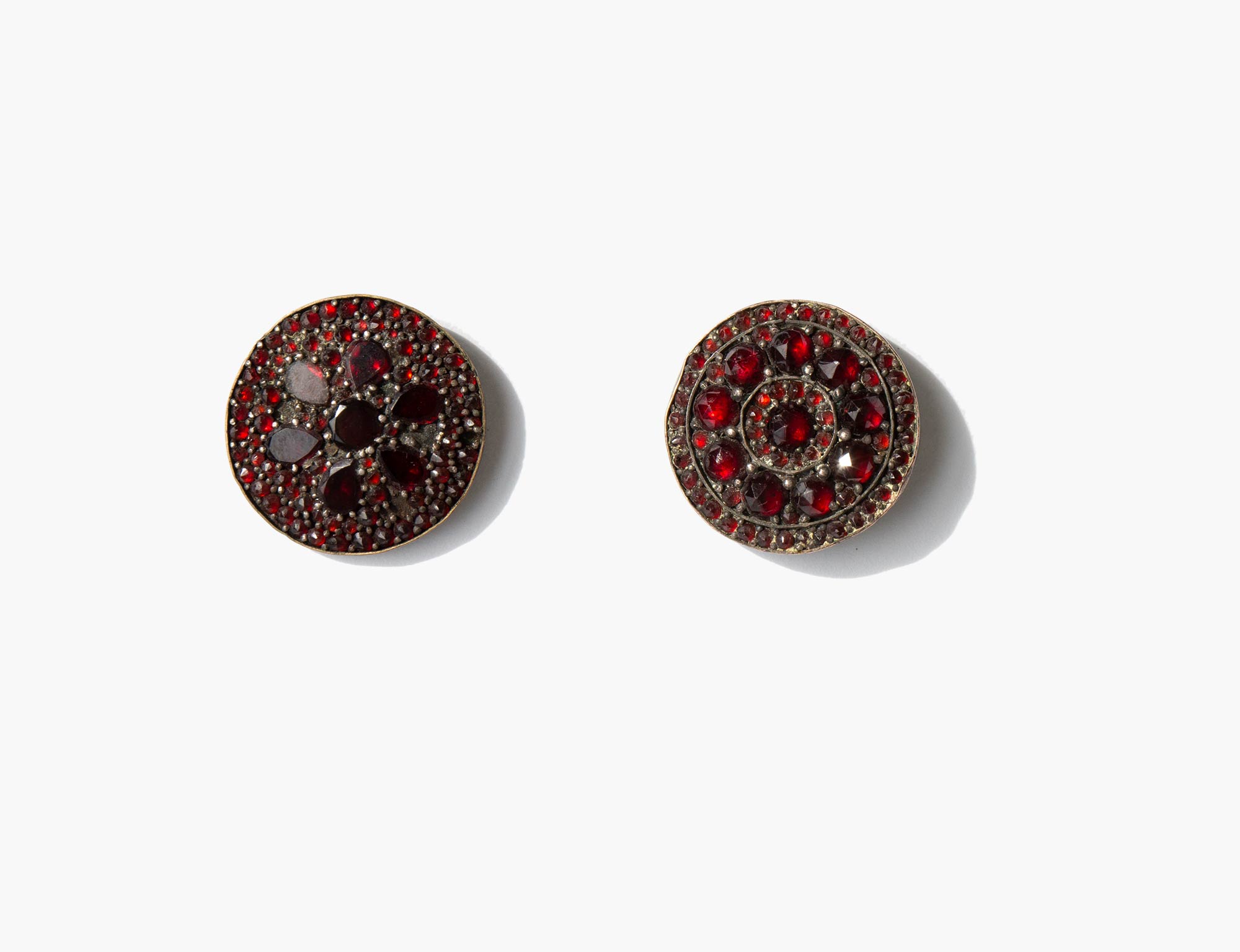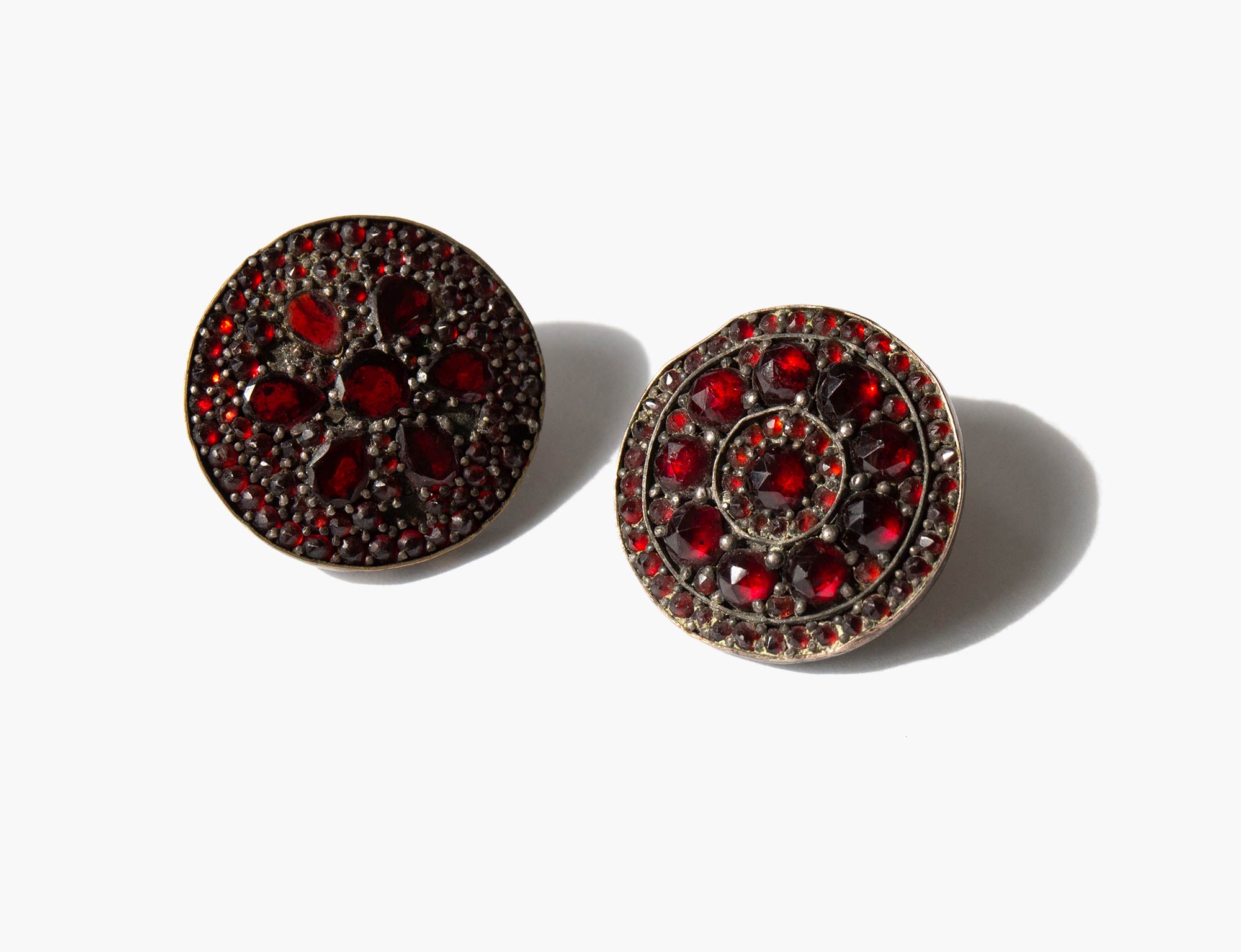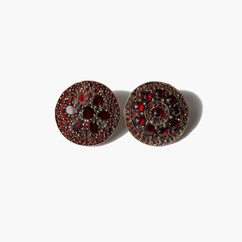 Antique earrings handmade from sterling silver and garnet buttons.
