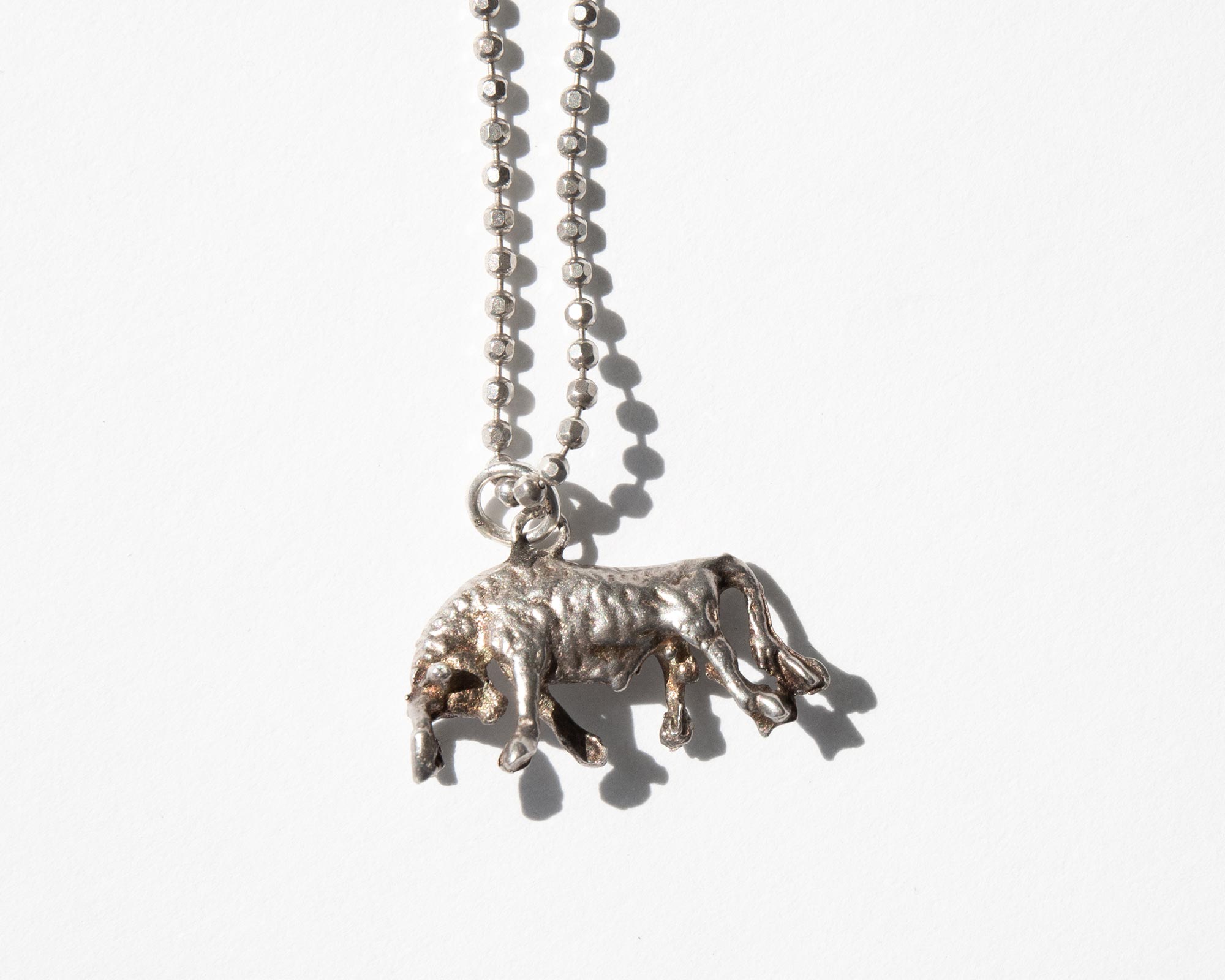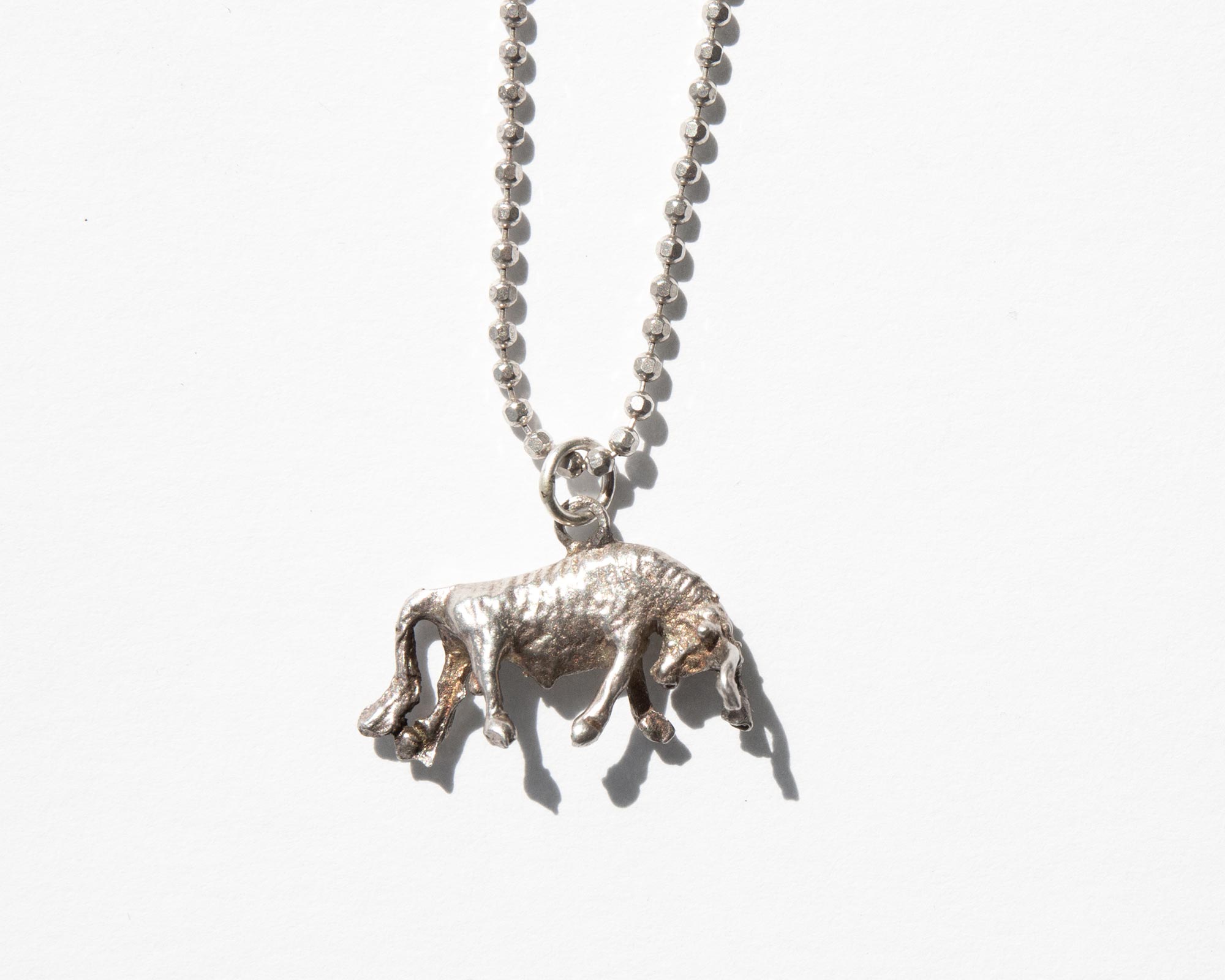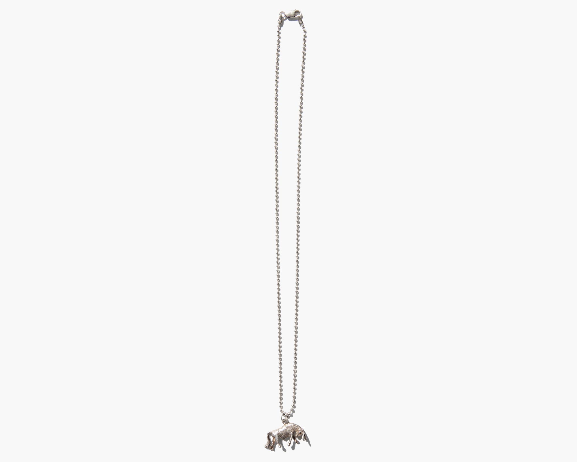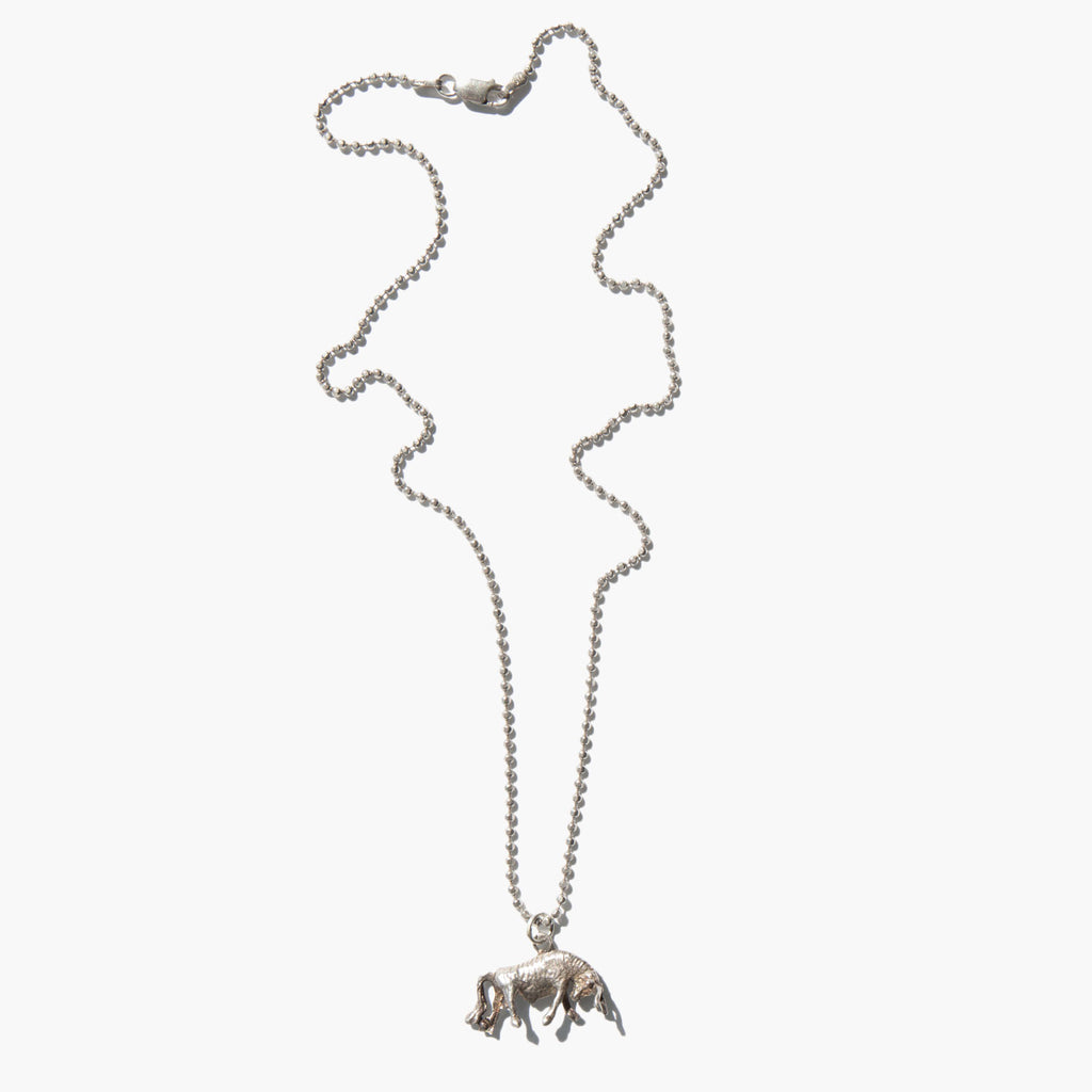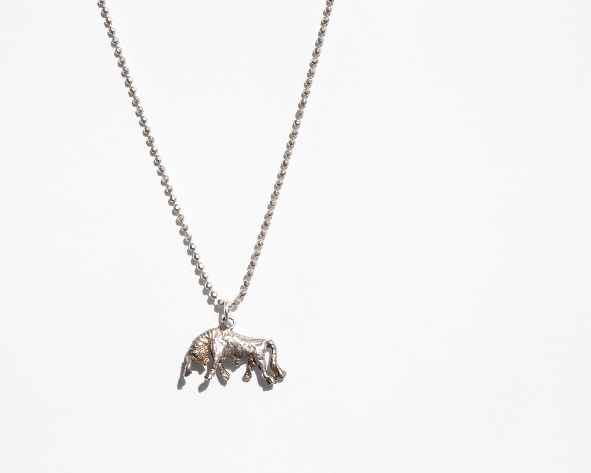 Sterling silver bull pendant on sterling silver ball chain. At its core, the bull is an embodiment of a strong will and an uncompromising nature but in some traditions, the animal is also a symbol of sexual vigor and stamina.