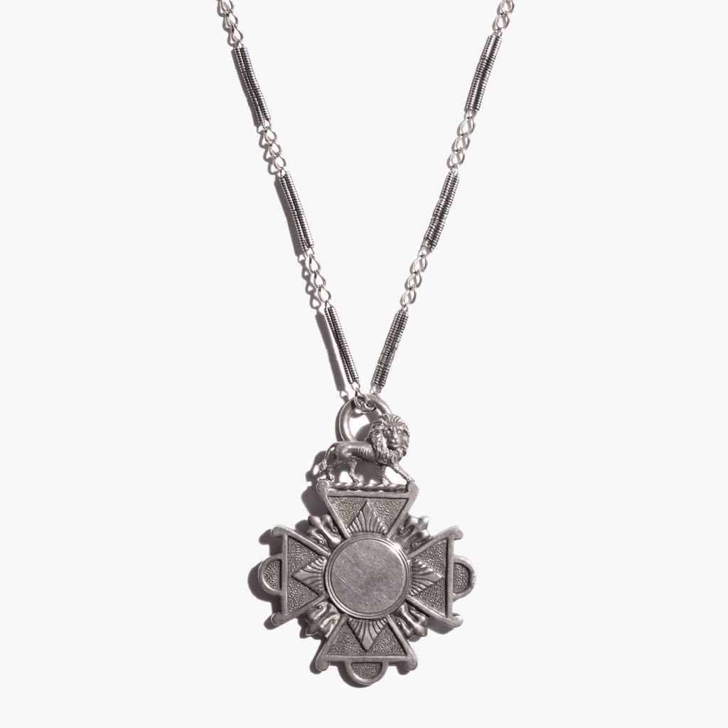 Antique sterling silver converted niello watch chain with a large and weighty antique sterling silver lion medal circa 1865. An amazing and unusual statement piece.