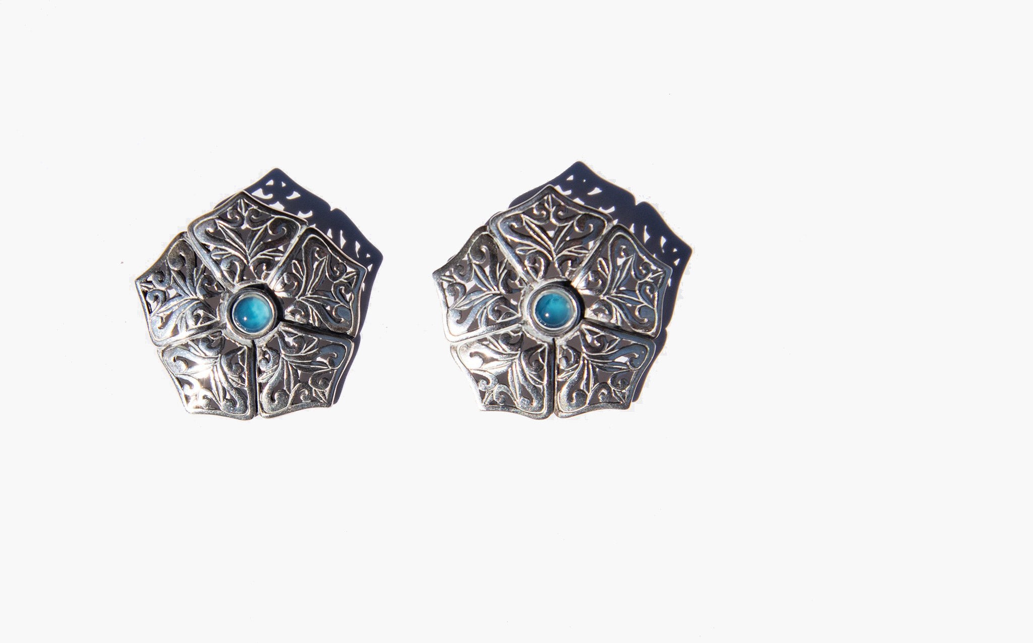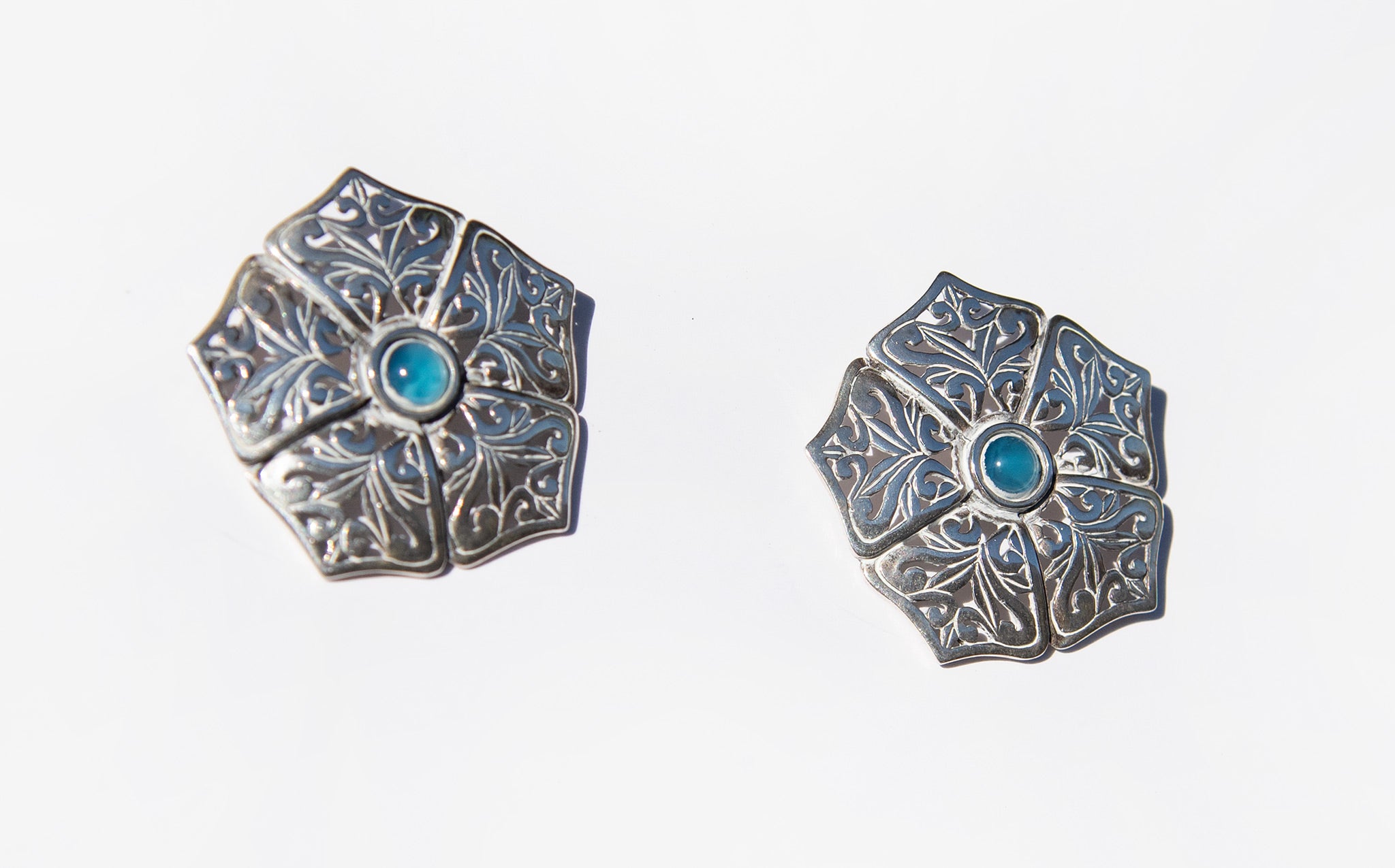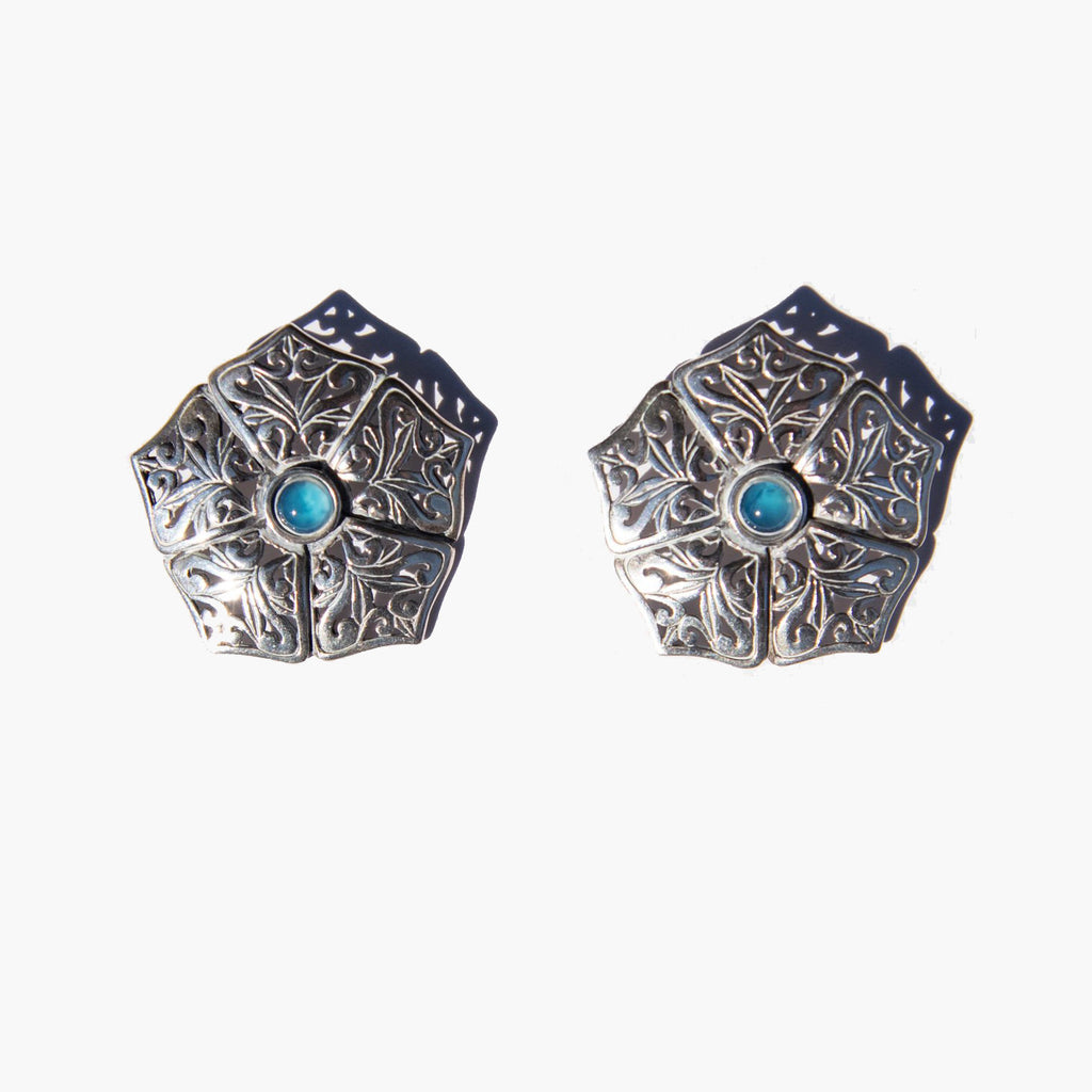 Intricate sterling silver flower earrings with a striking aqua glass cabochon center.