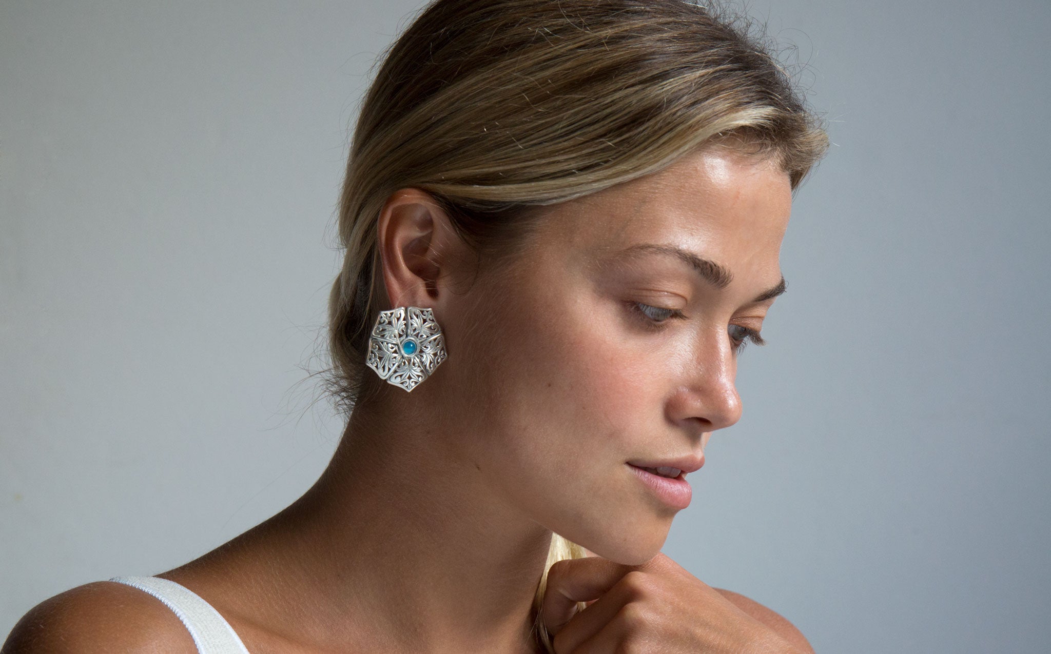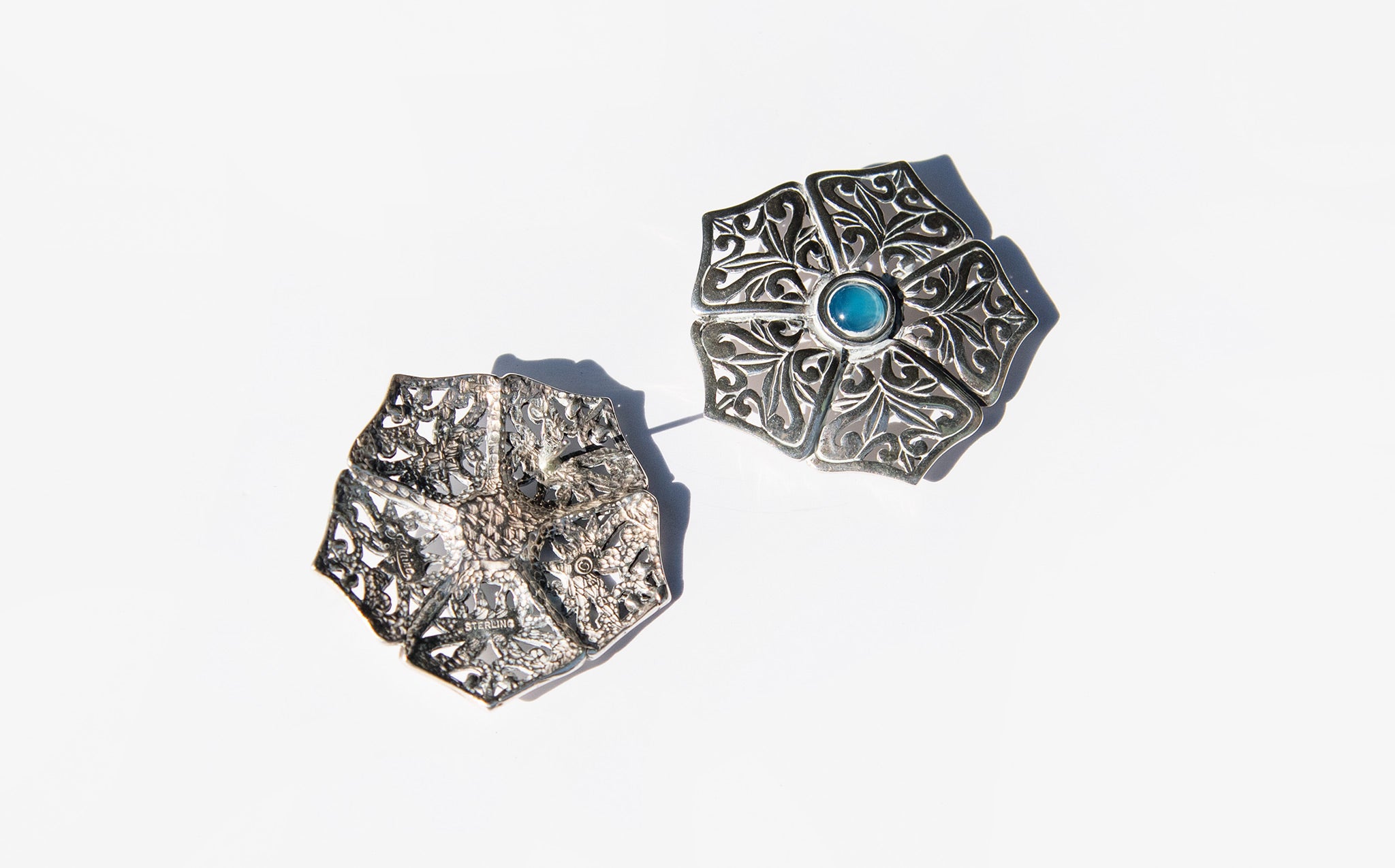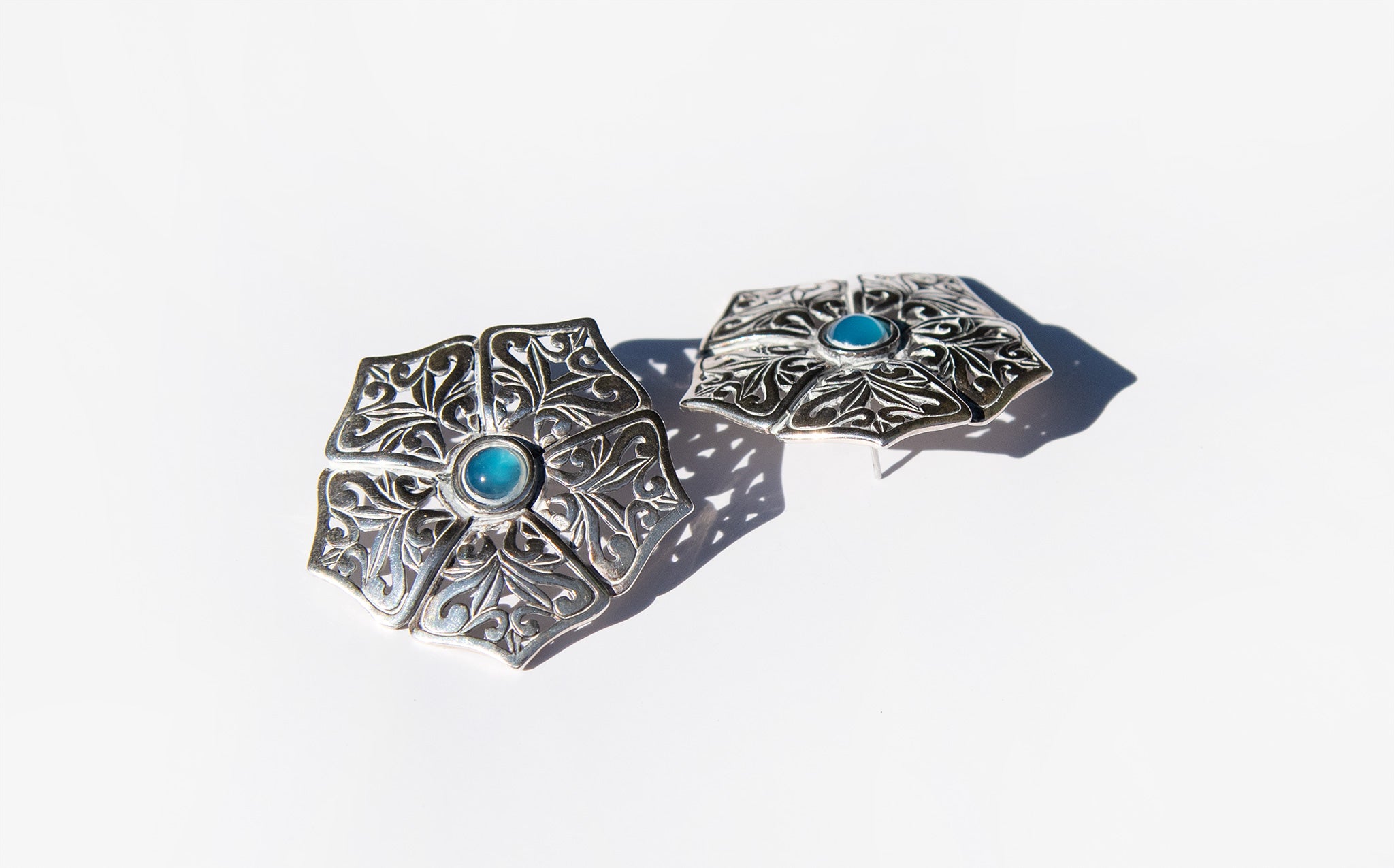 Intricate sterling silver flower earrings with a striking aqua glass cabochon center.