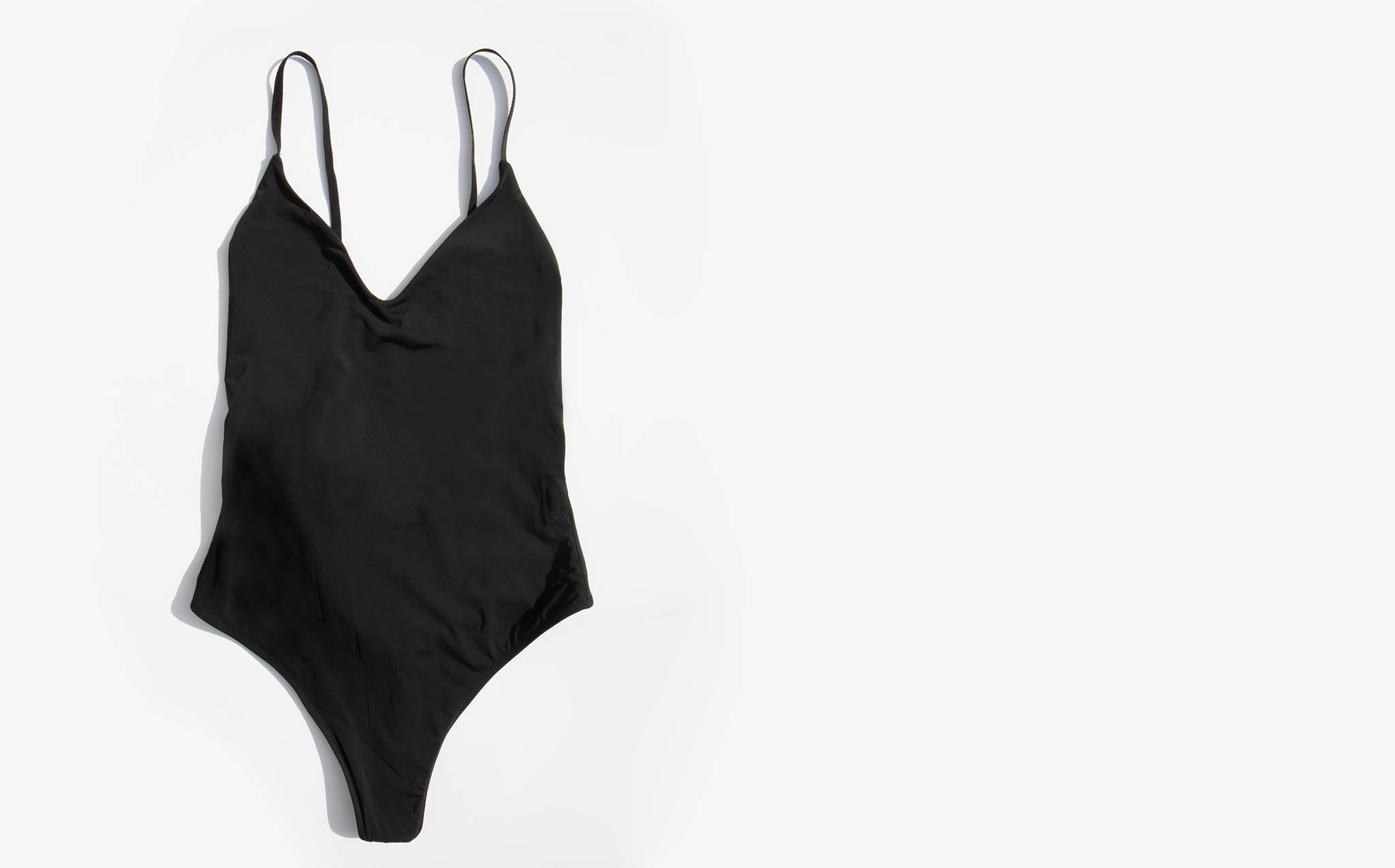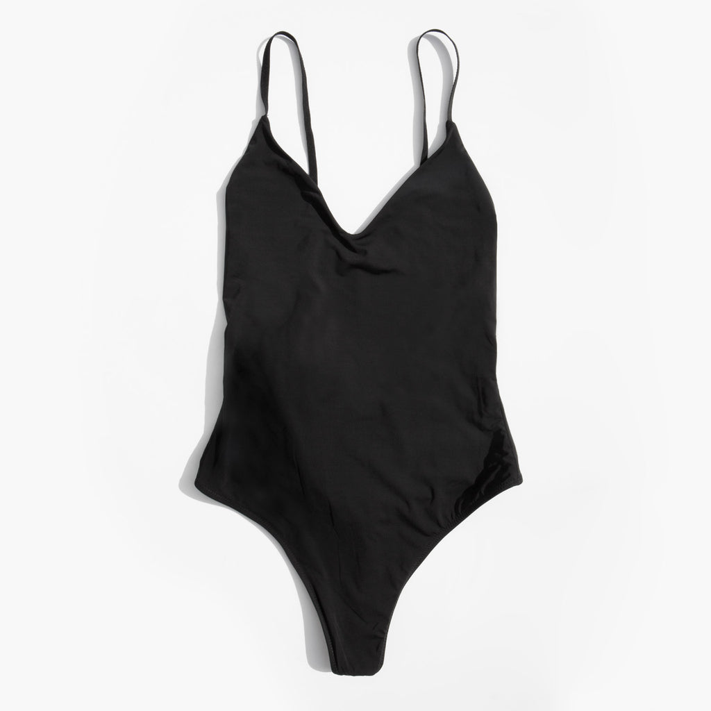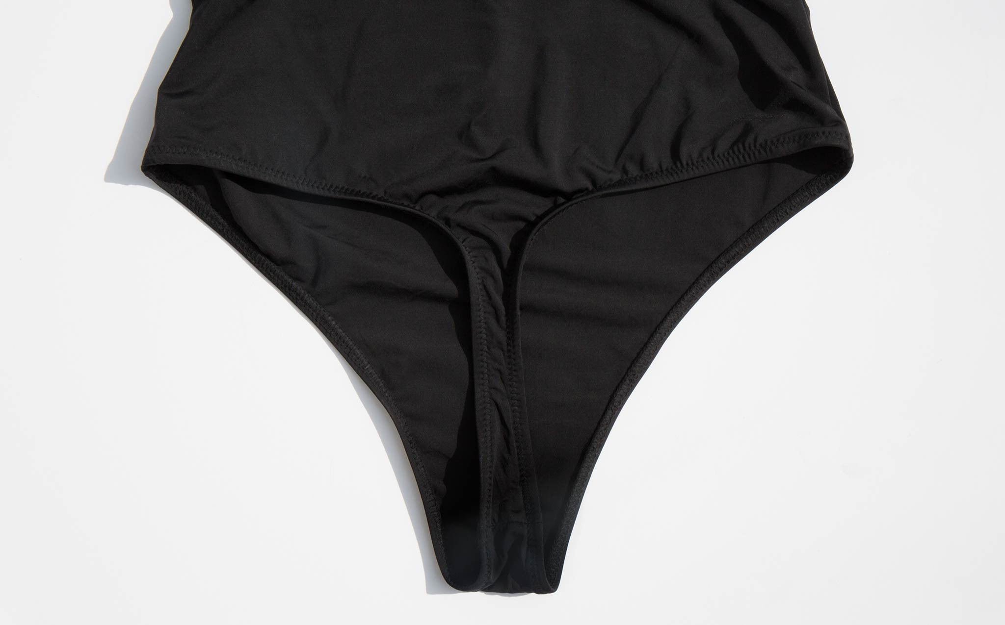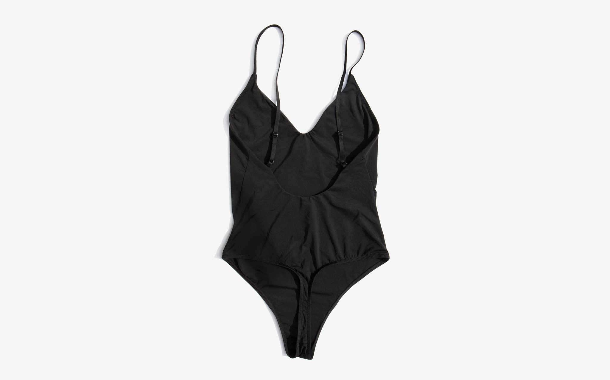Slip on bodysuit with dramatic, deep v-neckline, adjustable straps and low, thong back.