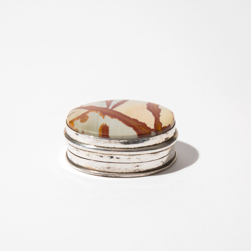 American handmade sterling silver pill box with a bezel set natural landscape agate.
