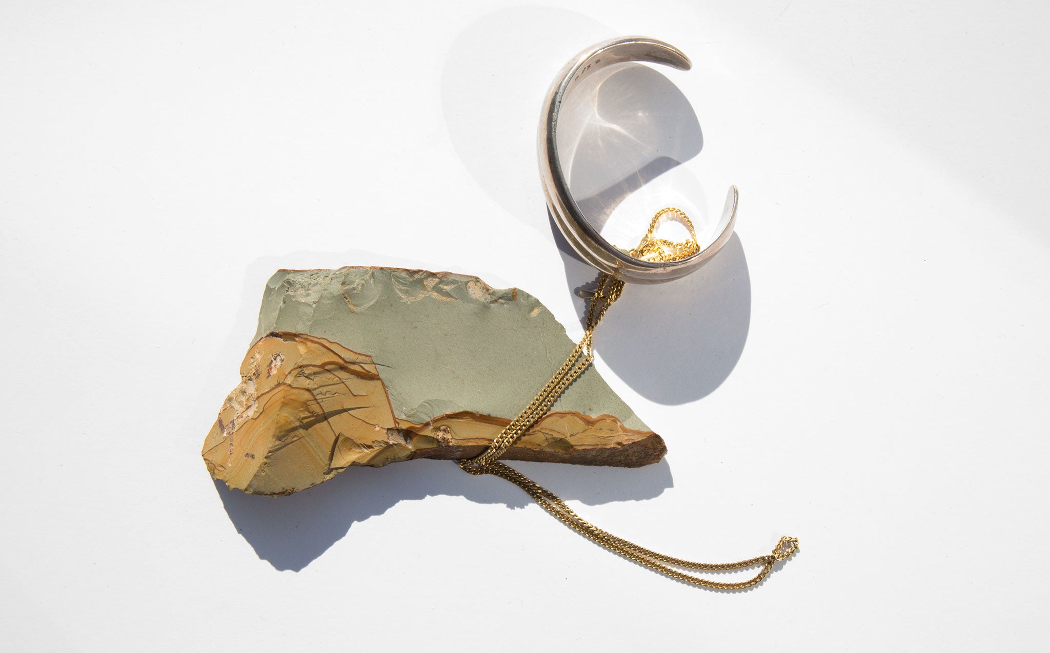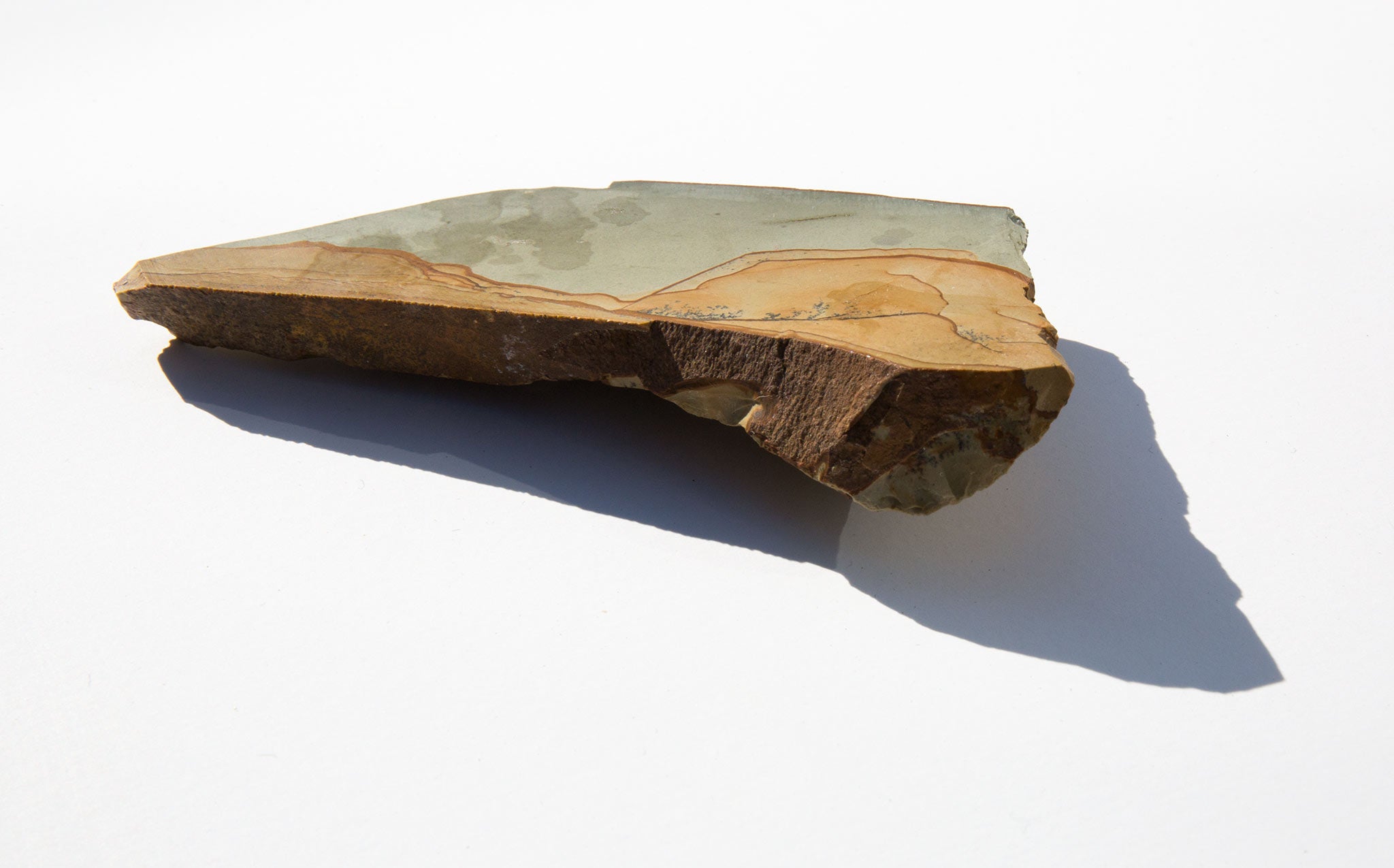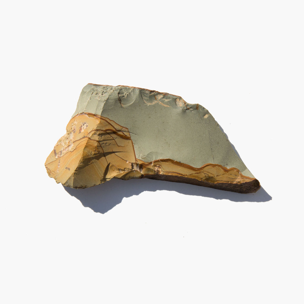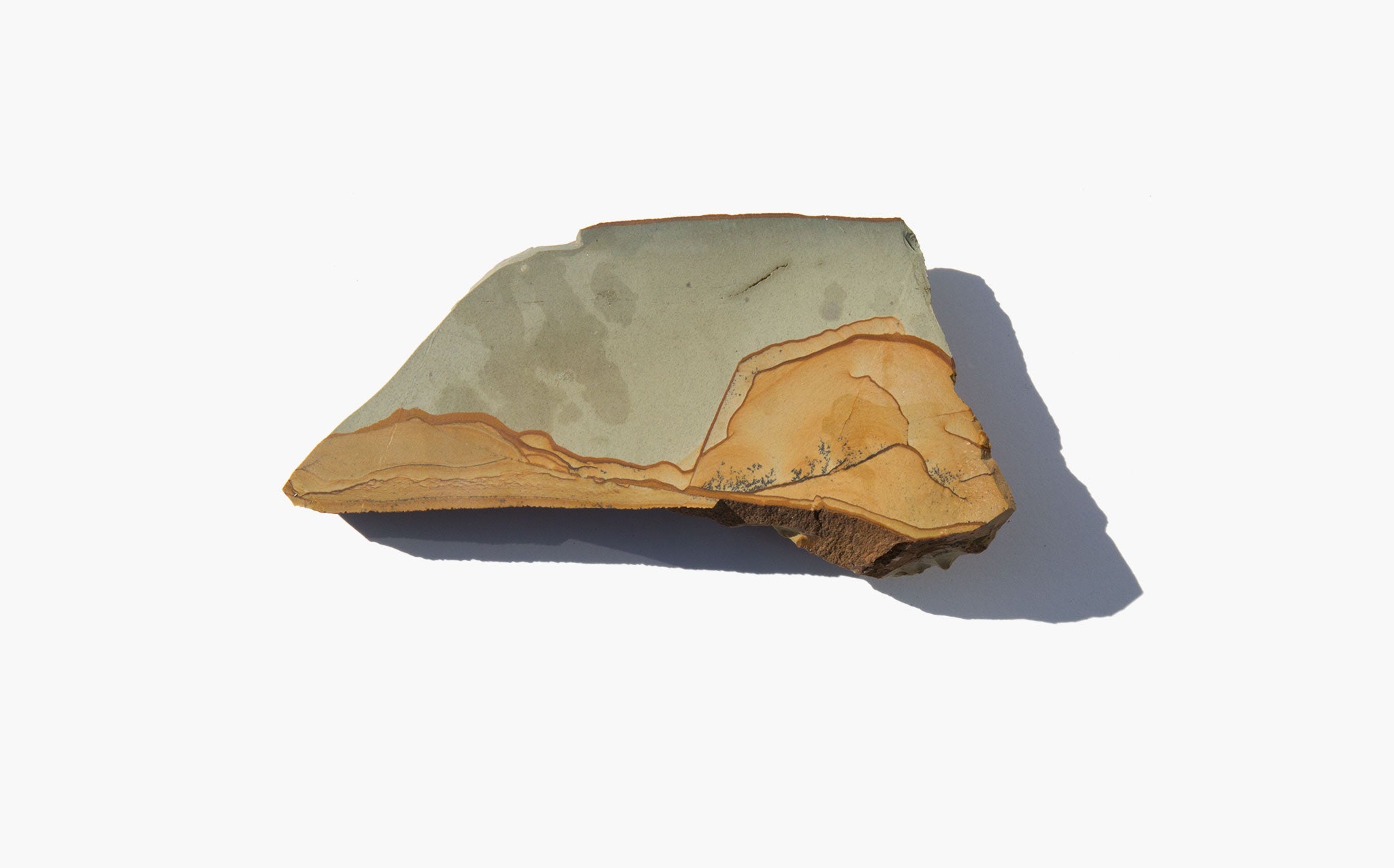 Richly patterned, dusty earth toned specimen of landscape jasper, also known as picture jasper. Jasper is known as a grounding stone and the landscape variety, with each piece uniquely marked by nature, is said to contain secrets of the past and to foster a deep connection between humans and the earth.