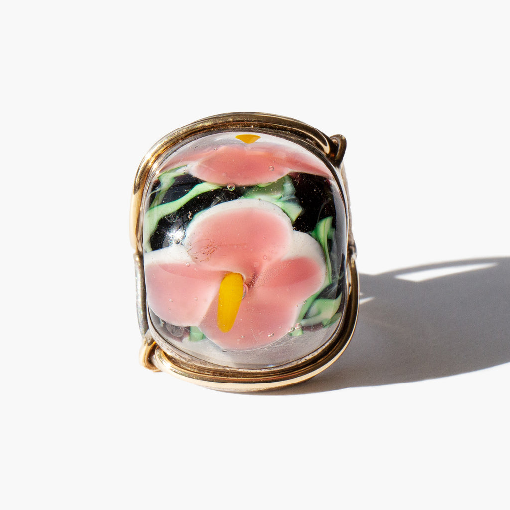 Handmade floral art glass ring set in 14k gold and sterling silver.
