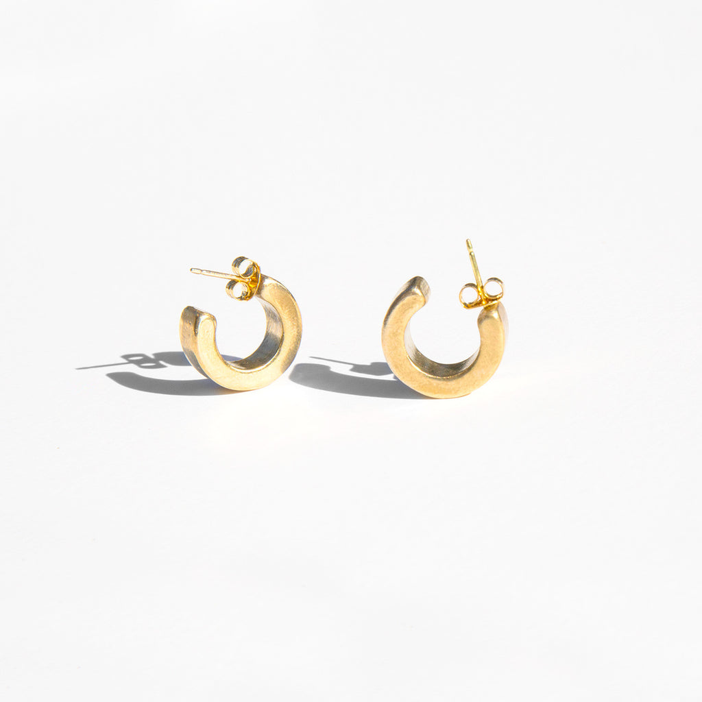 Short, lobe hugging hoop earrings made from recycled brass.