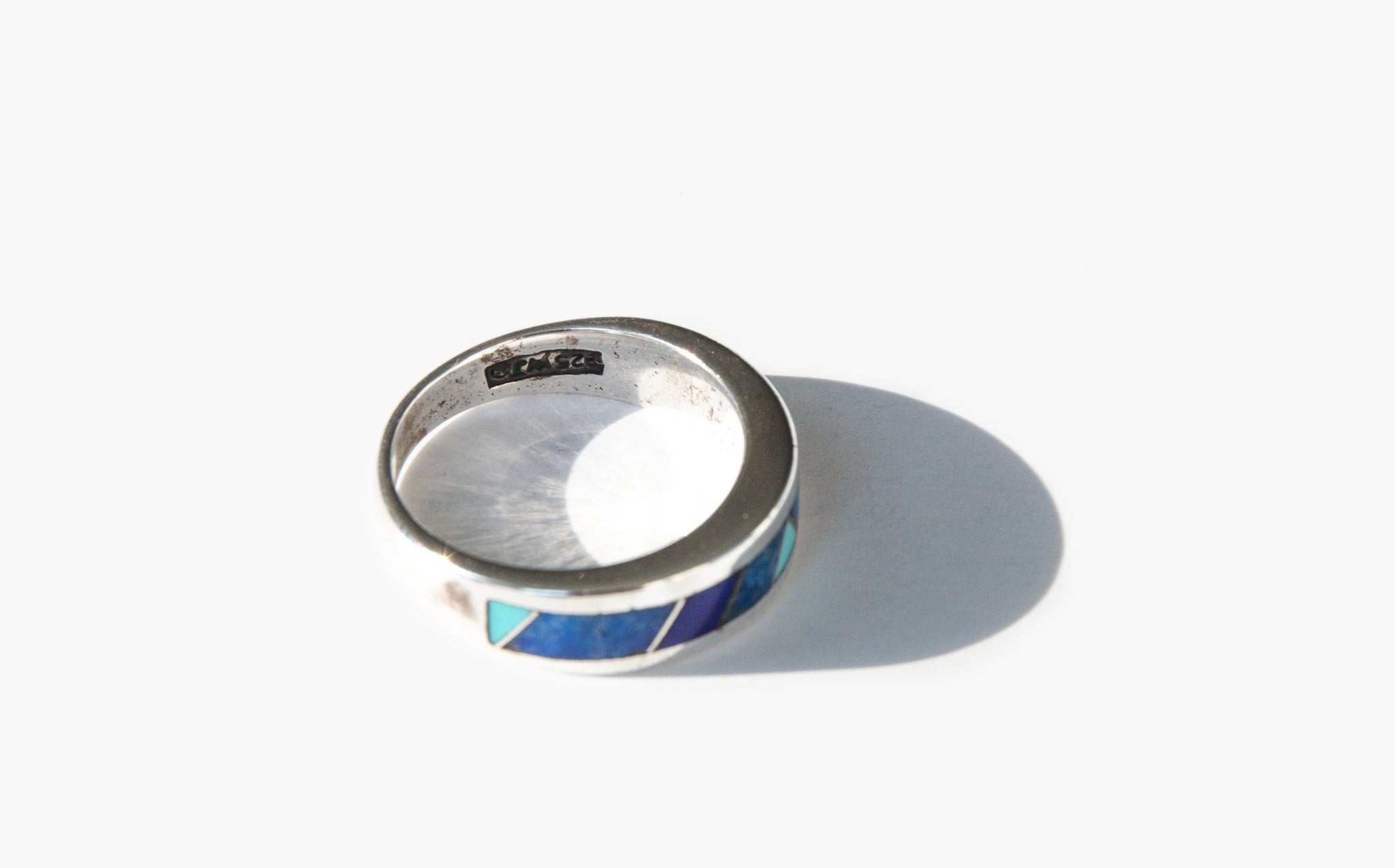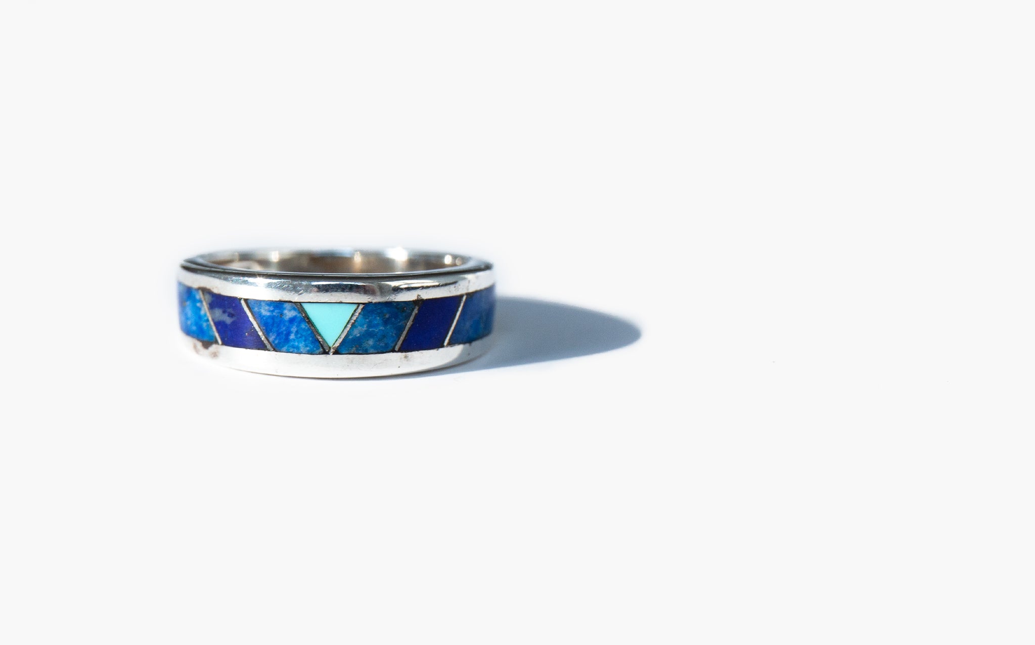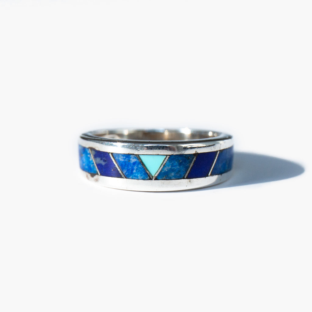 Sterling silver band with inlaid geometric cuts of lapis and turquoise.