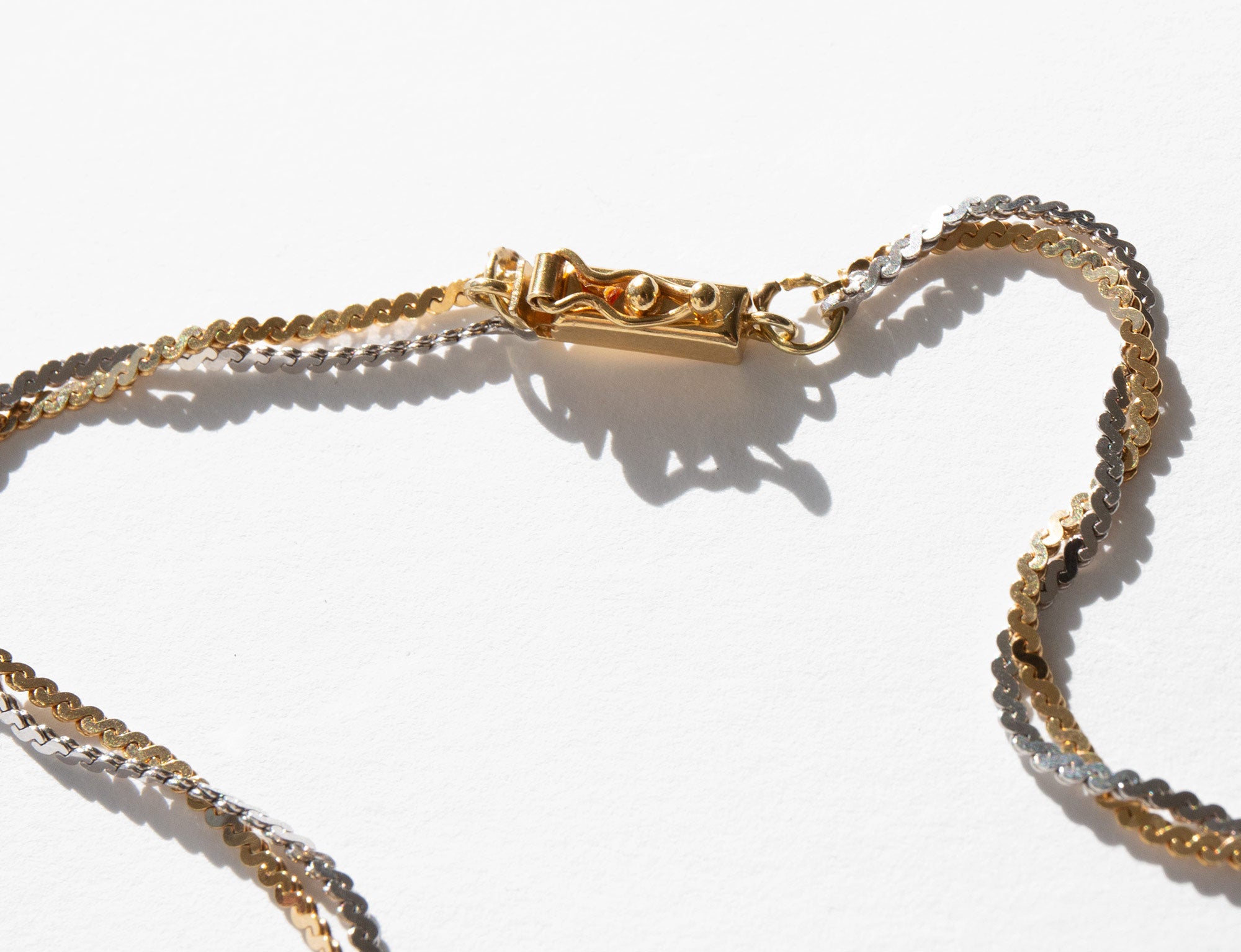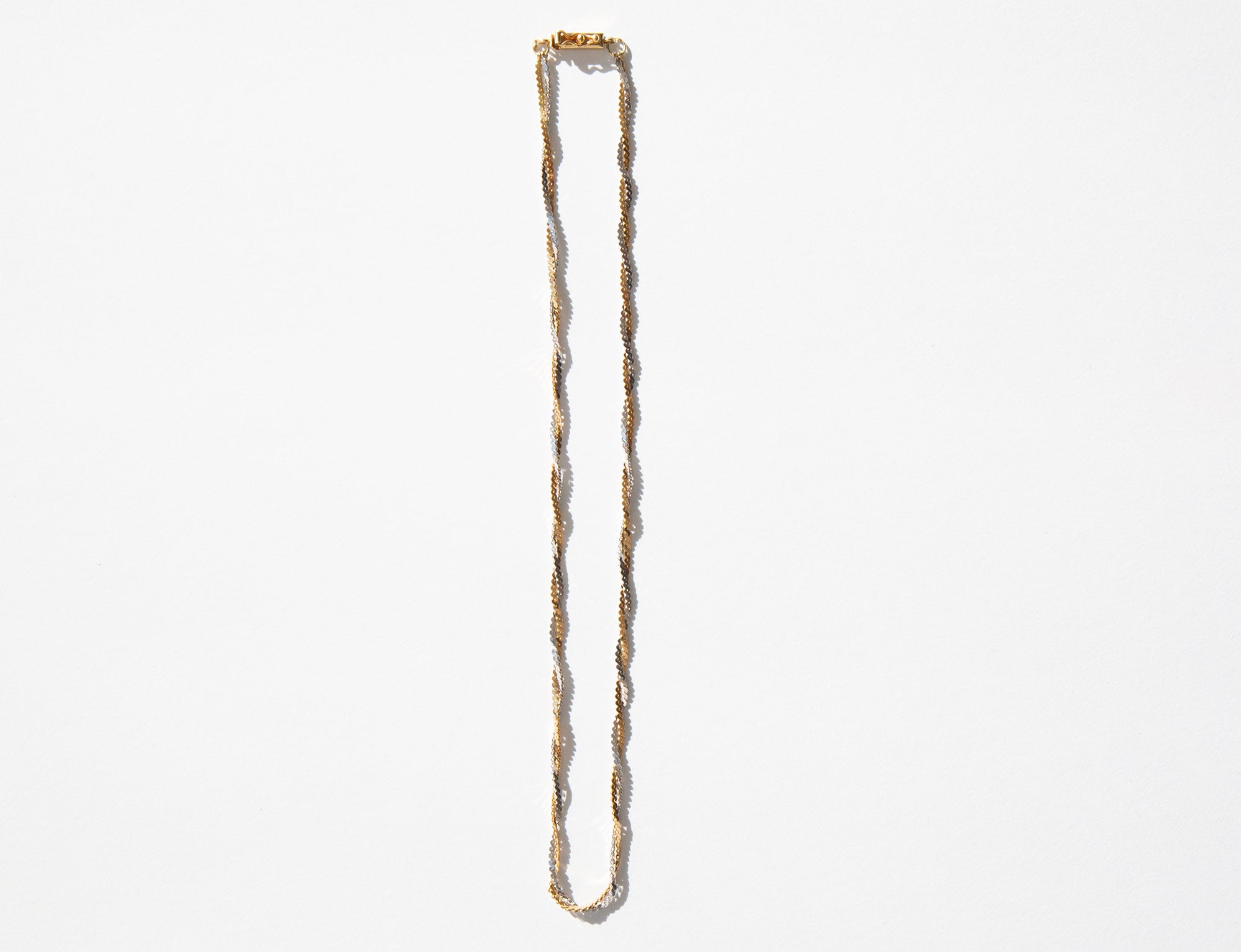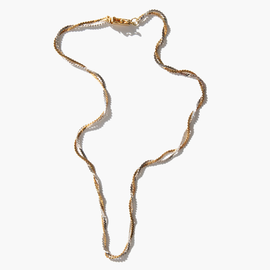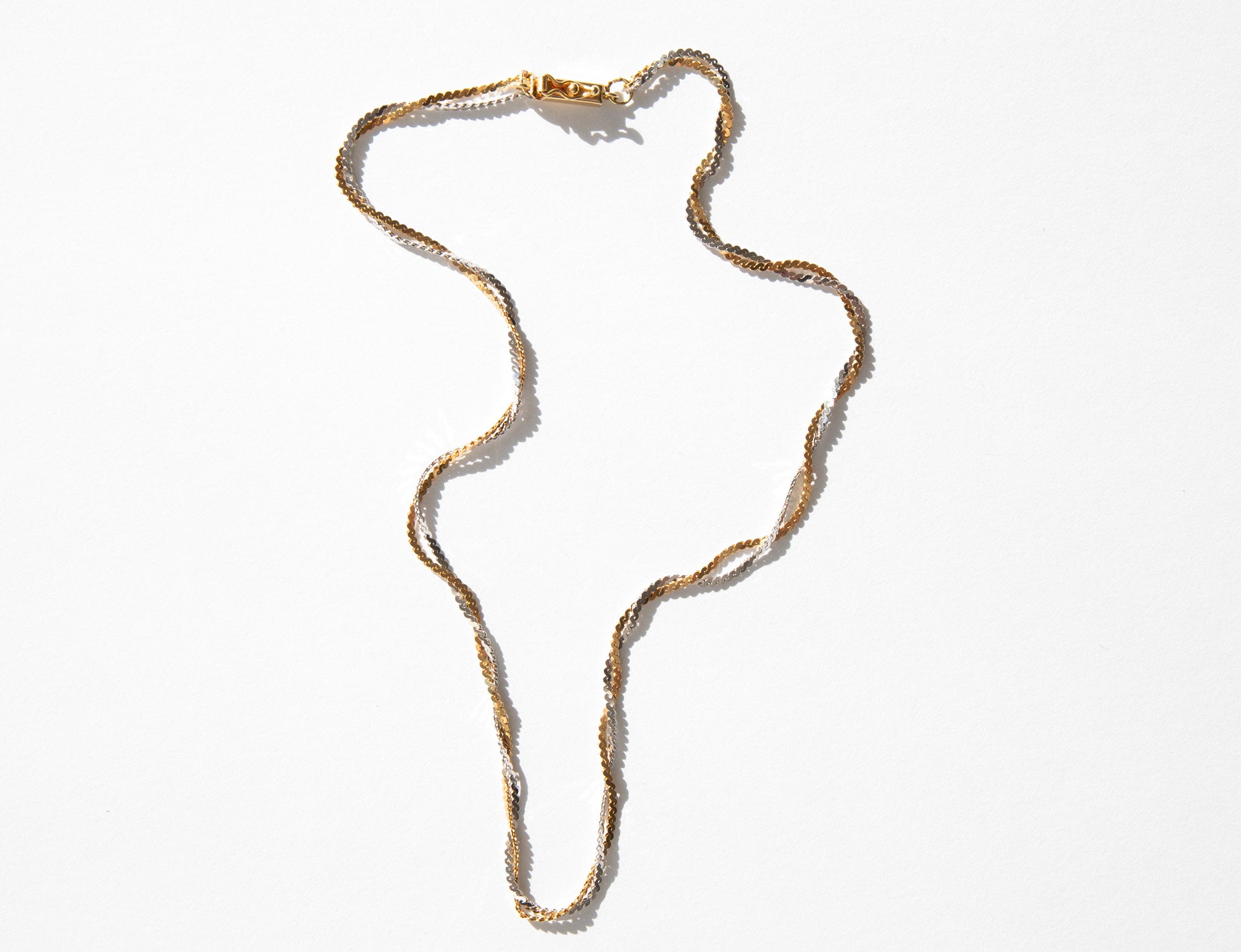 Simple and elegant white and yellow 14k gold braided chain necklace with a beautifully designed catch.