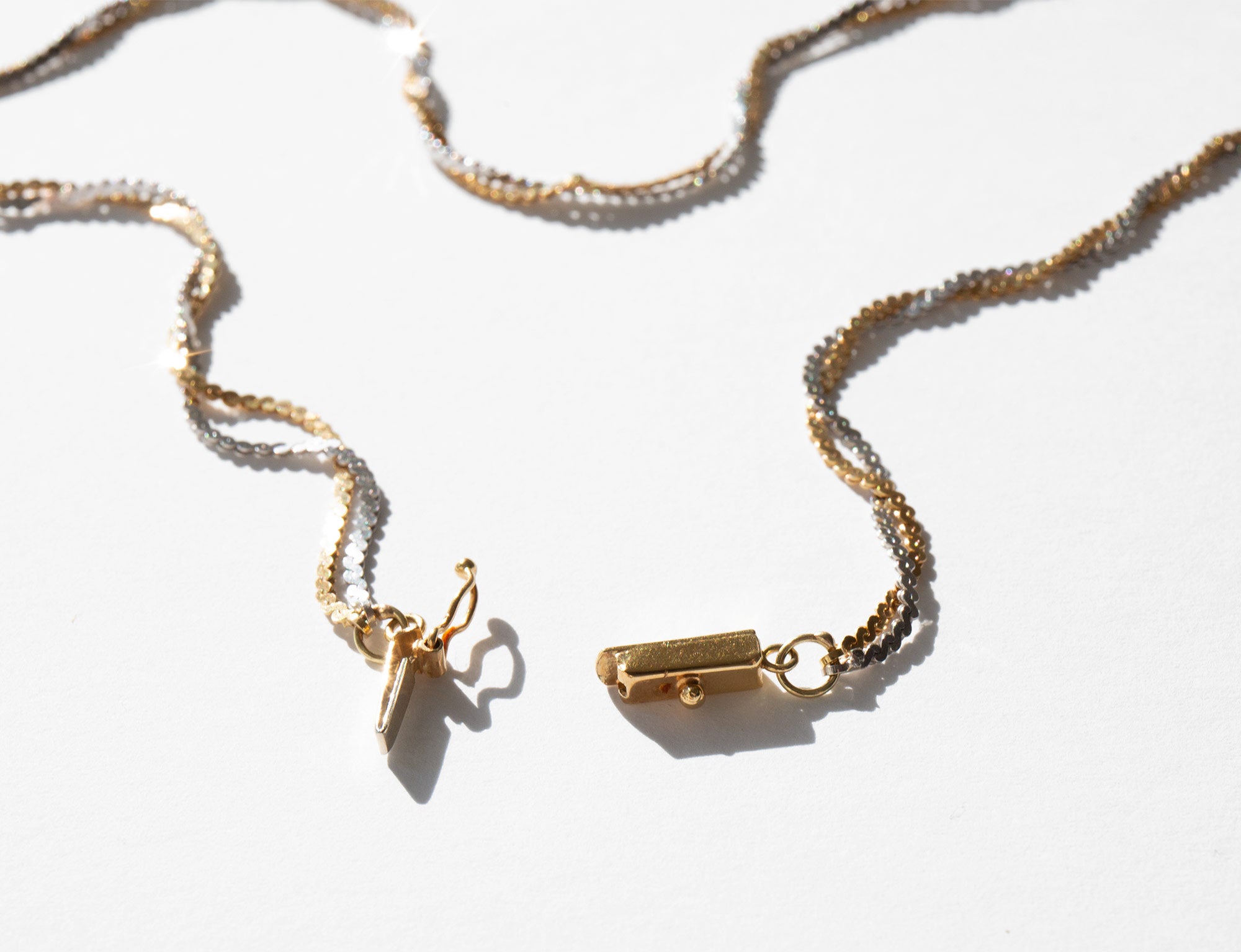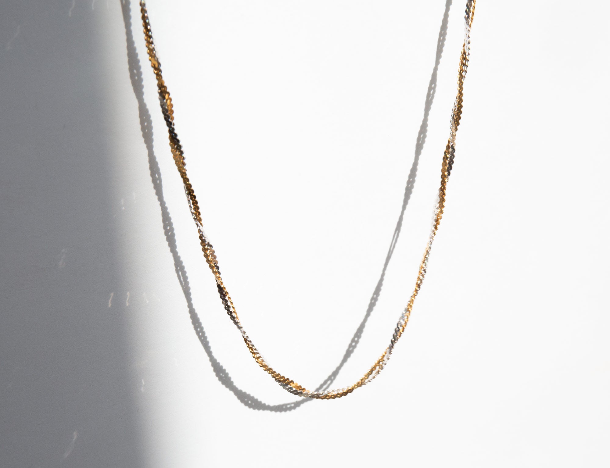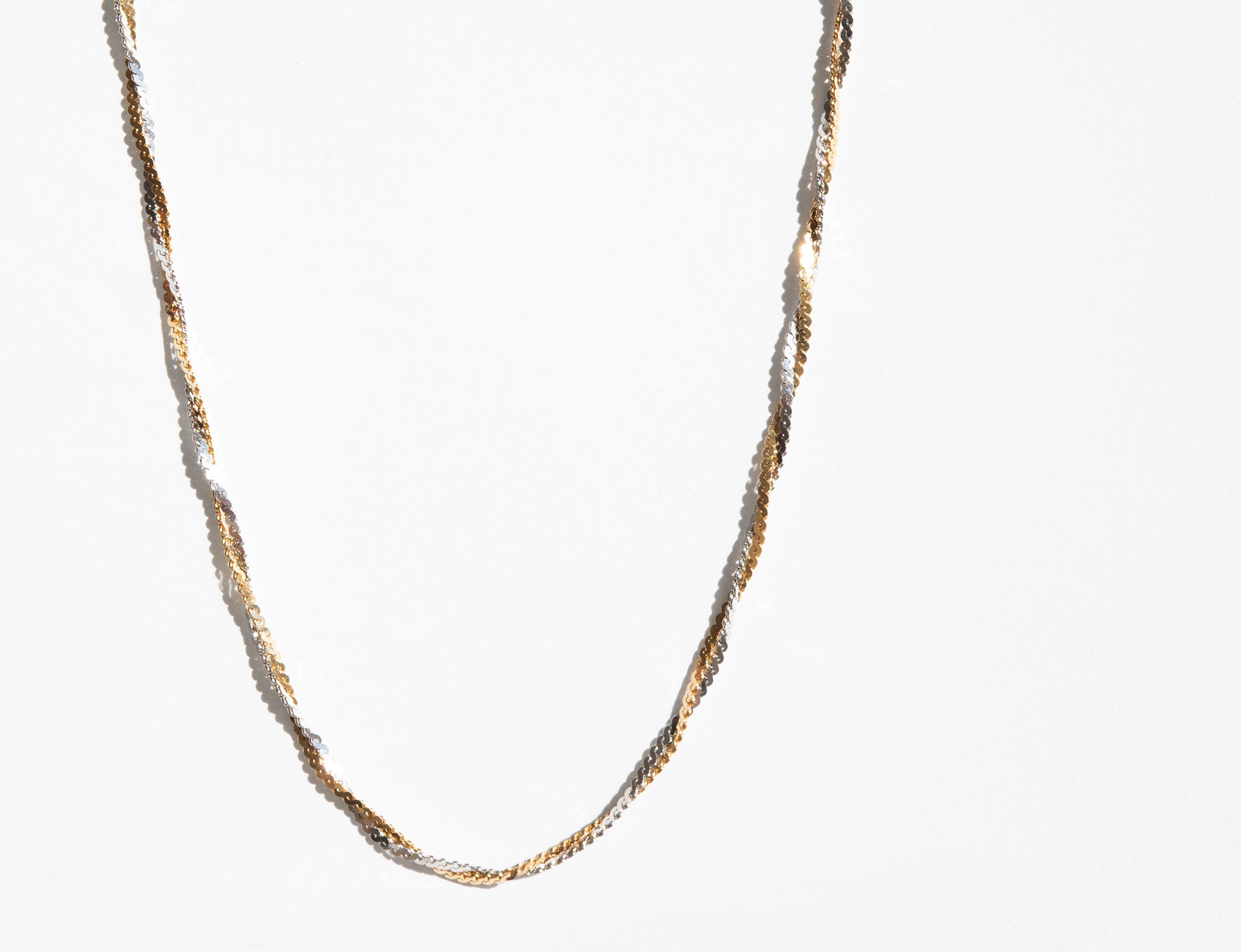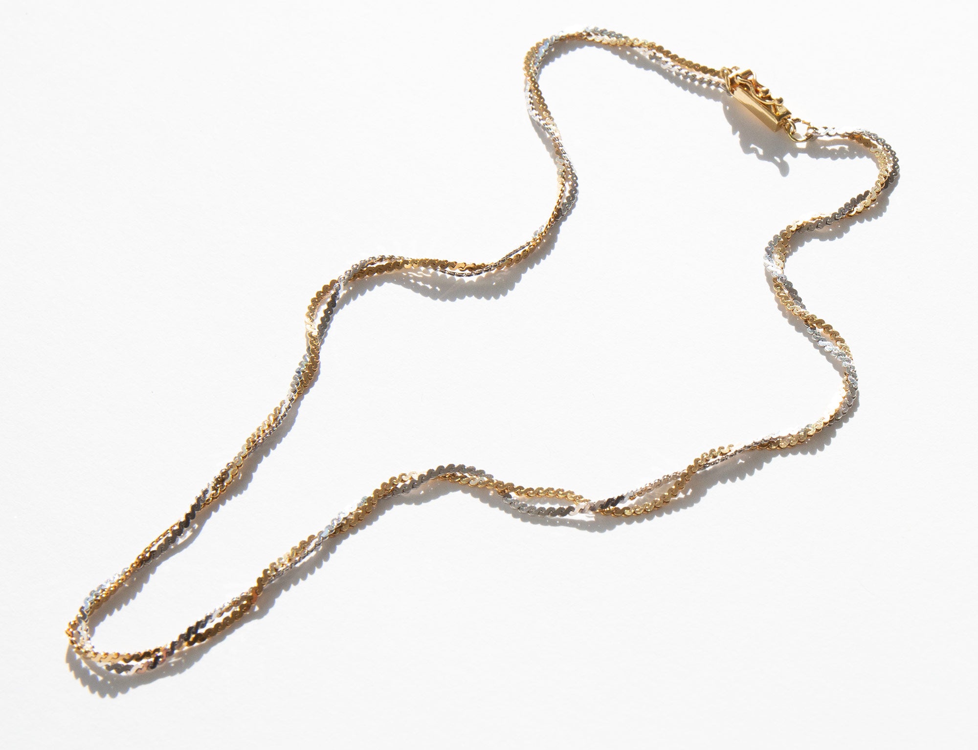 Simple and elegant white and yellow 14k gold braided chain necklace with a beautifully designed catch.