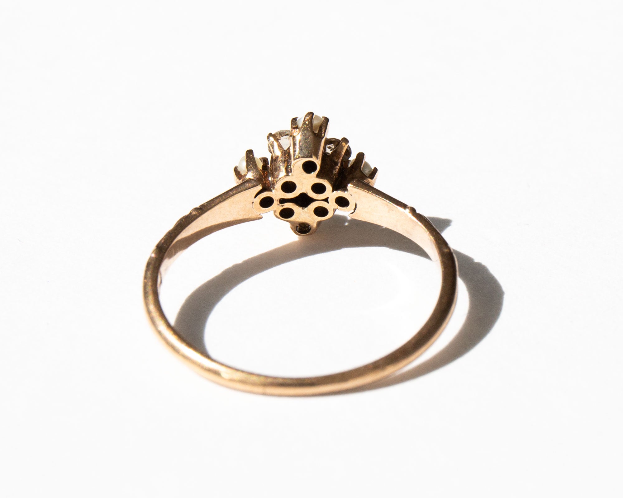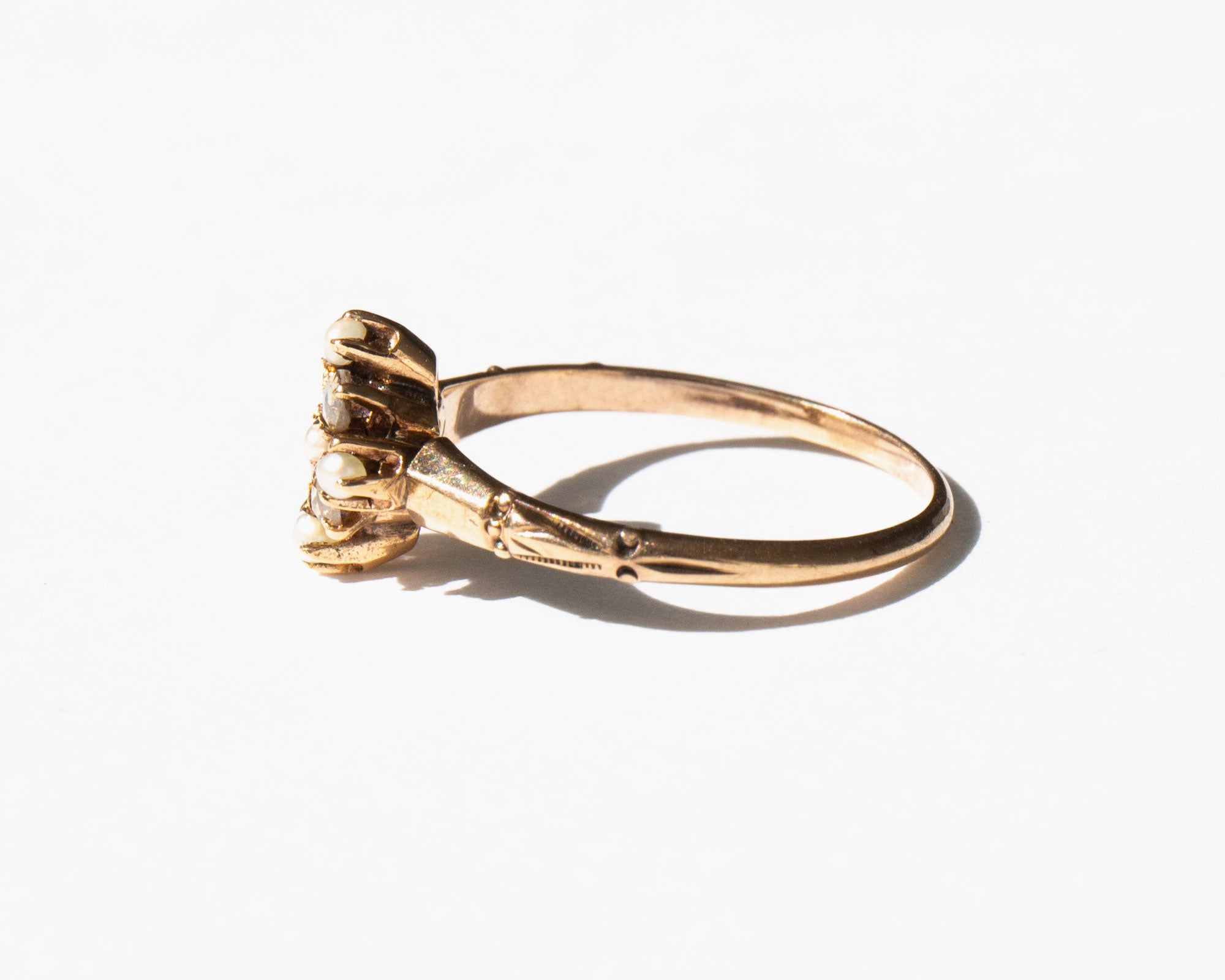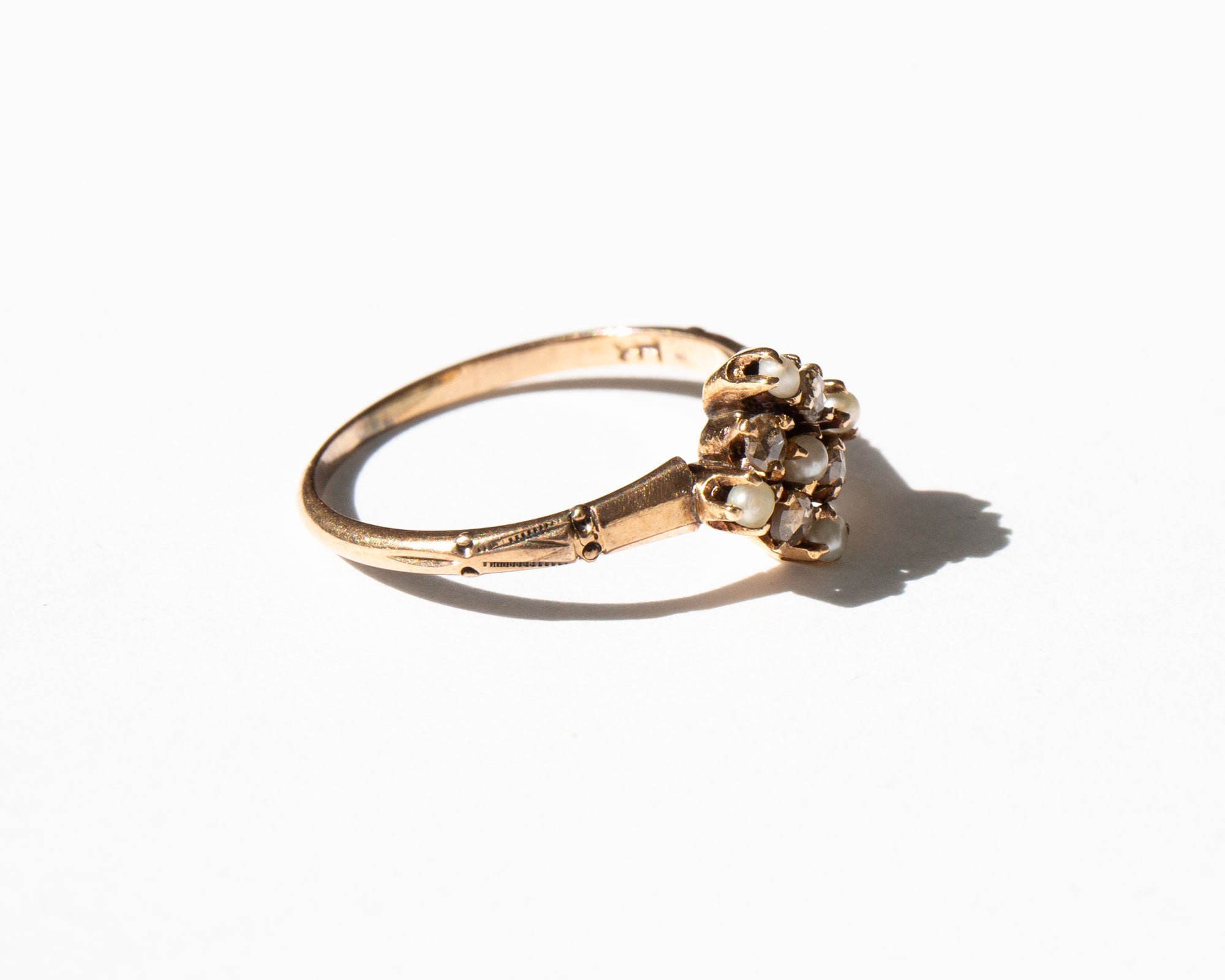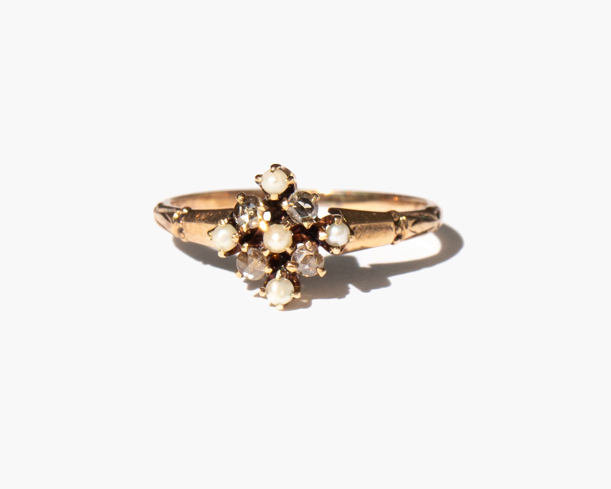 Elegant and sparkling antique Victorian 10k gold ring with rose cut diamonds and pearls.