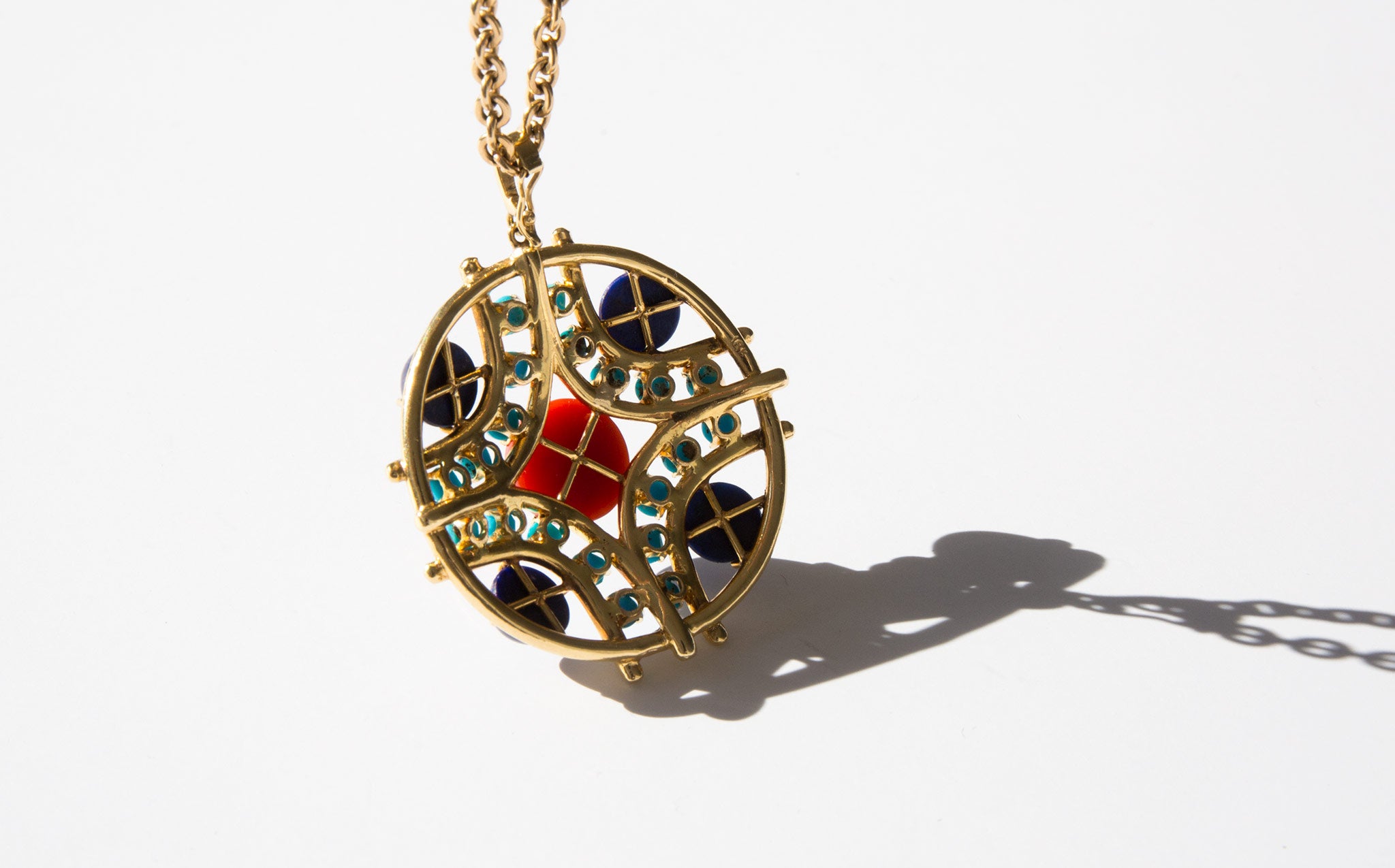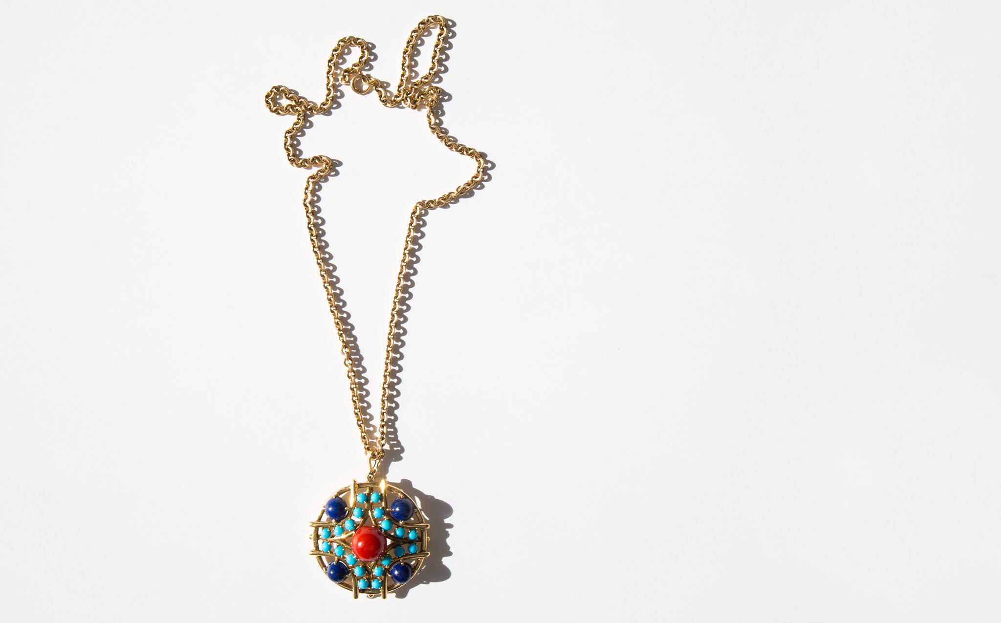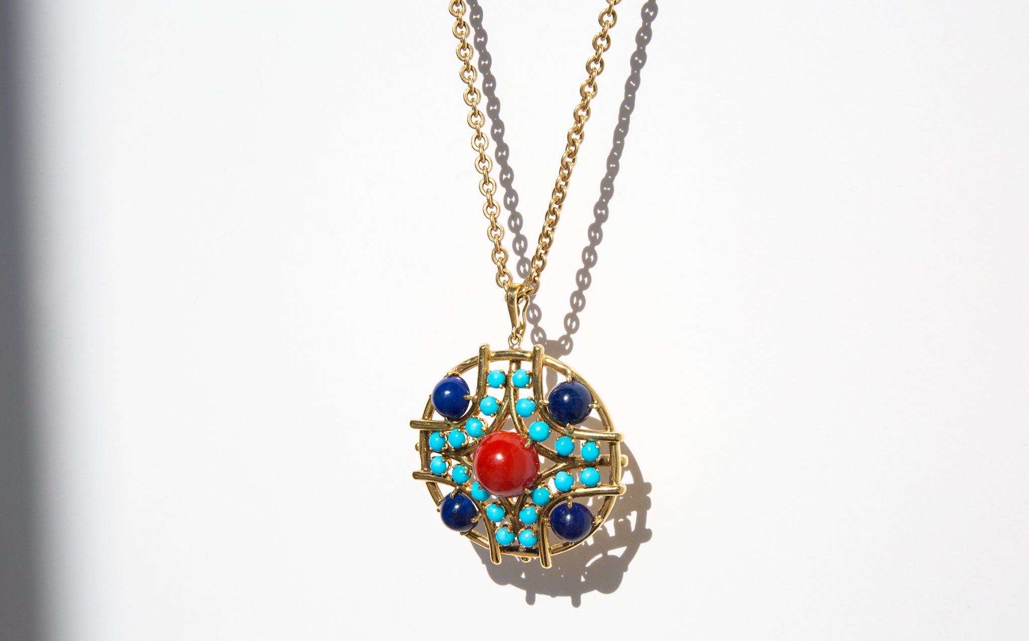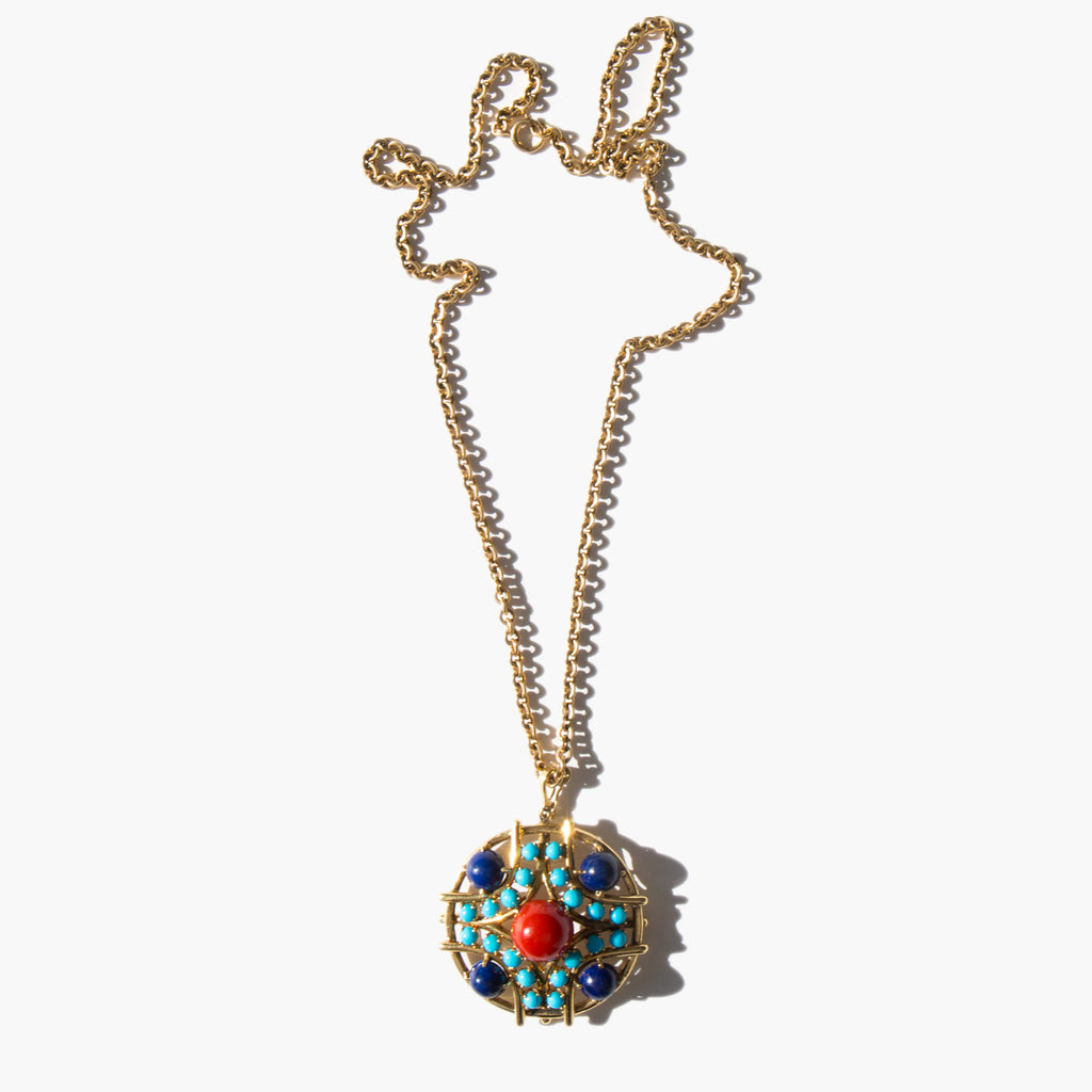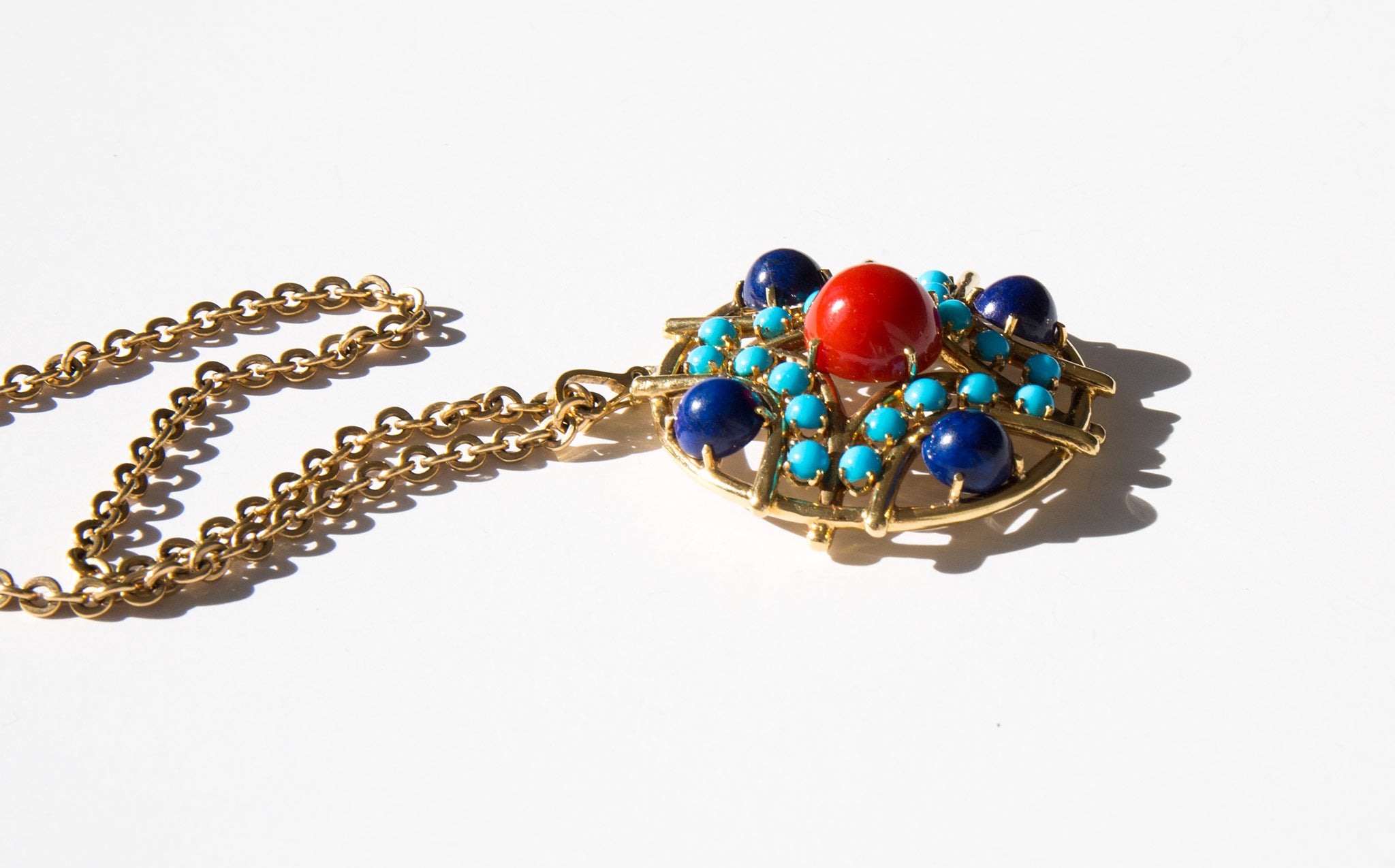 Ravishing and colorful statement pendant of solid 18k gold with turquoise, lapis and coral stones on a 14k gold link chain.