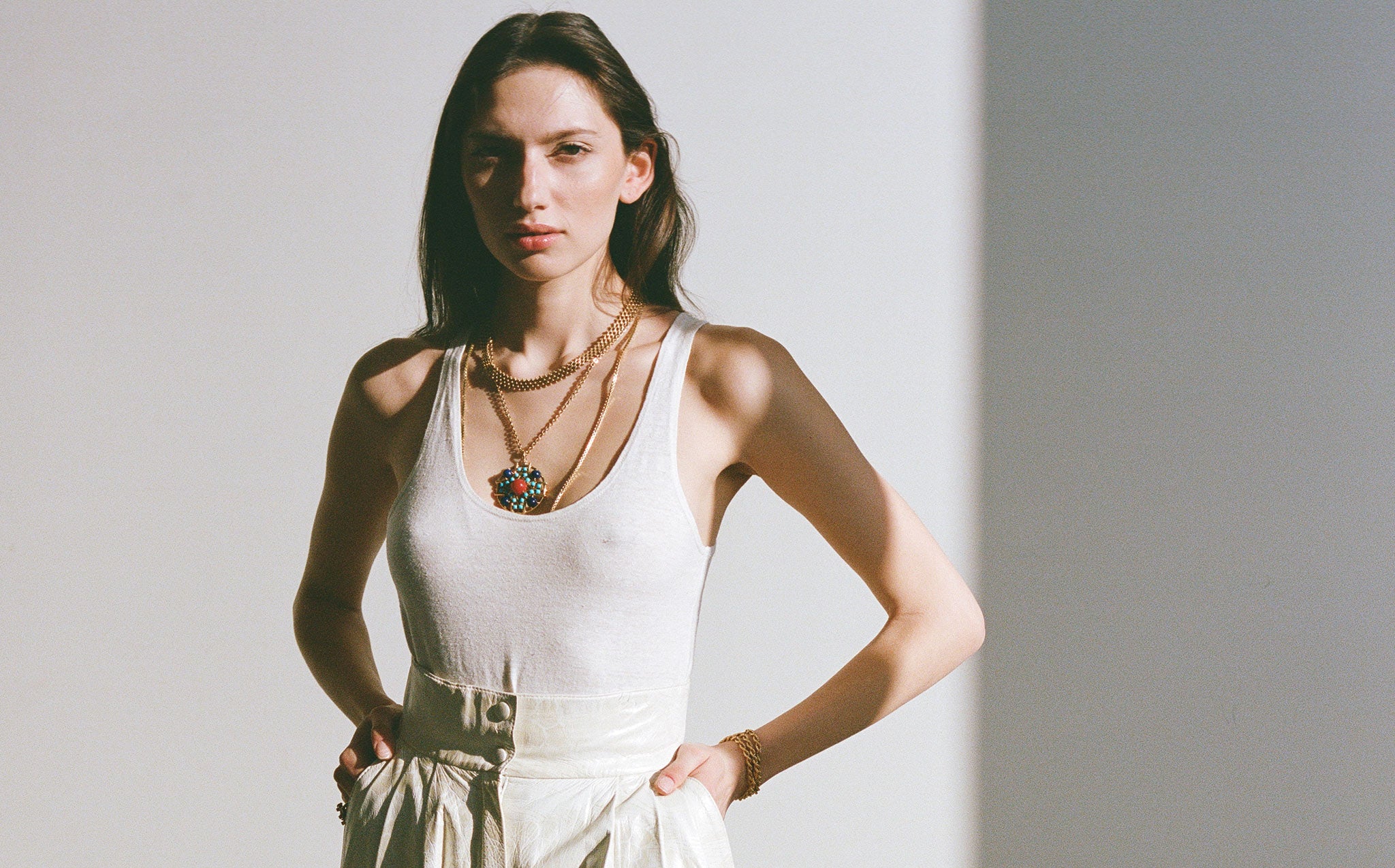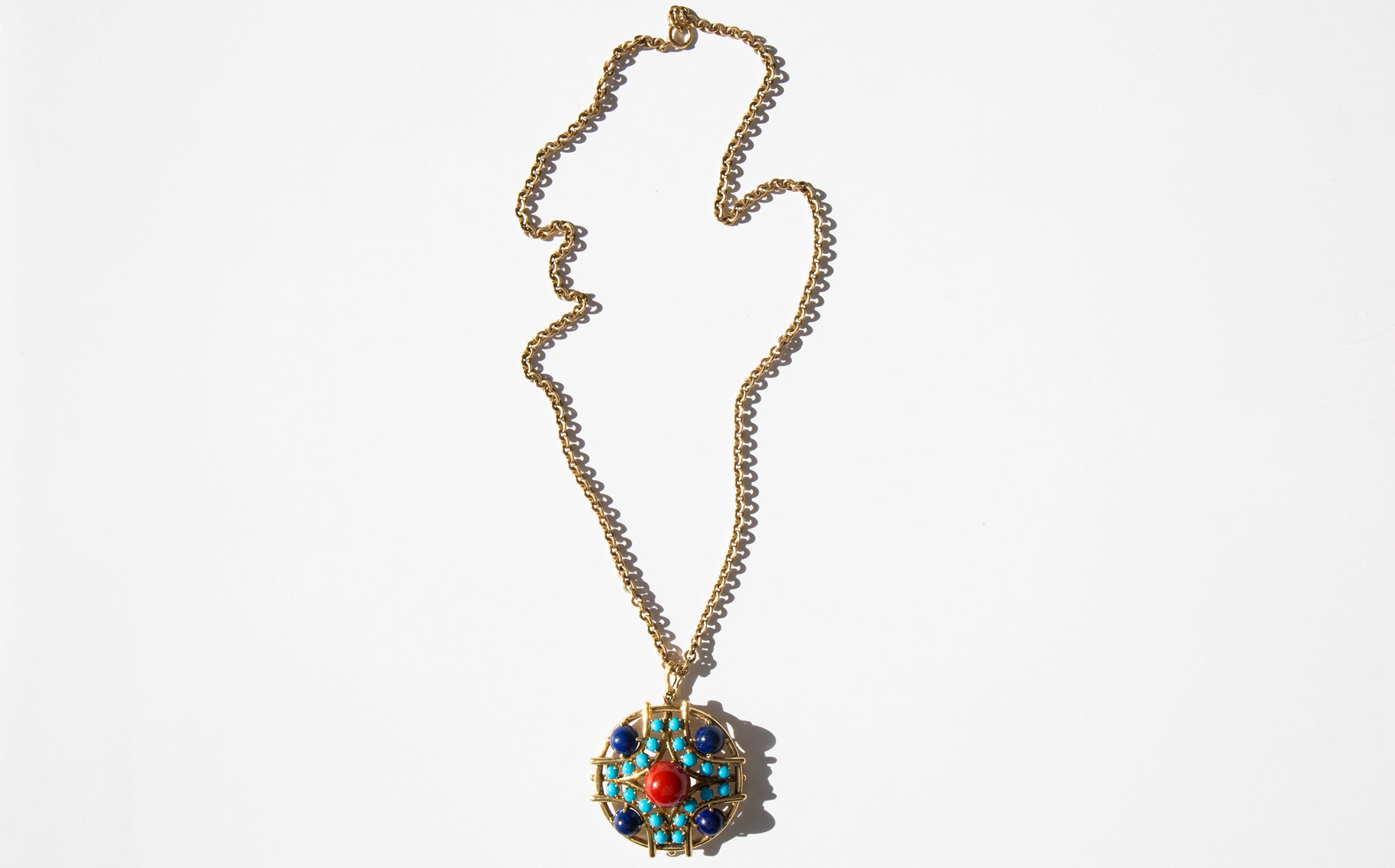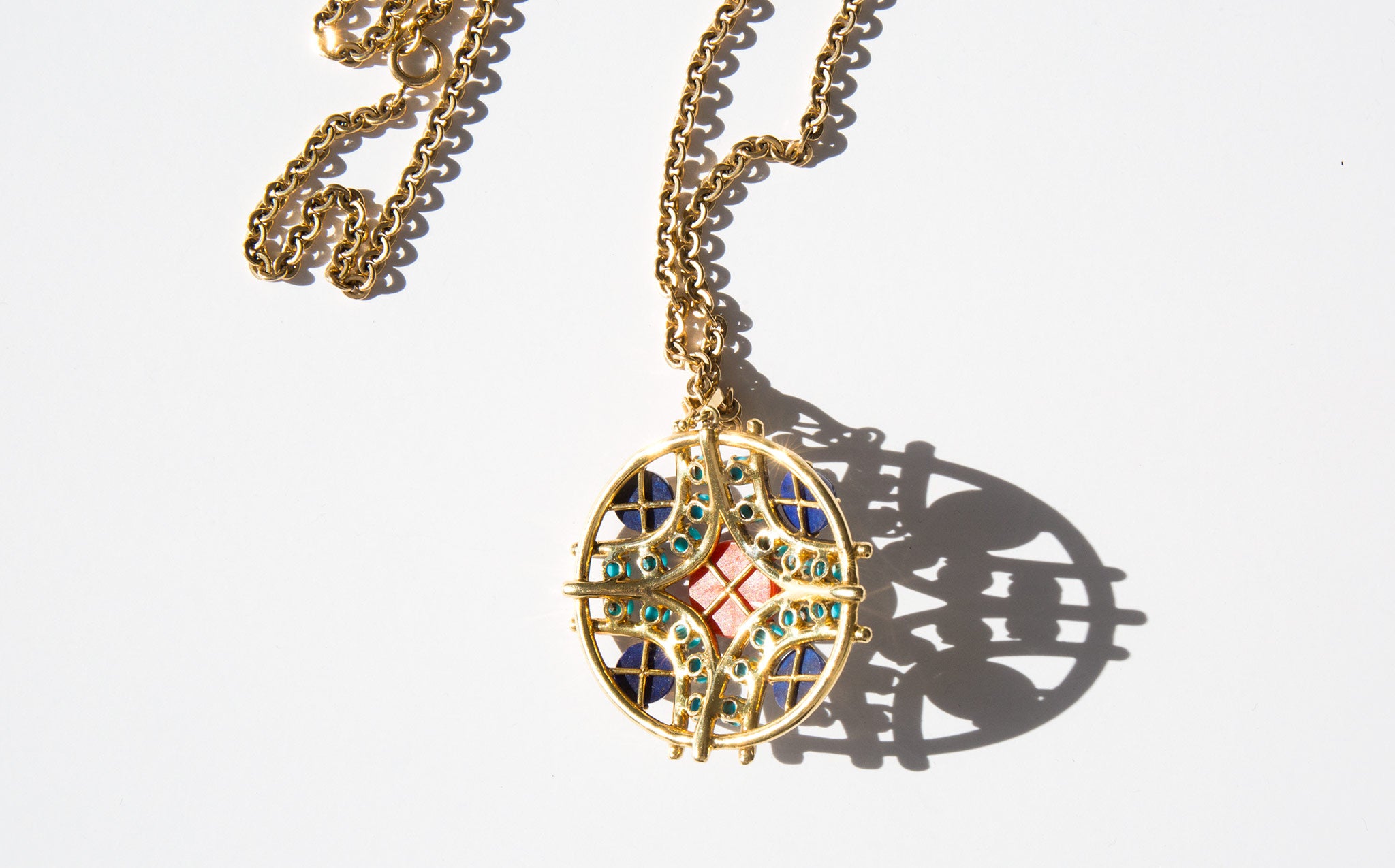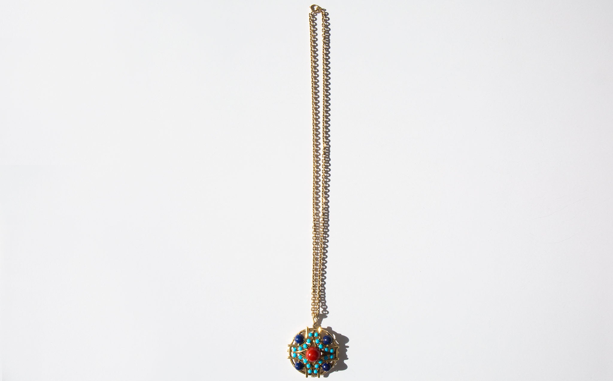 Ravishing and colorful statement pendant of solid 18k gold with turquoise, lapis and coral stones on a 14k gold link chain.