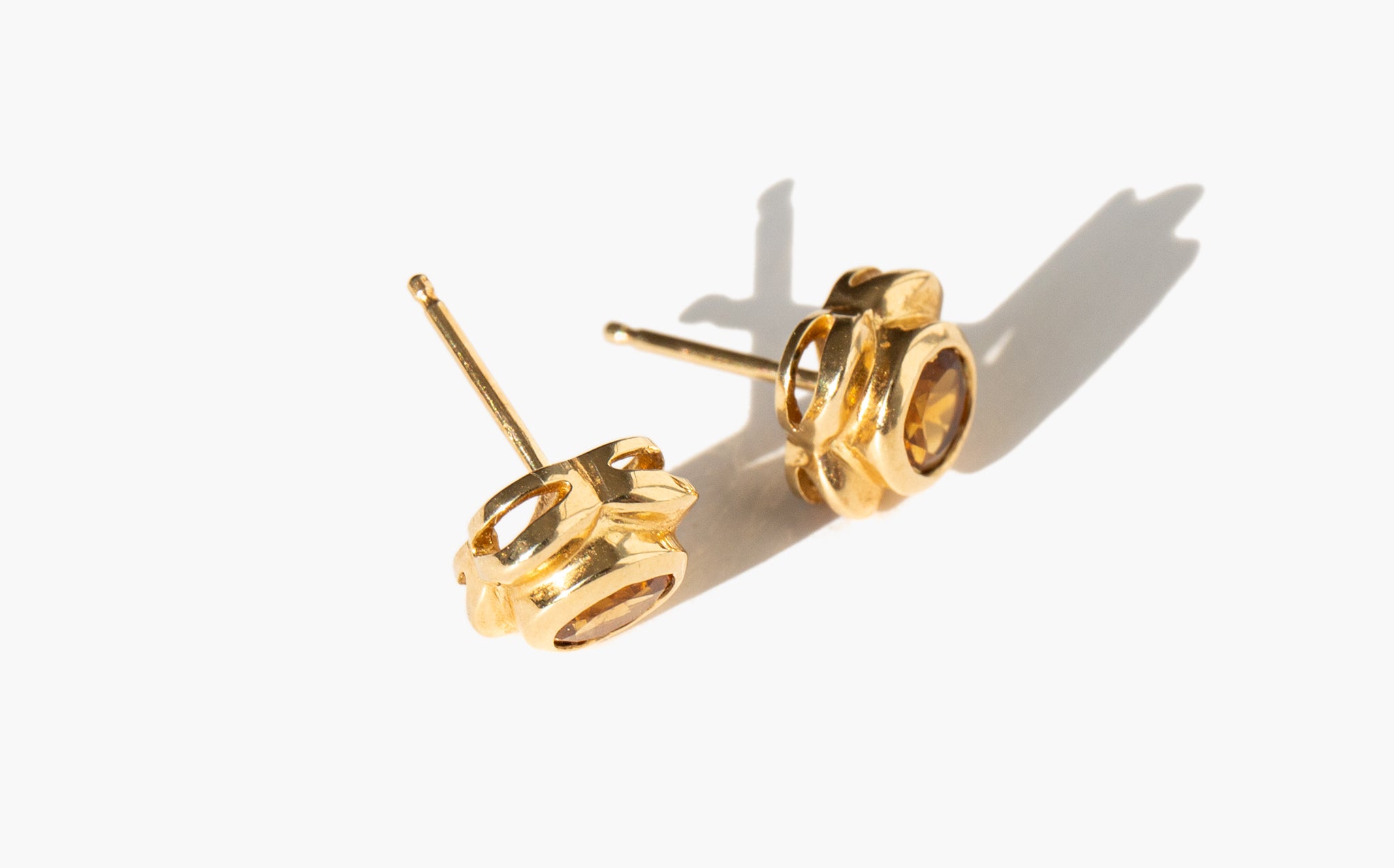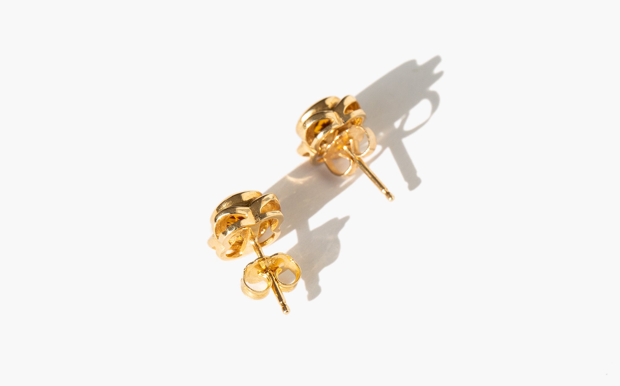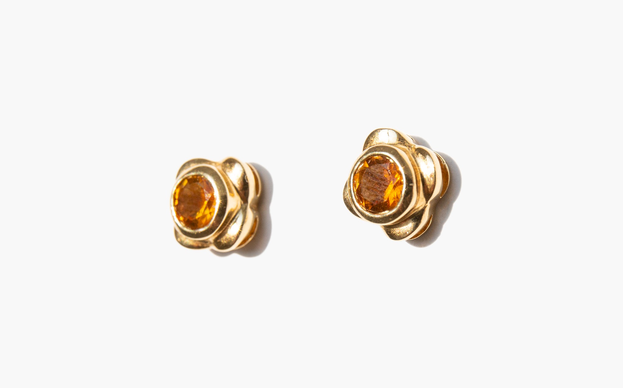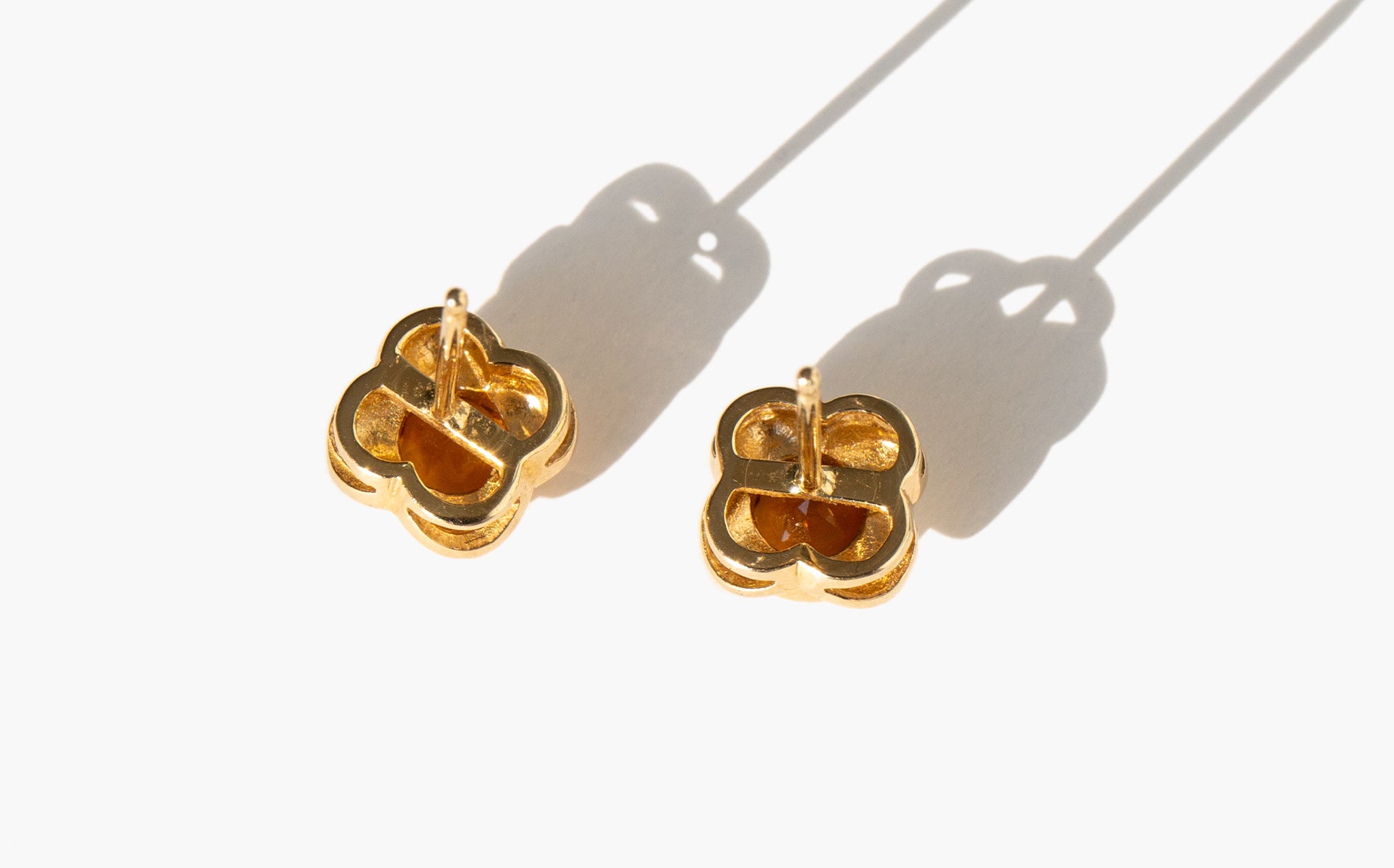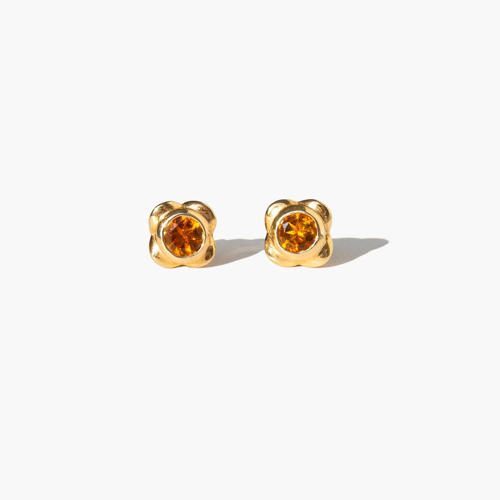 Simple 14k gold stud earrings in a sculpted, four-petaled flower design with sparkling golden semi-precious stones.