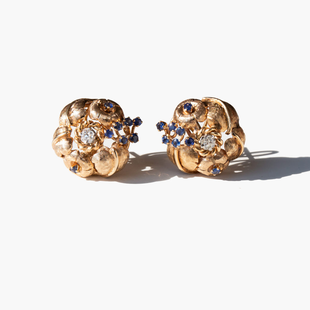 Ornate 1960's 14k gold, diamond, and sapphire earrings.