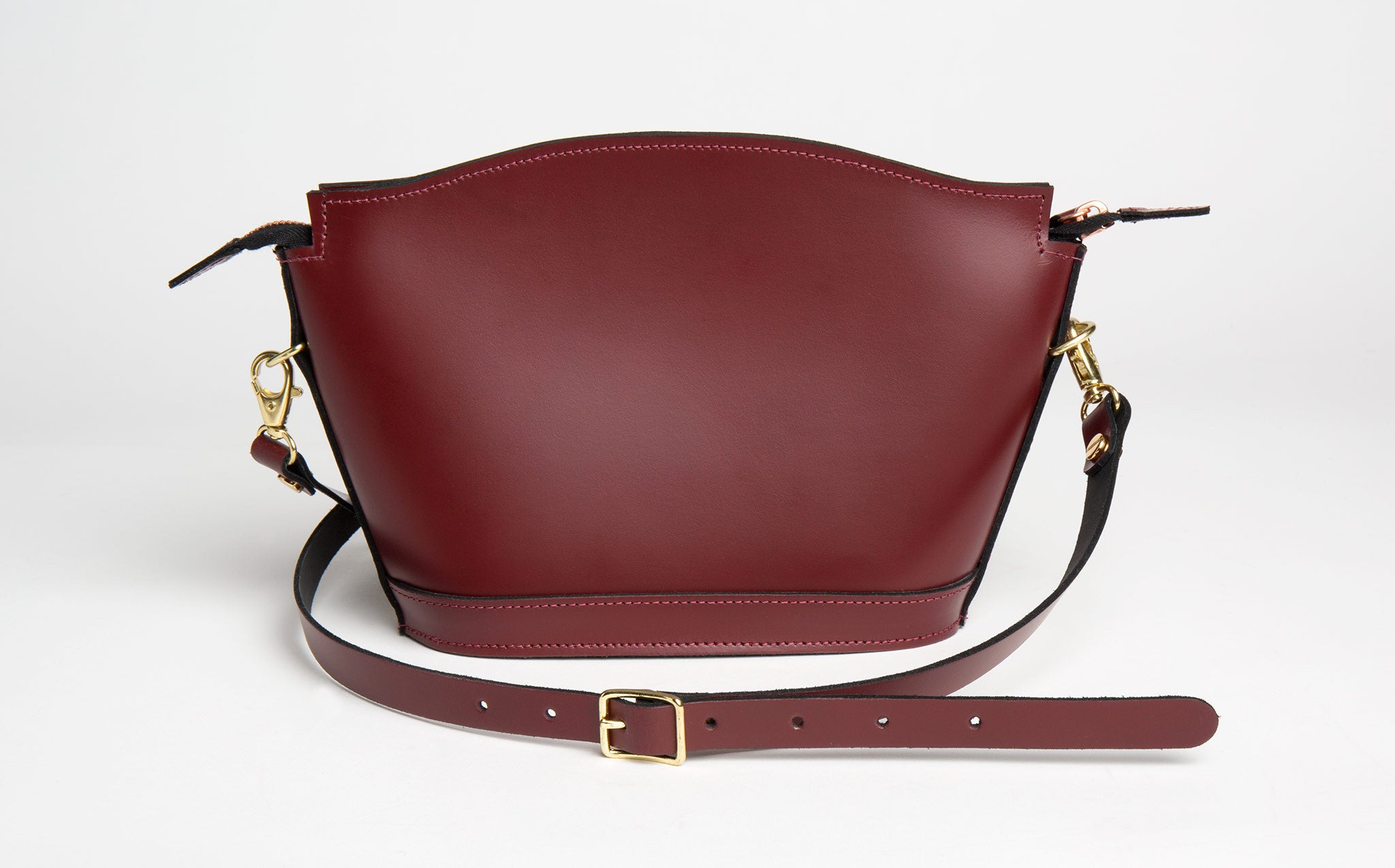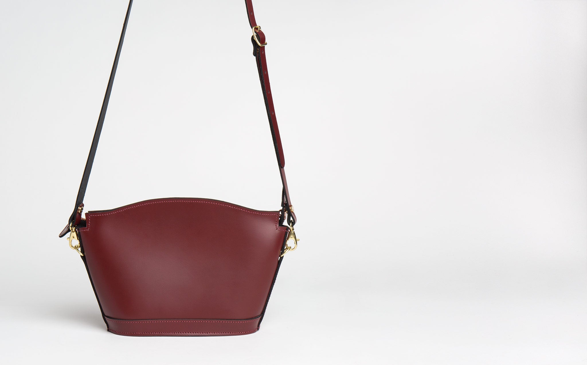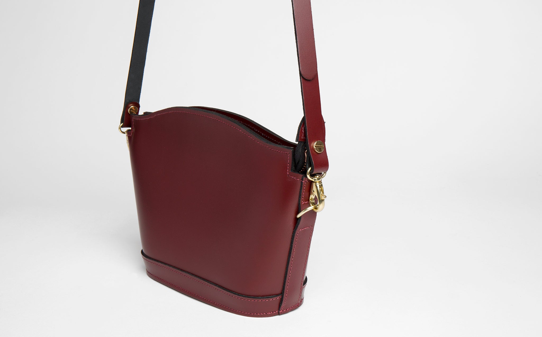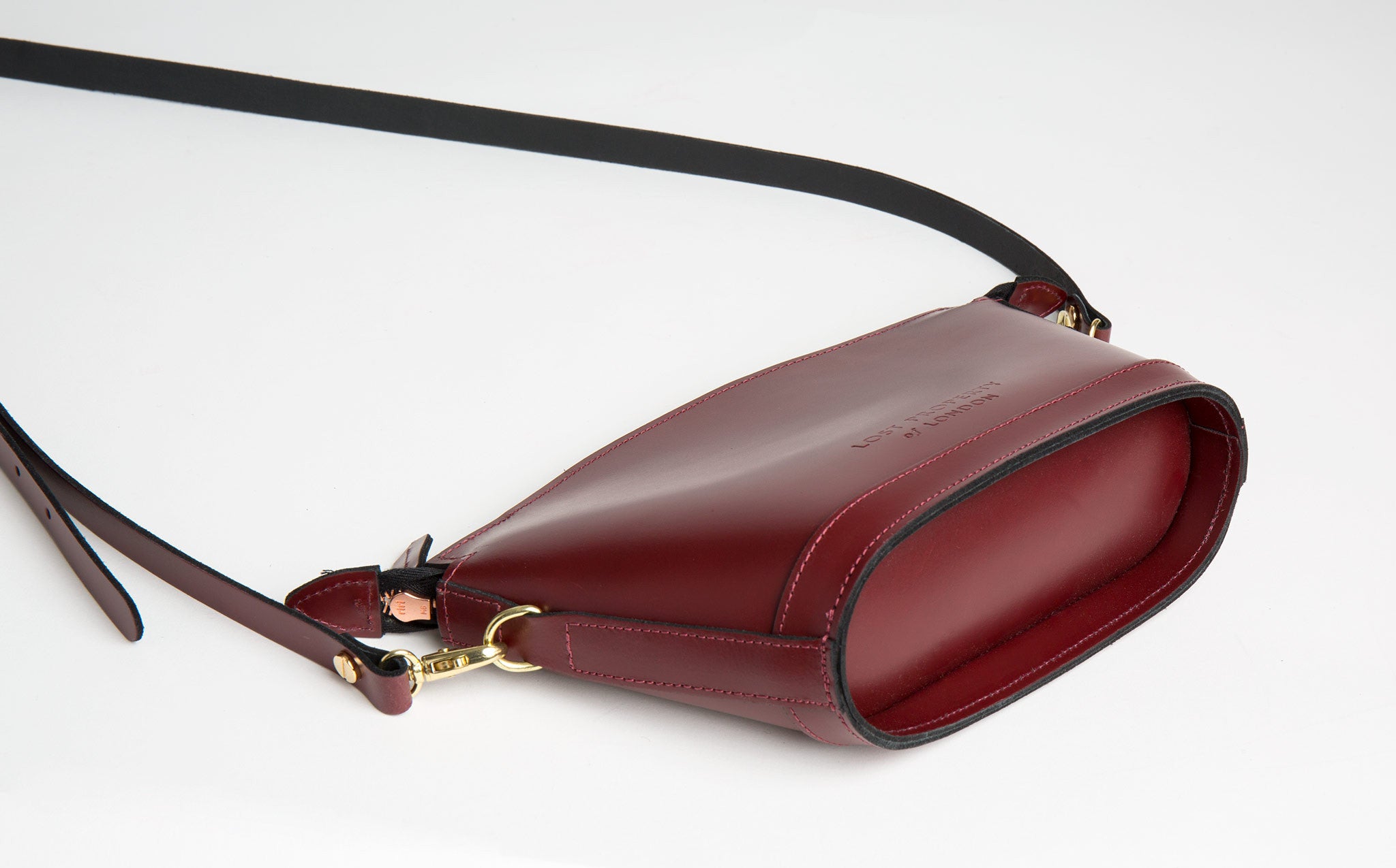A classic small crossbody bag made of high-quality vegetable tanned leather, gold tone top zip and brass hardware. Made in the U.K..