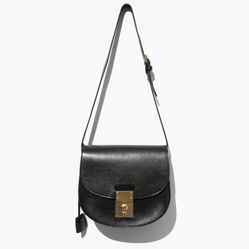 Beautifully crafted crescent shaped shoulder bag with a cast solid brass lock. Black leather exterior fully lined in deep contrasting red leather.