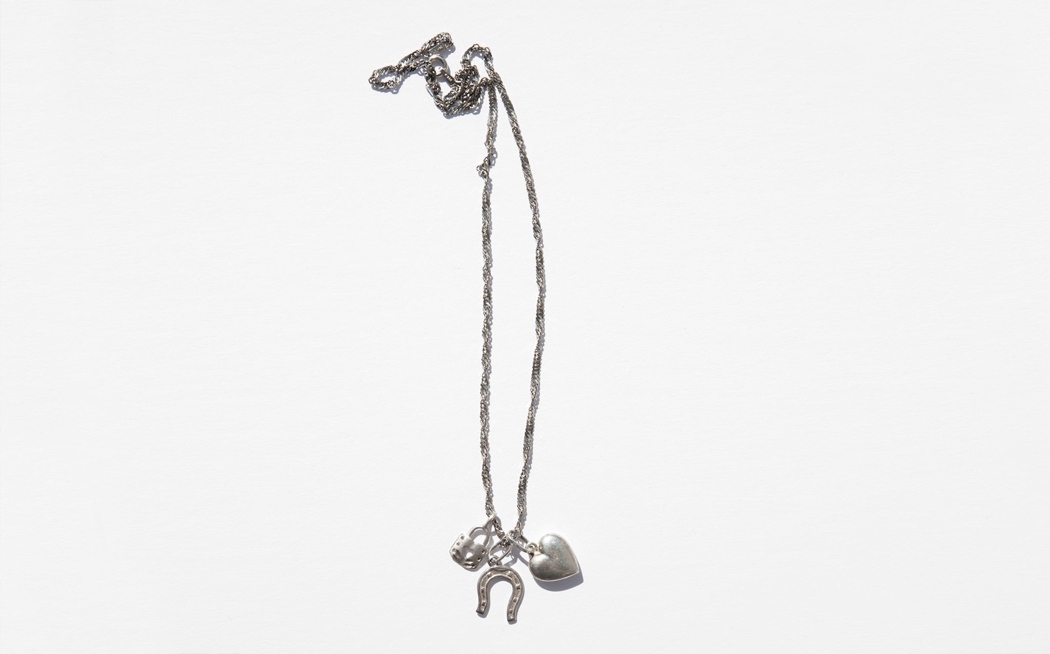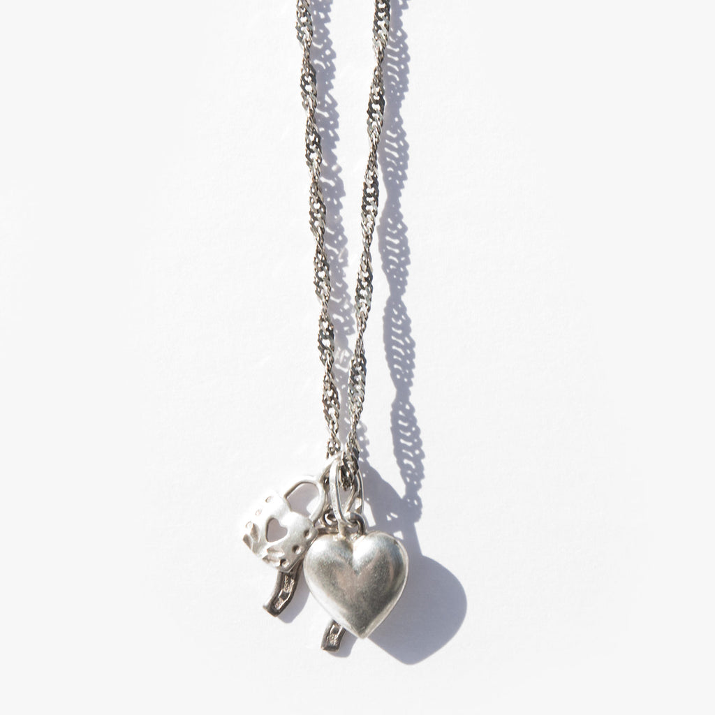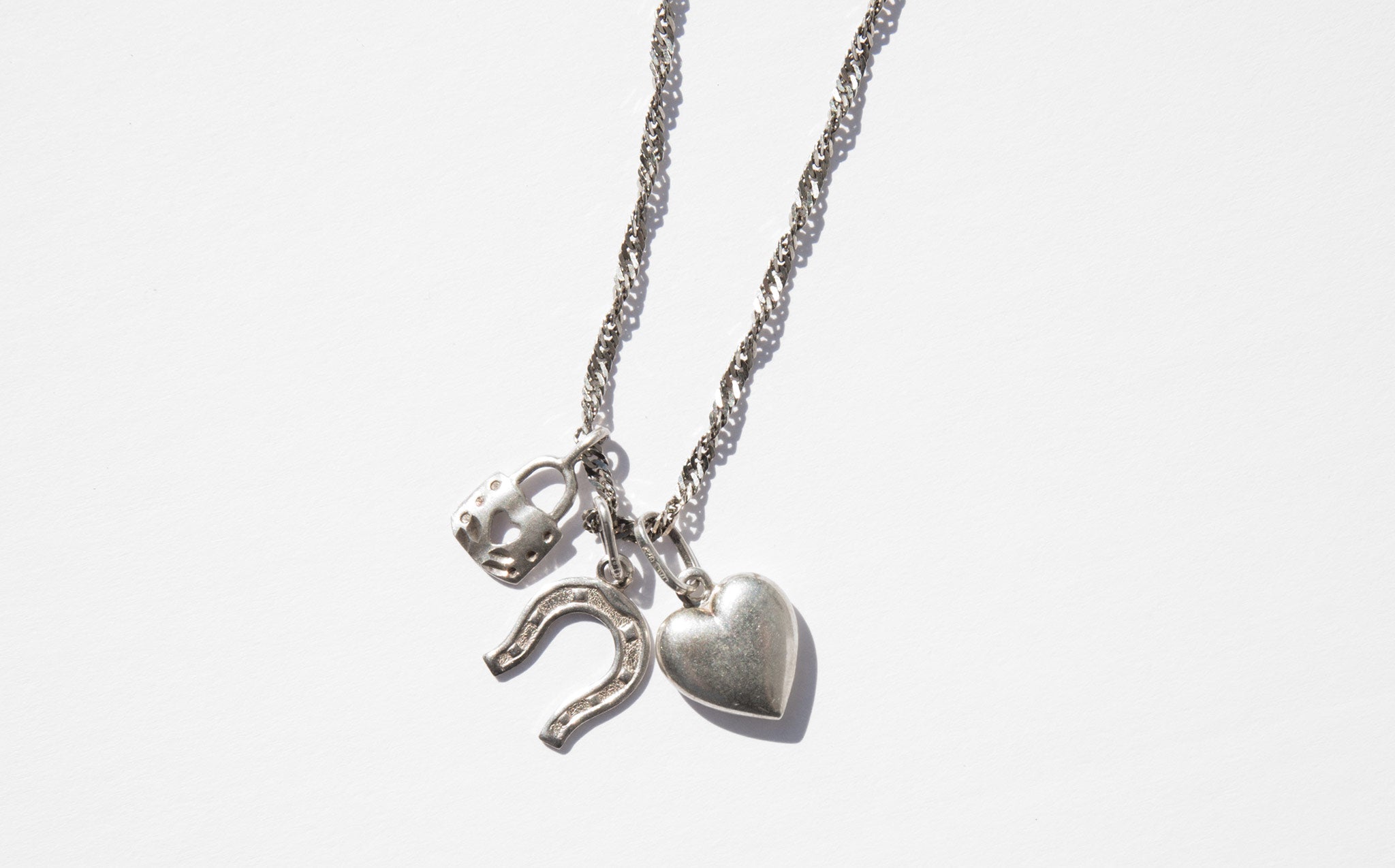 A sweetheart necklace for luck in love. Interesting coiled sterling silver chain with a pretty trio of sterling silver charms. A heart to bring the love, a heart locket to safeguard that love, and a horseshoe for good luck.