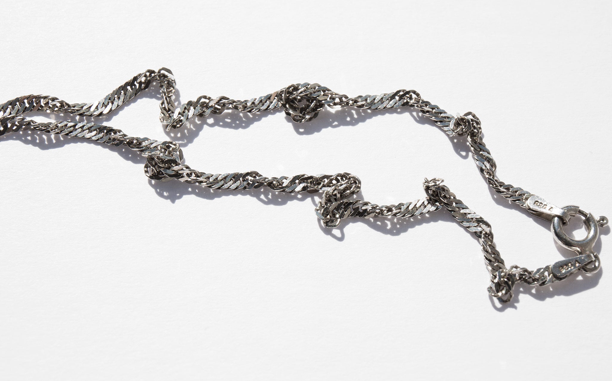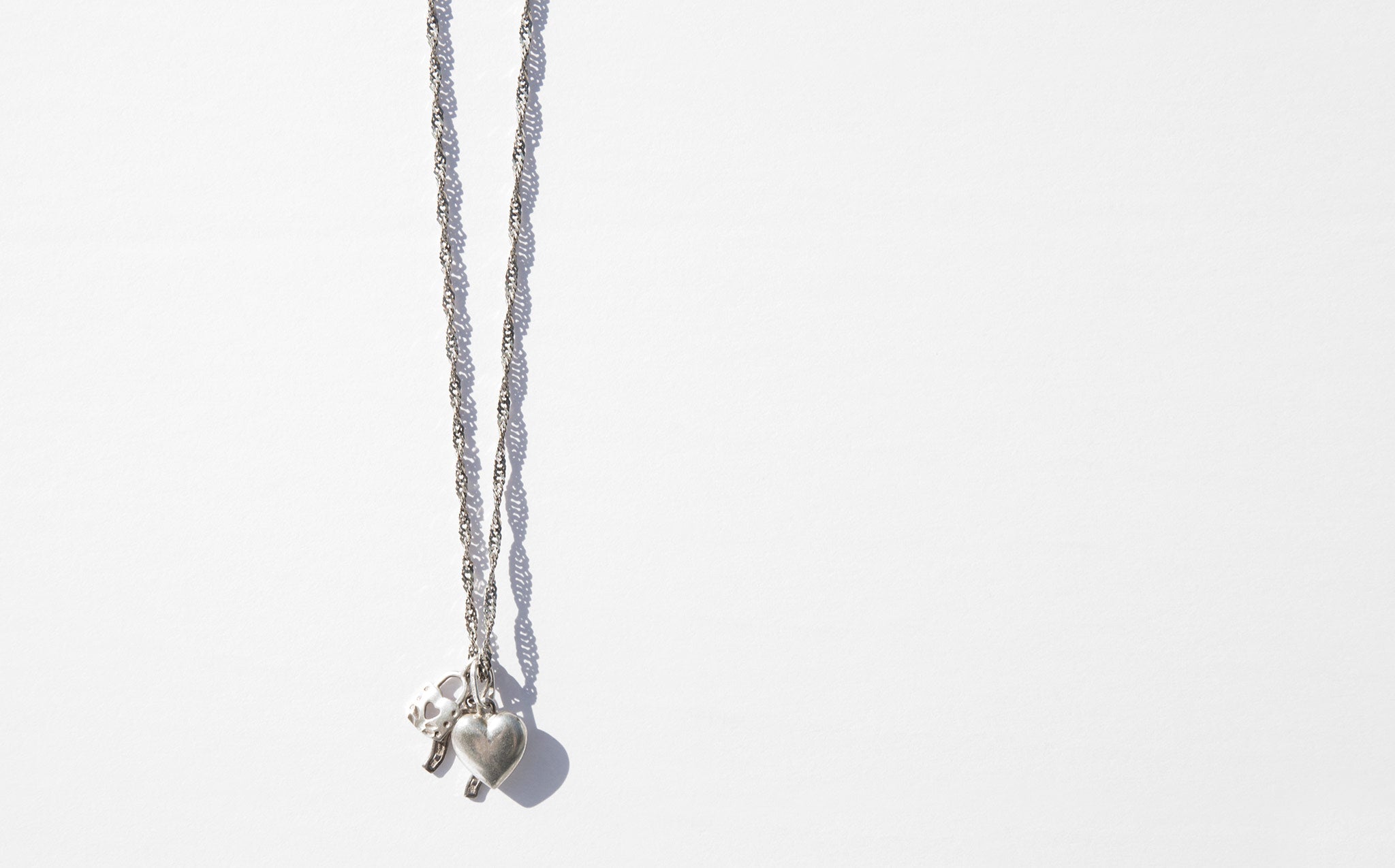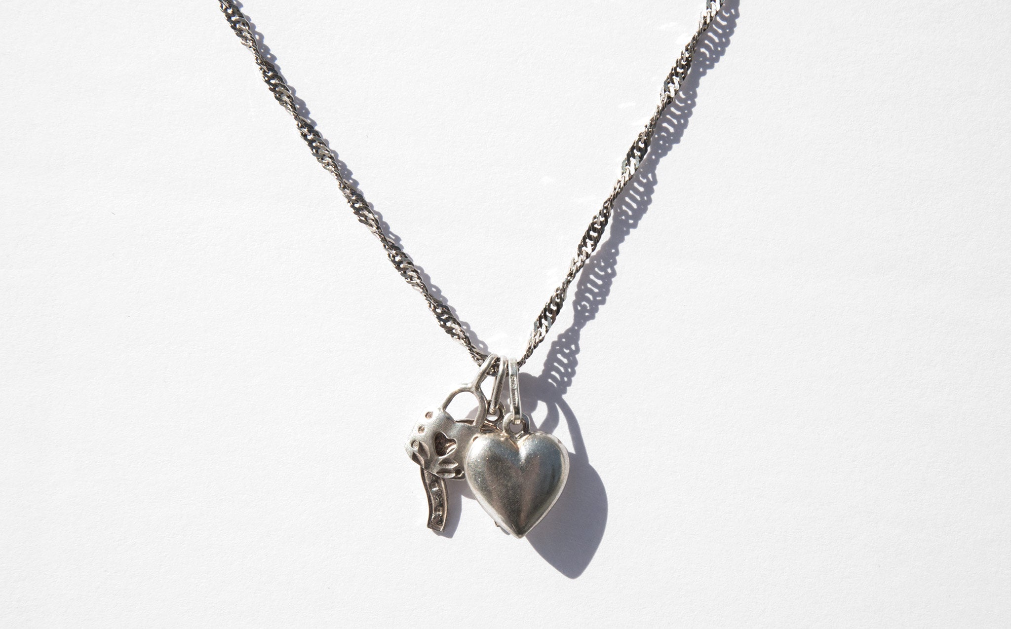 A sweetheart necklace for luck in love. Interesting coiled sterling silver chain with a pretty trio of sterling silver charms. A heart to bring the love, a heart locket to safeguard that love, and a horseshoe for good luck.