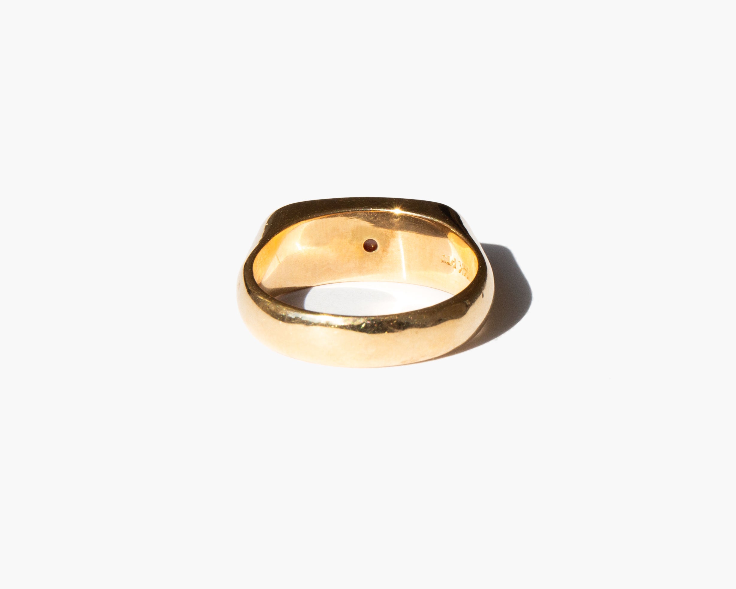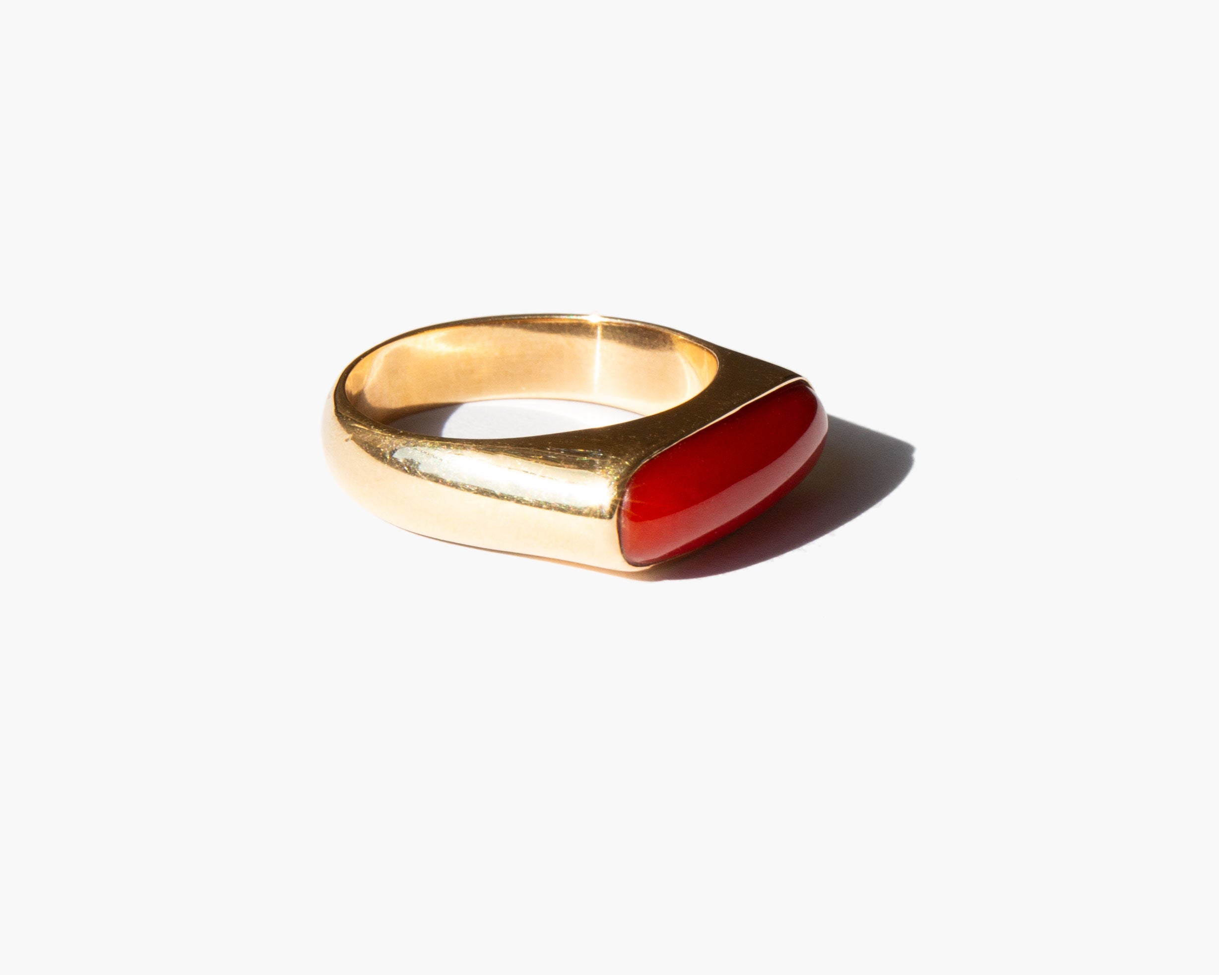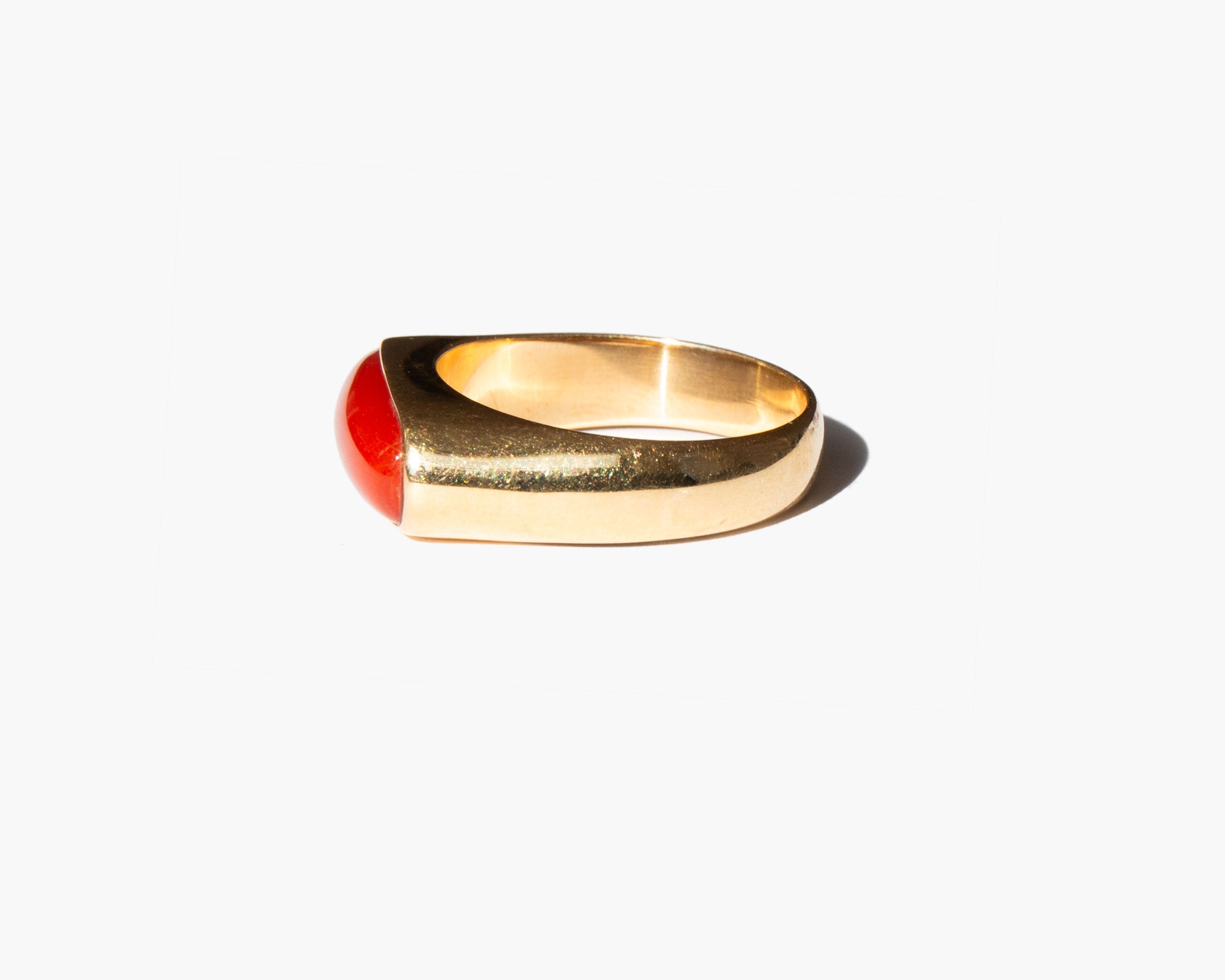 Simple and sculptural 14k gold and Mediterranean coral ring. During the Victorian period red coral was given to children to protect them from becoming a changeling, a fairy child swapped and left in the place of a human child. For this reason you’ll often see antique Victorian rattles with red coral incorporated. Still thought to have protective powers, coral is said to guard against demonic powers, curses, the destructive forces of the Evil Eye and to ward off visitations by succubus or incubus demons. To be effective, the coral should be worn directly against the body so that it can capture and destroy any sorcery before it reaches the wearer of the amulet.