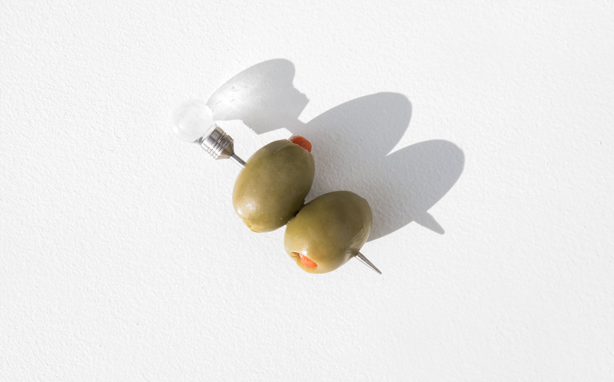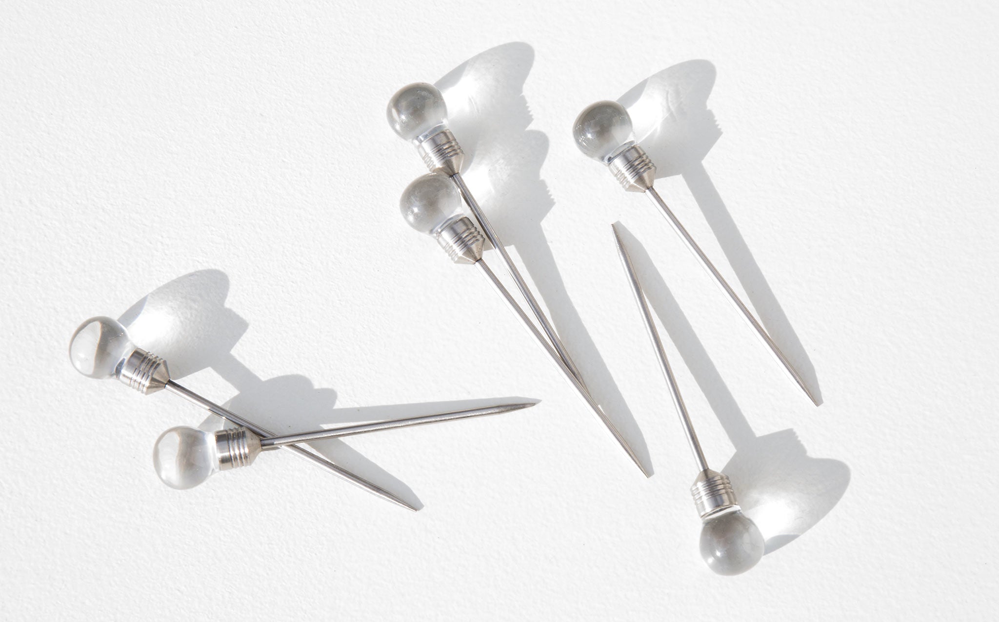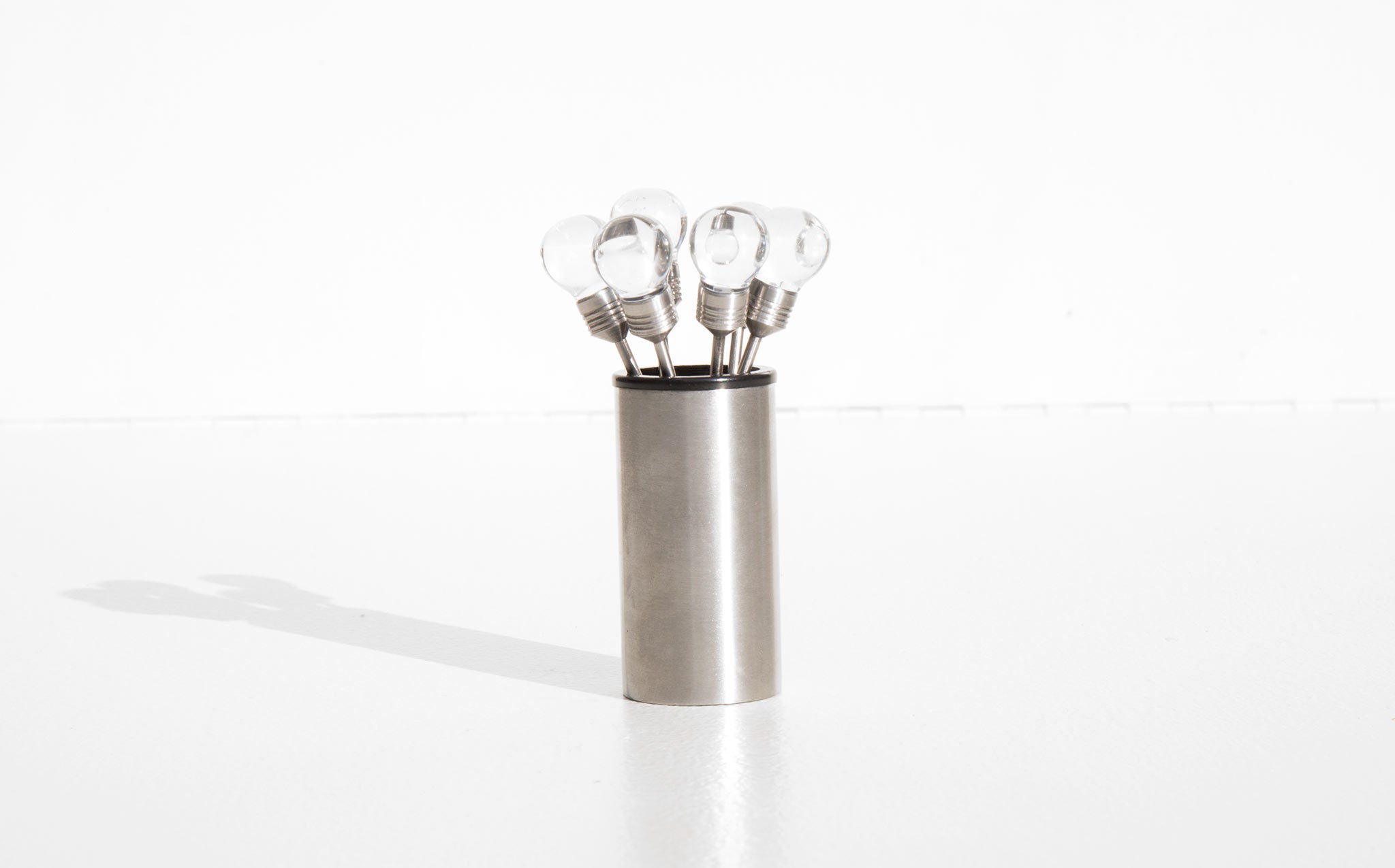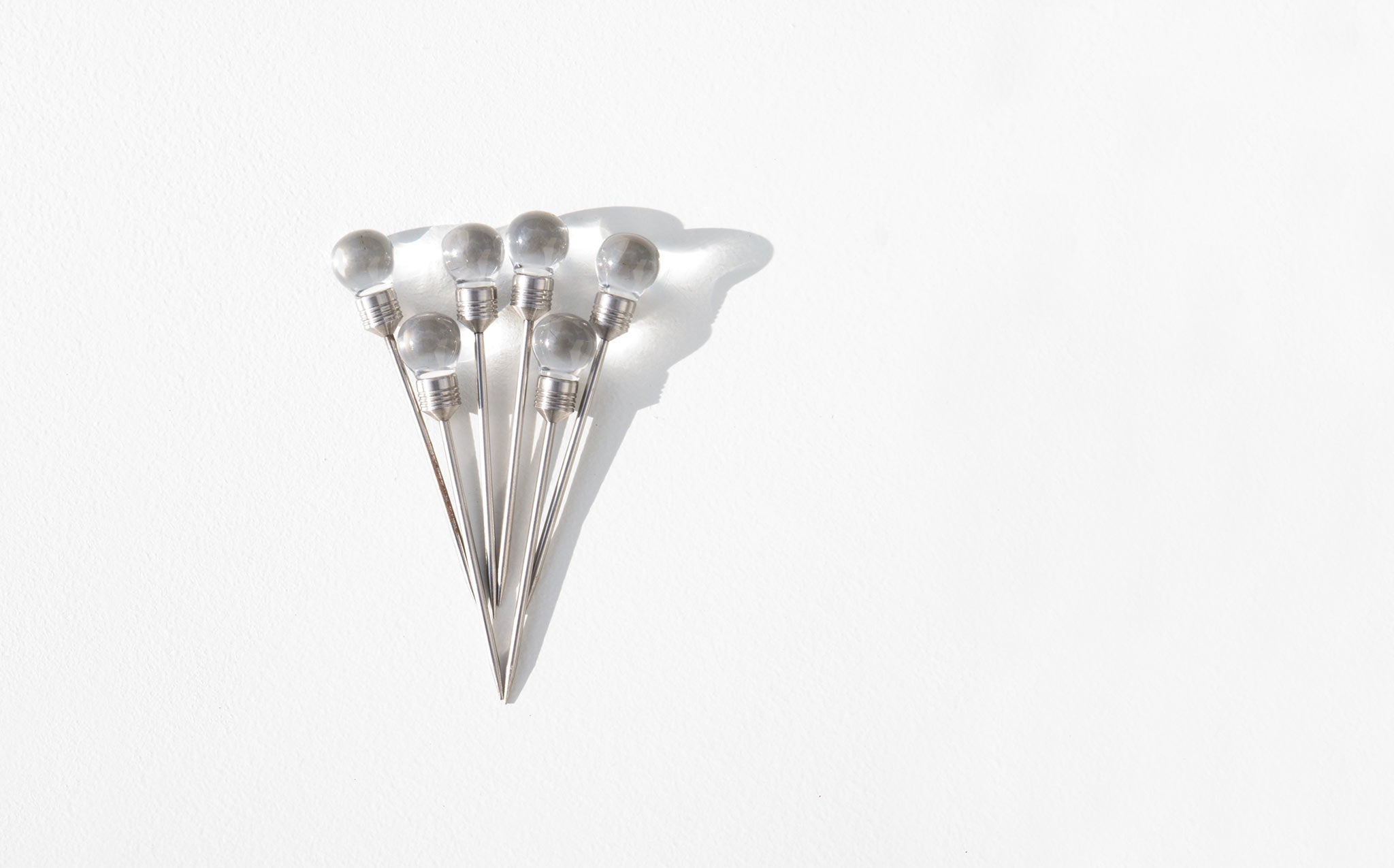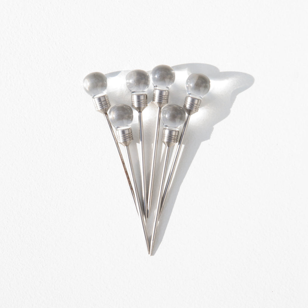 Set of 8 vintage metal cocktail picks topped with lucite orbs.
