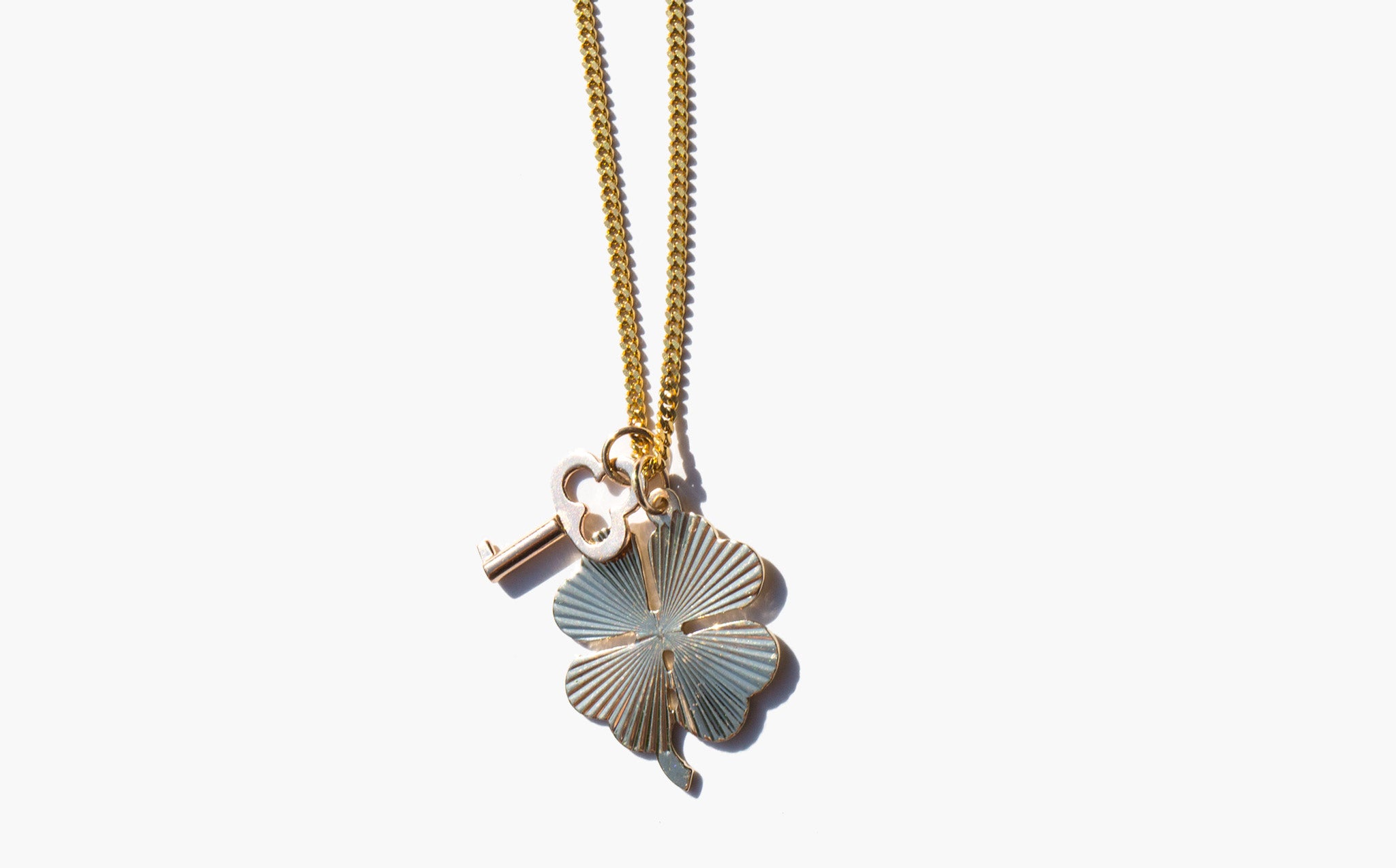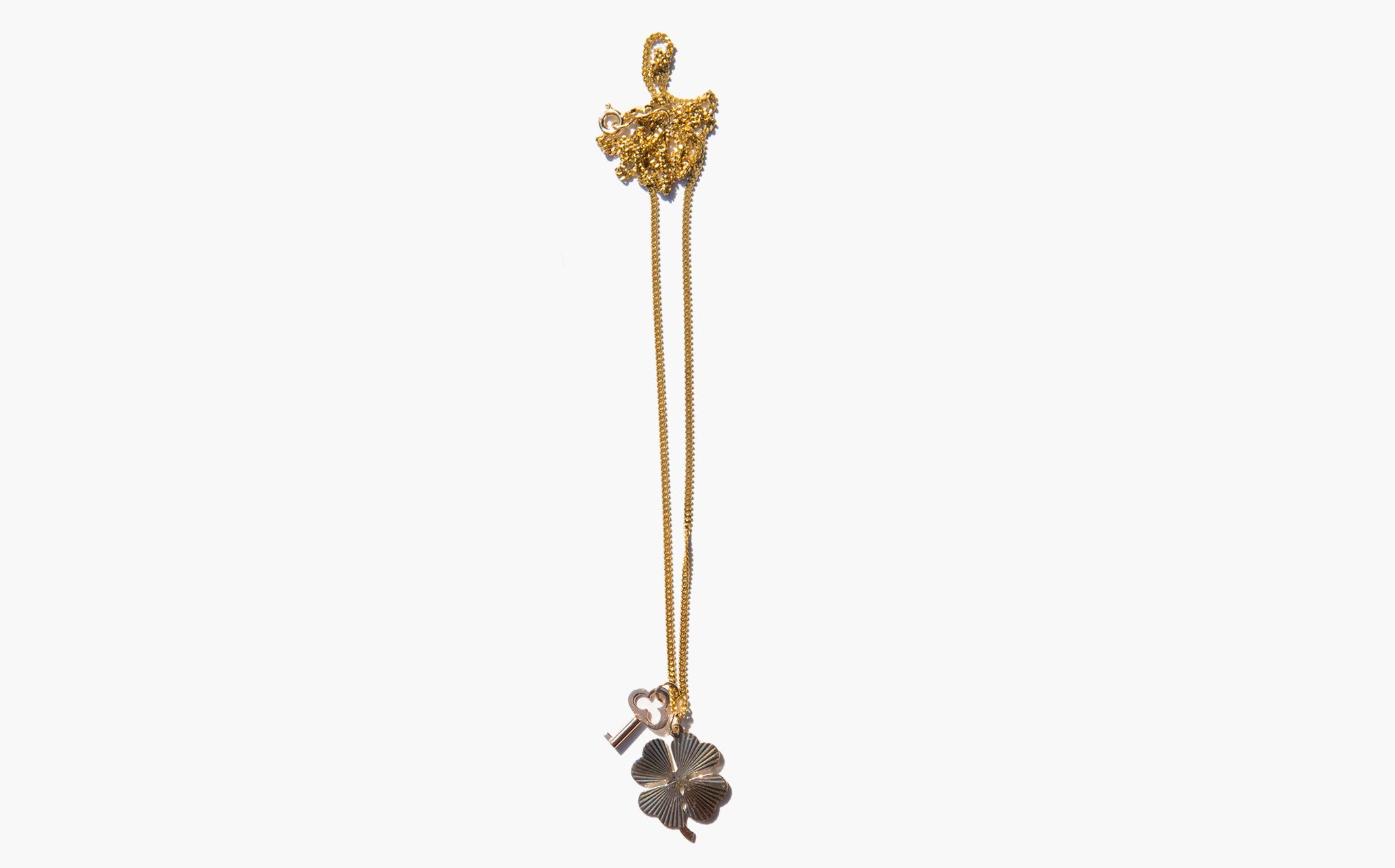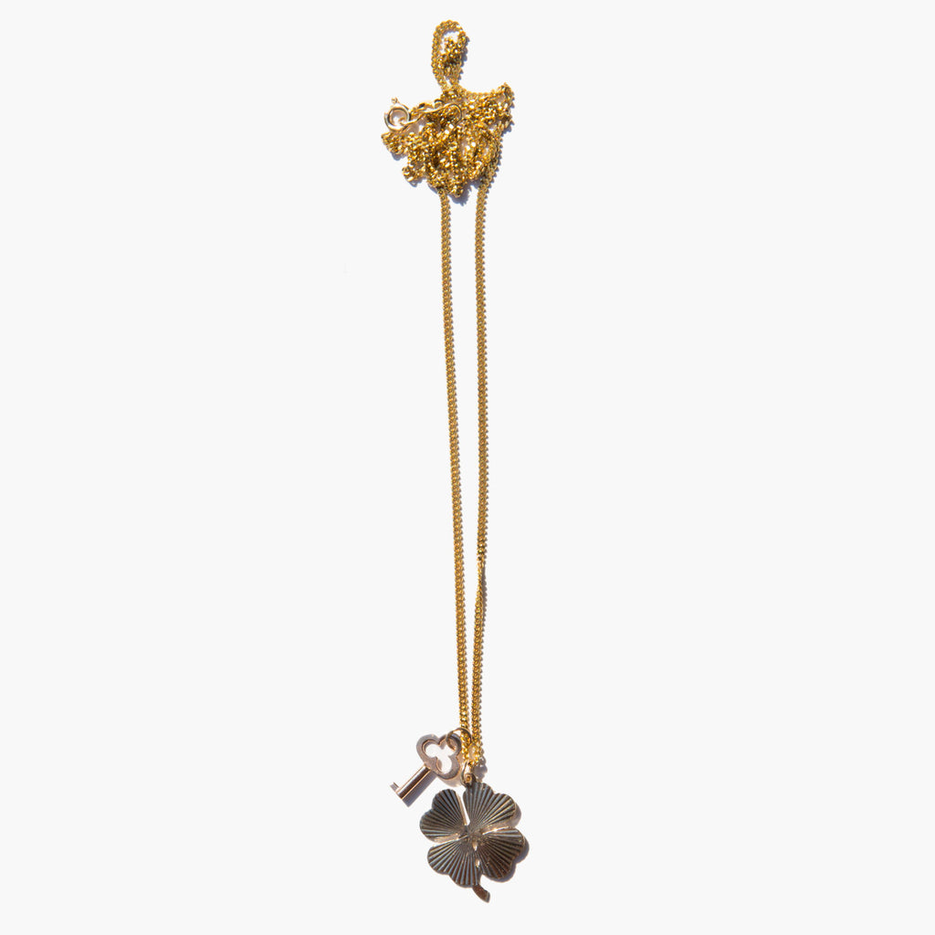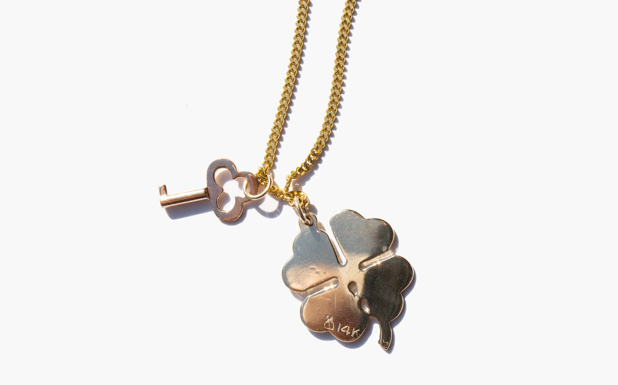 Two 14K amulets – a classic lucky four leaf clover and a petite key to open the door to new opportunities – on a vintage 14K gold chain.