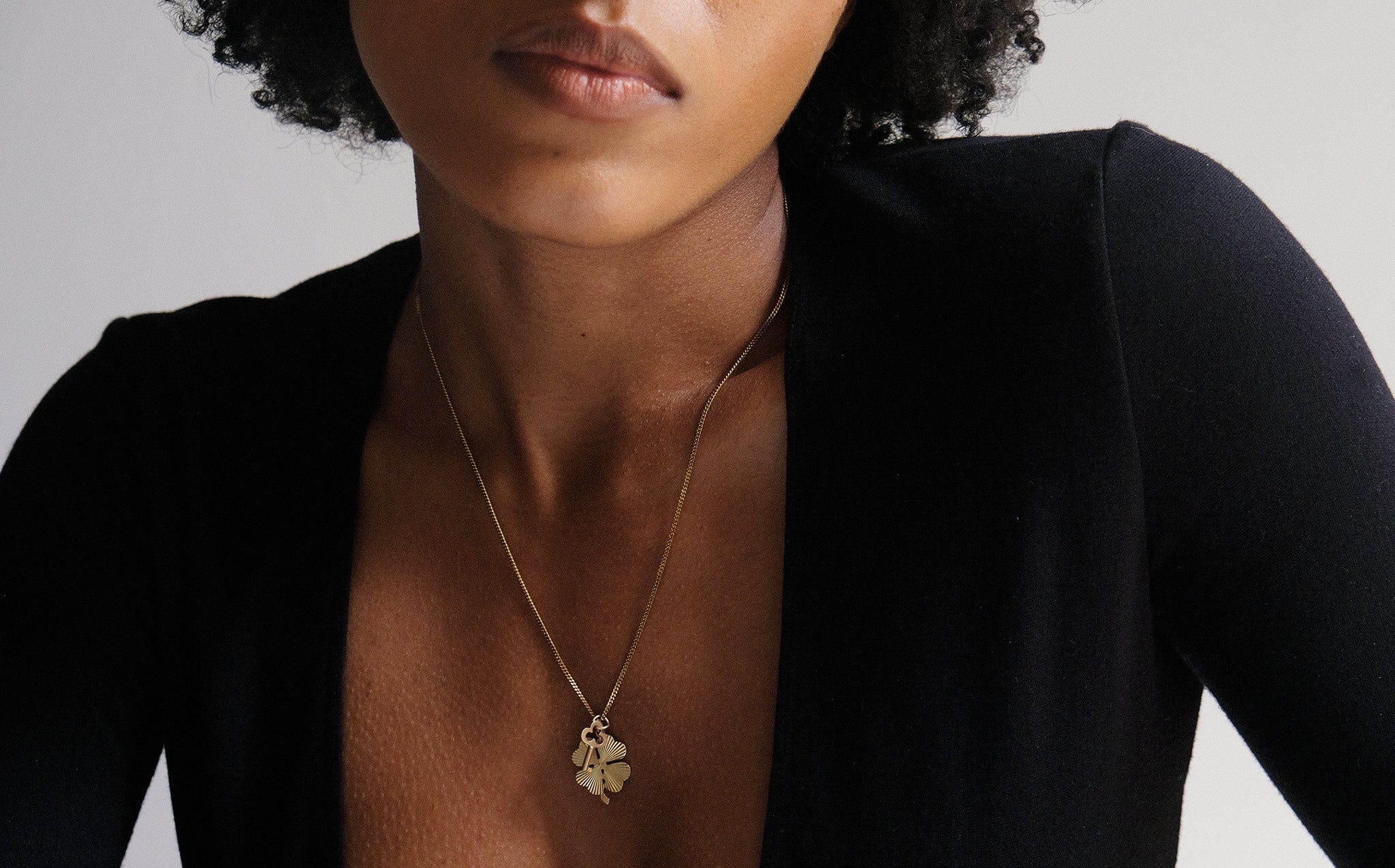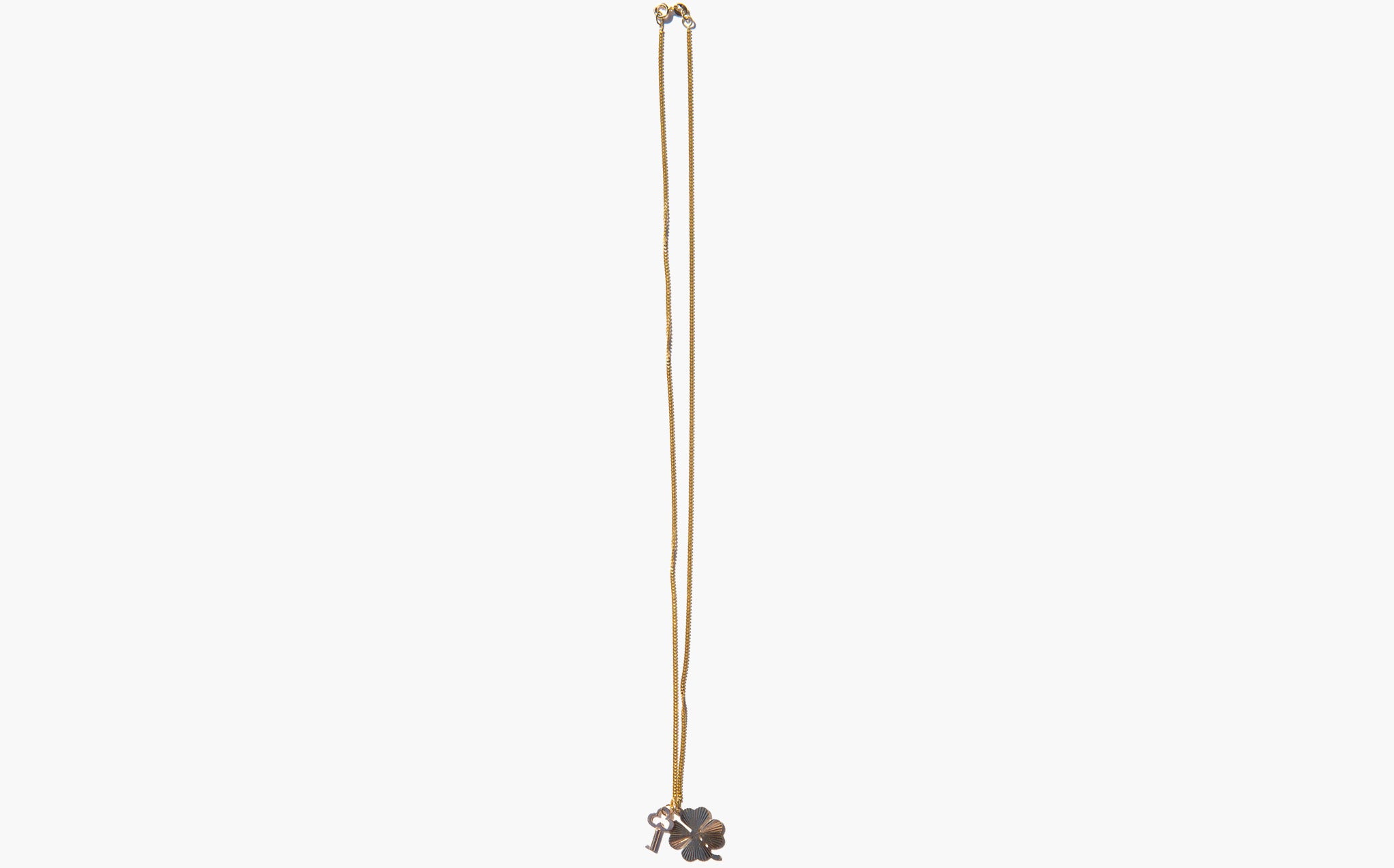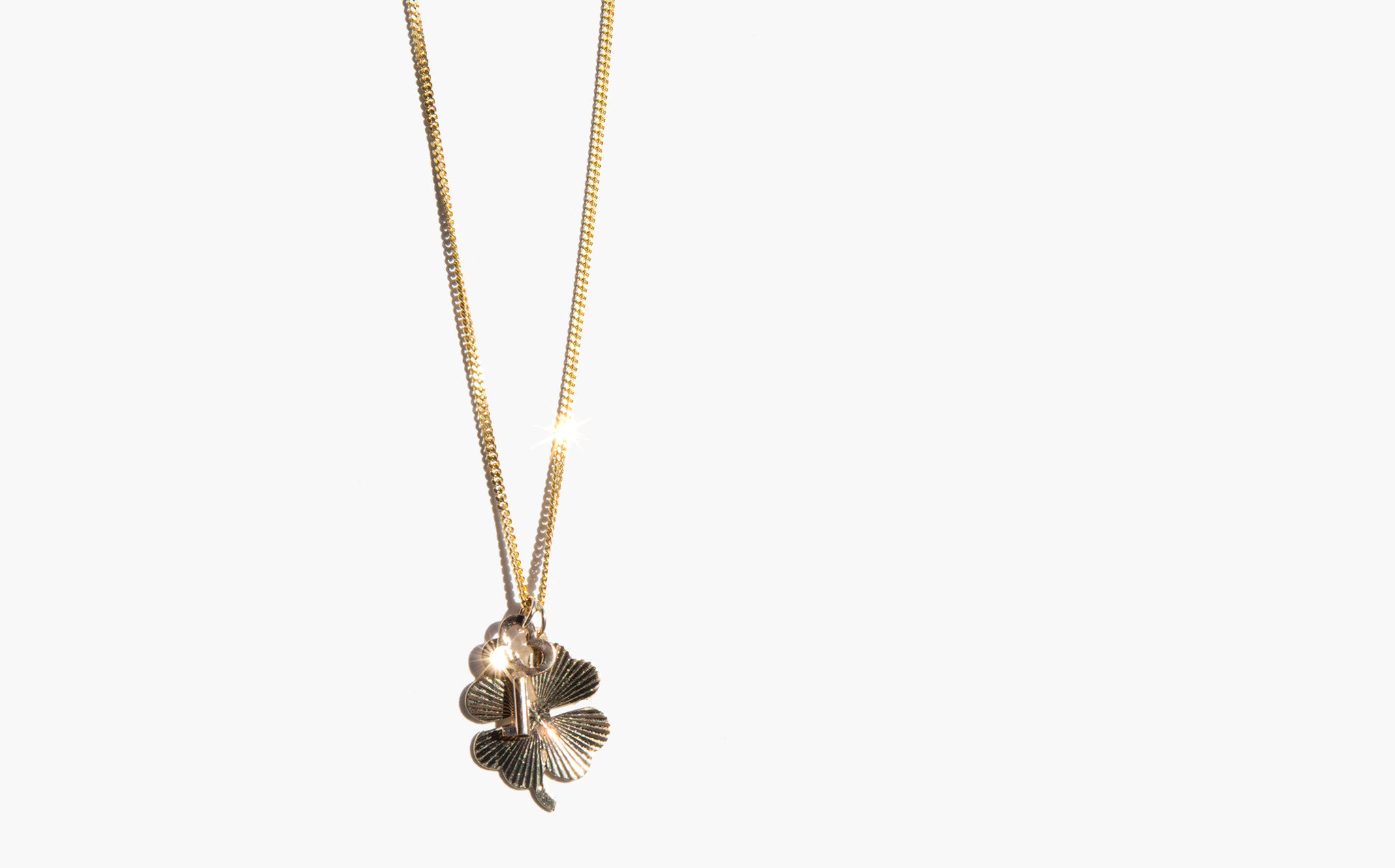 Two 14K amulets – a classic lucky four leaf clover and a petite key to open the door to new opportunities – on a vintage 14K gold chain.