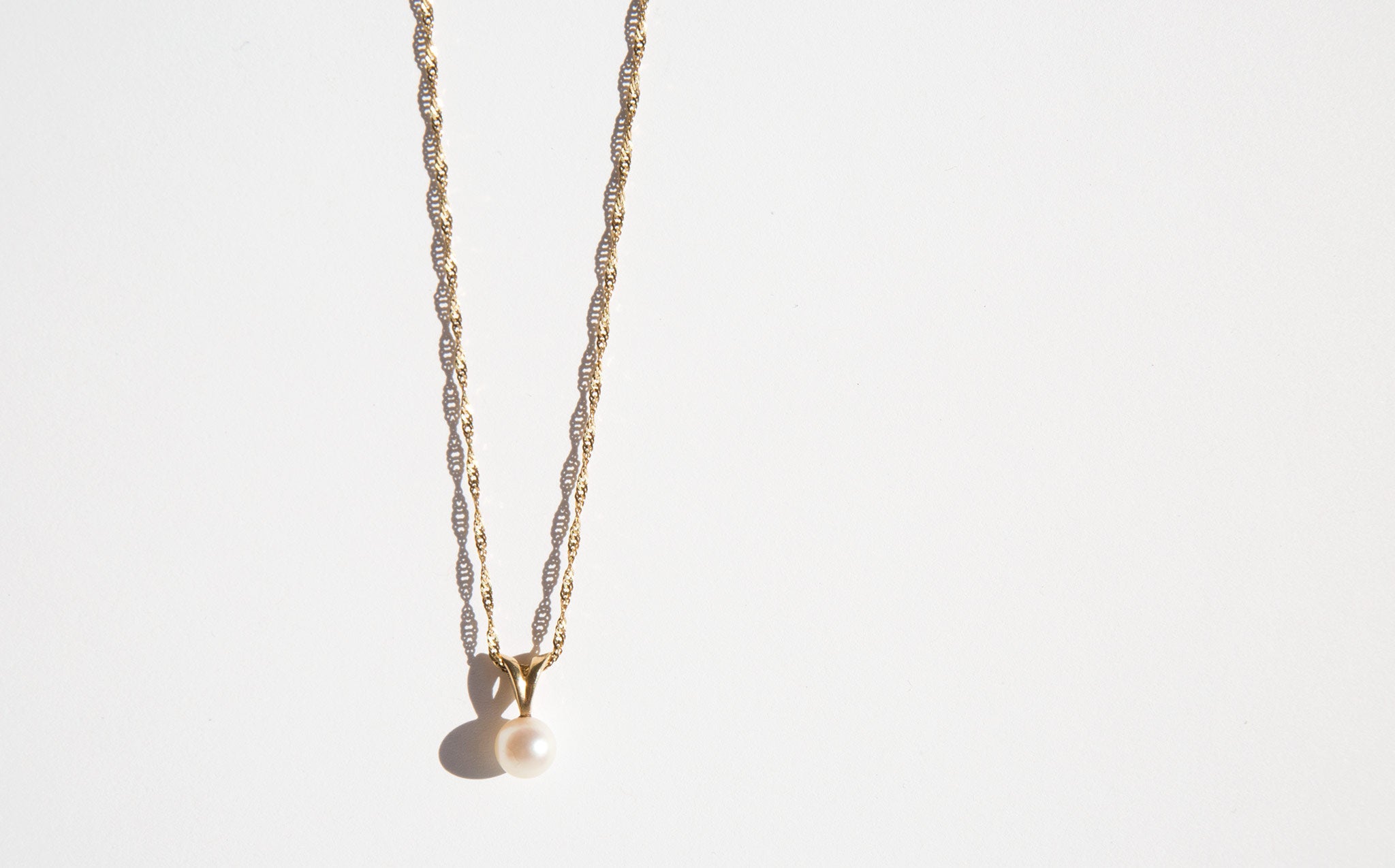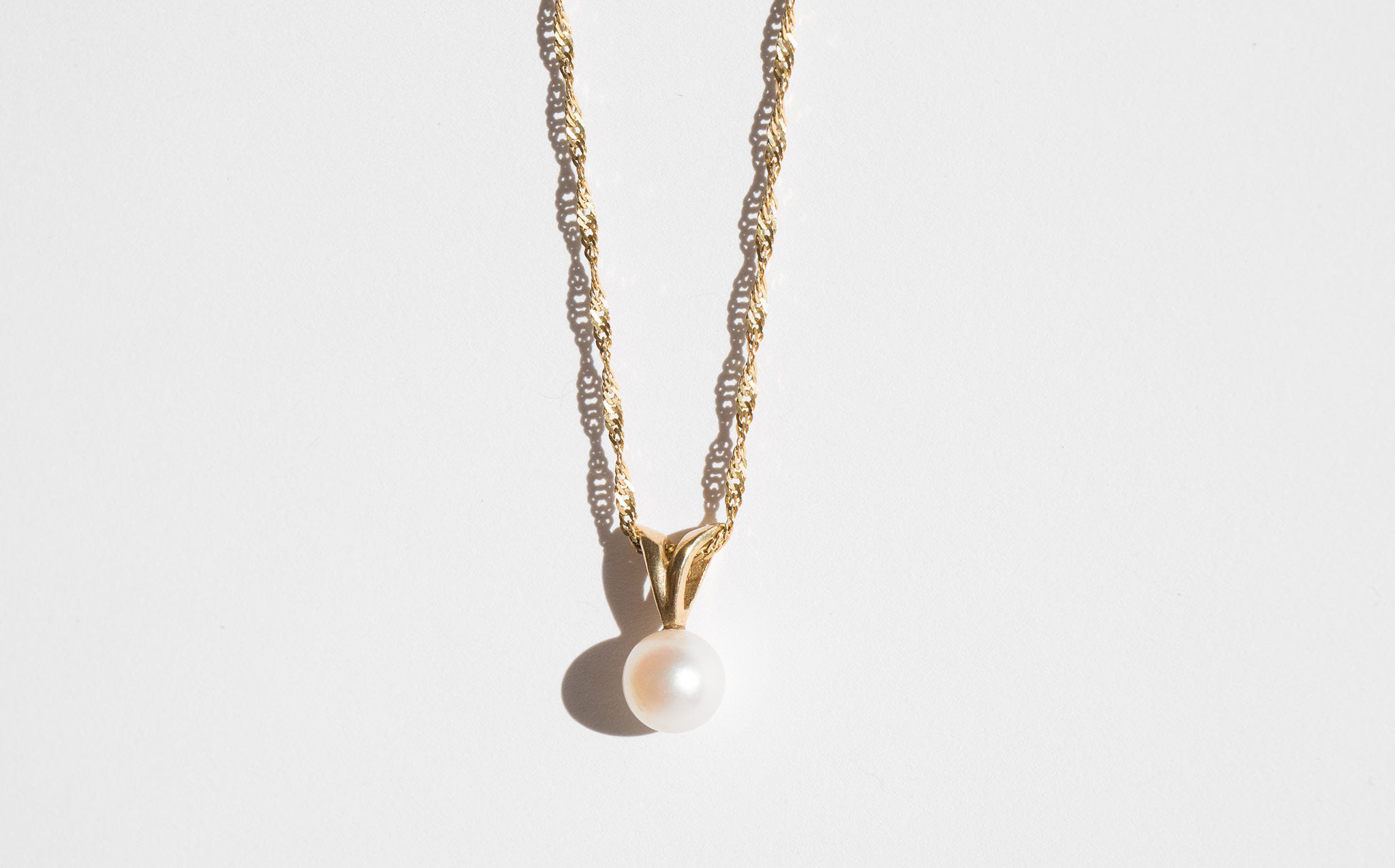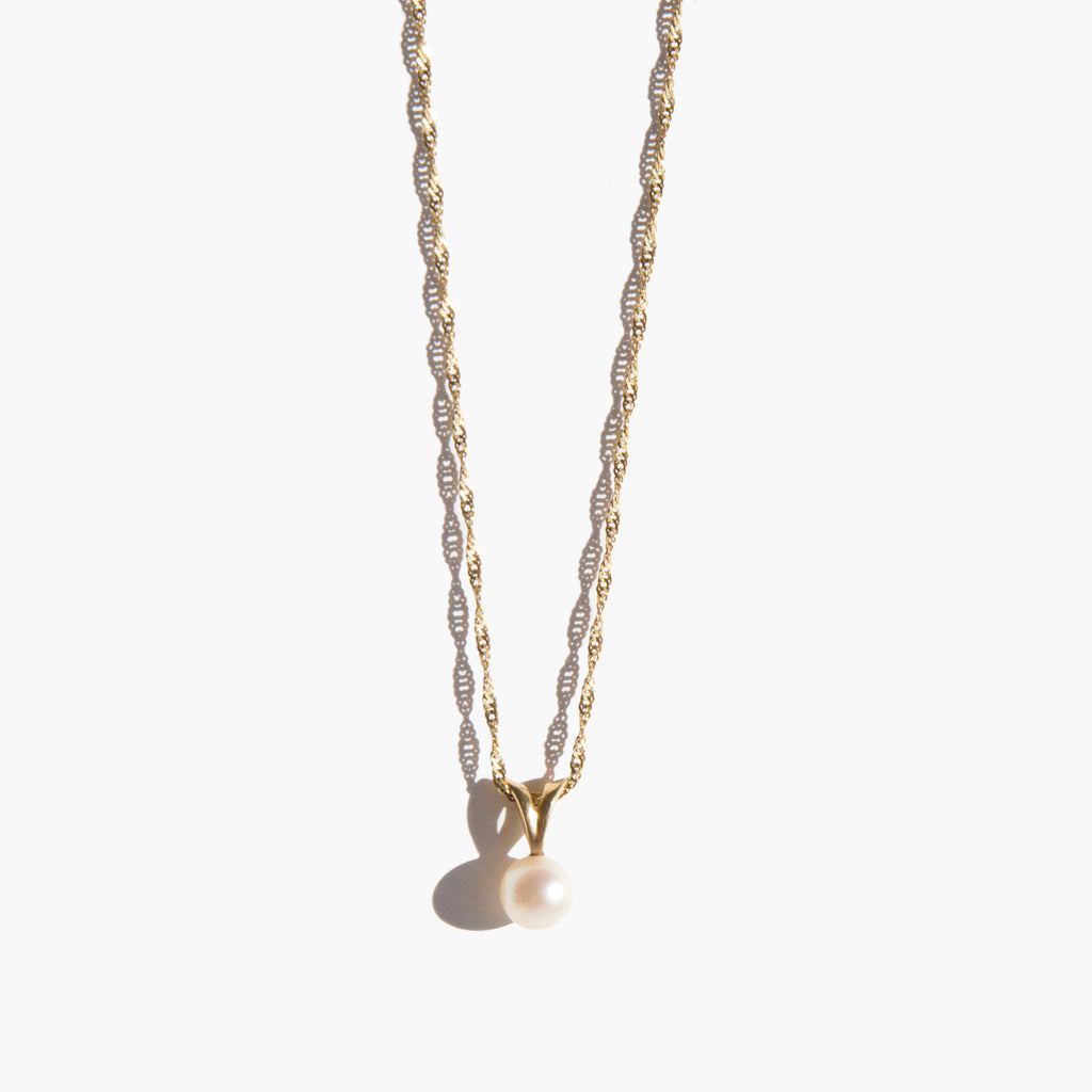 A single spherical pearl dangling elegantly from a sparking 14k gold twisted link chain.
