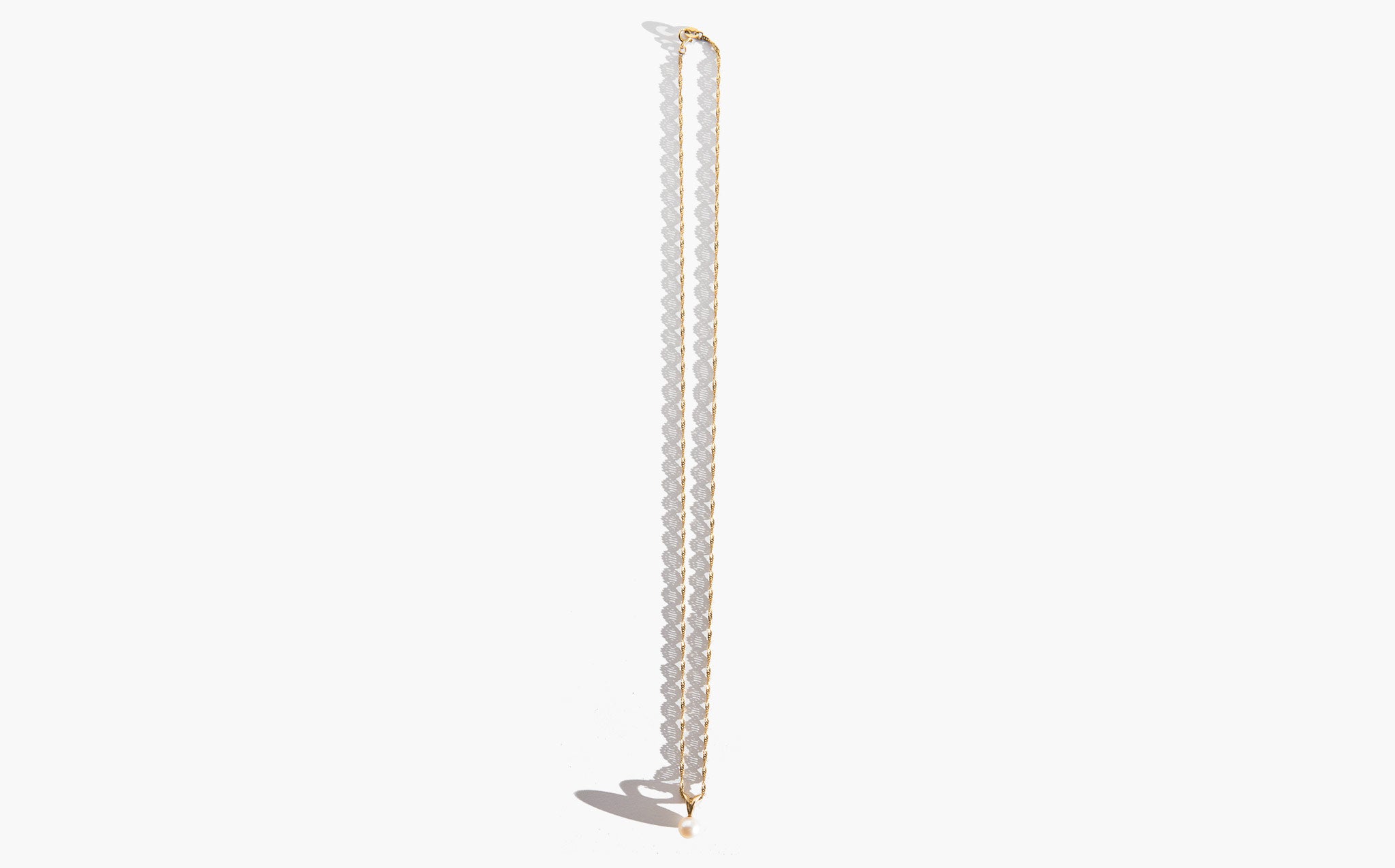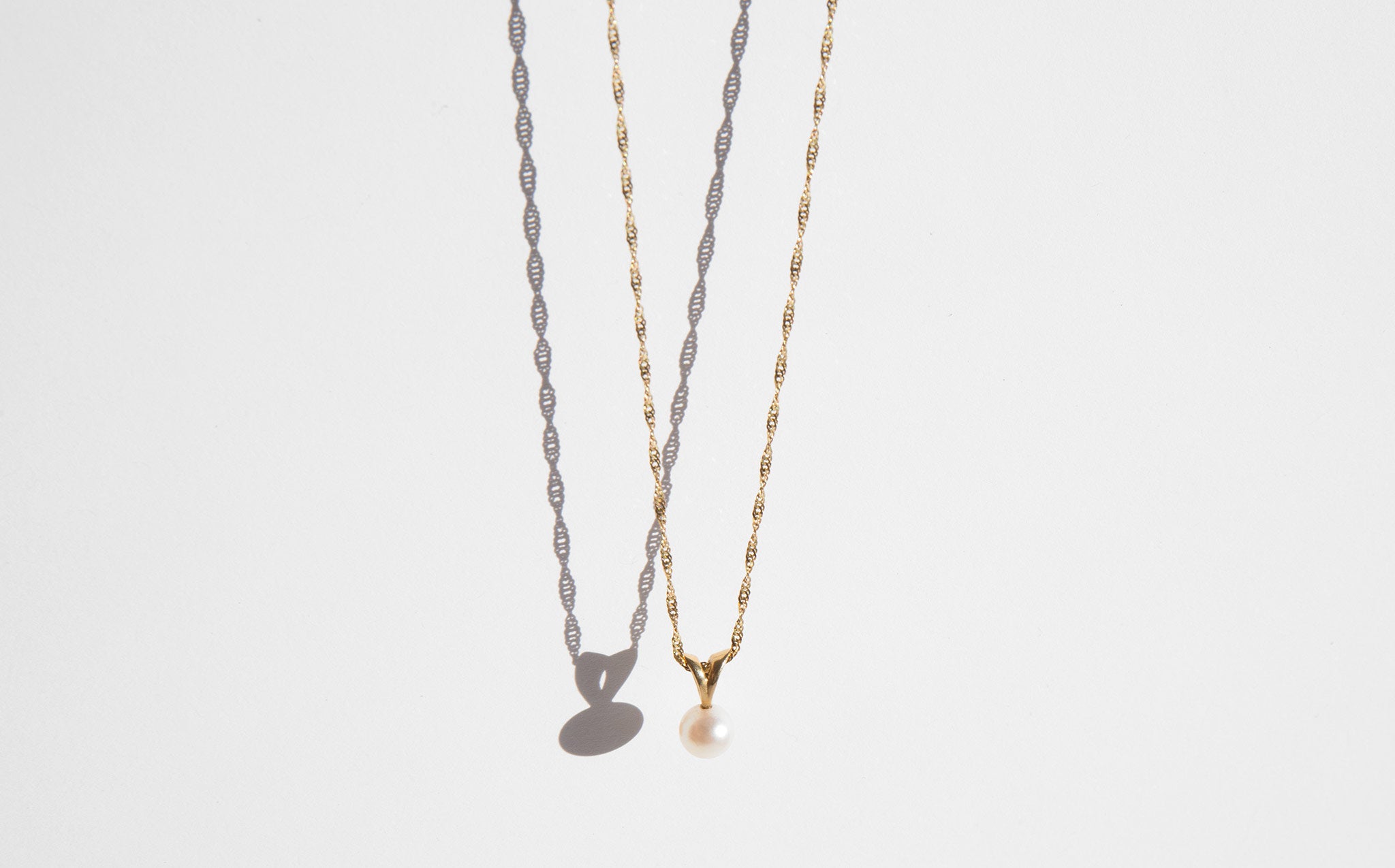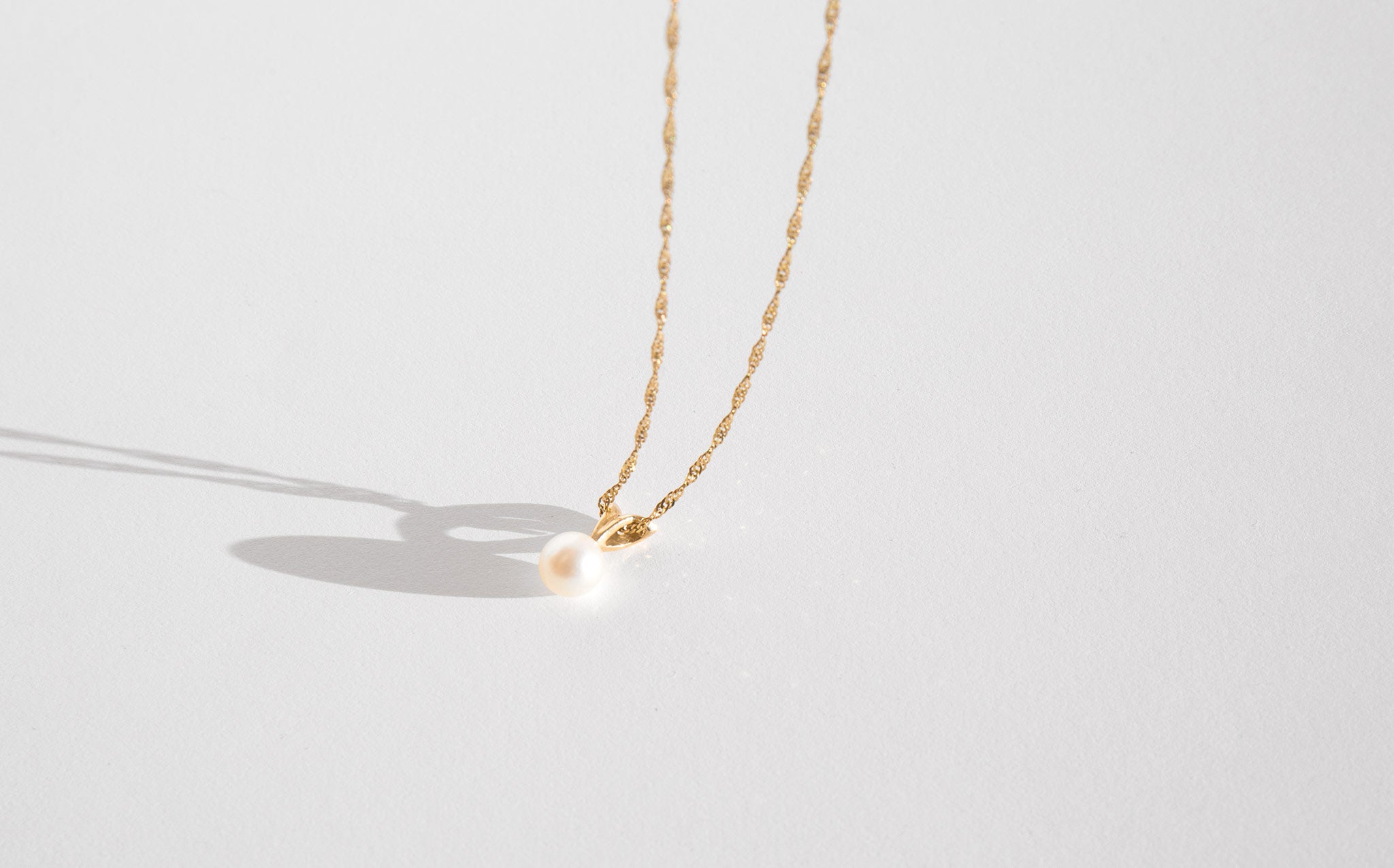 A single spherical pearl dangling elegantly from a sparking 14k gold twisted link chain.