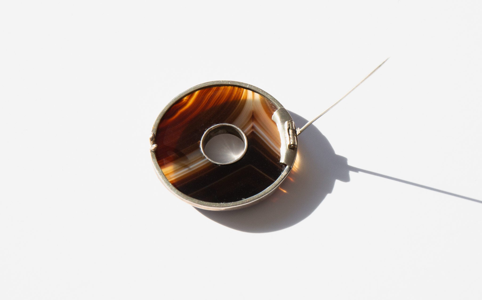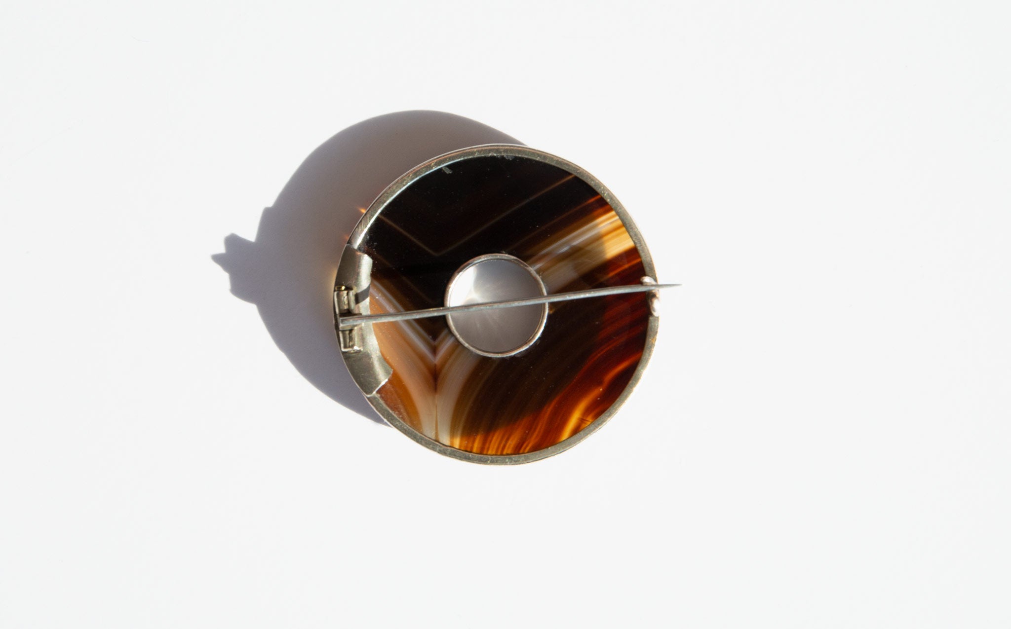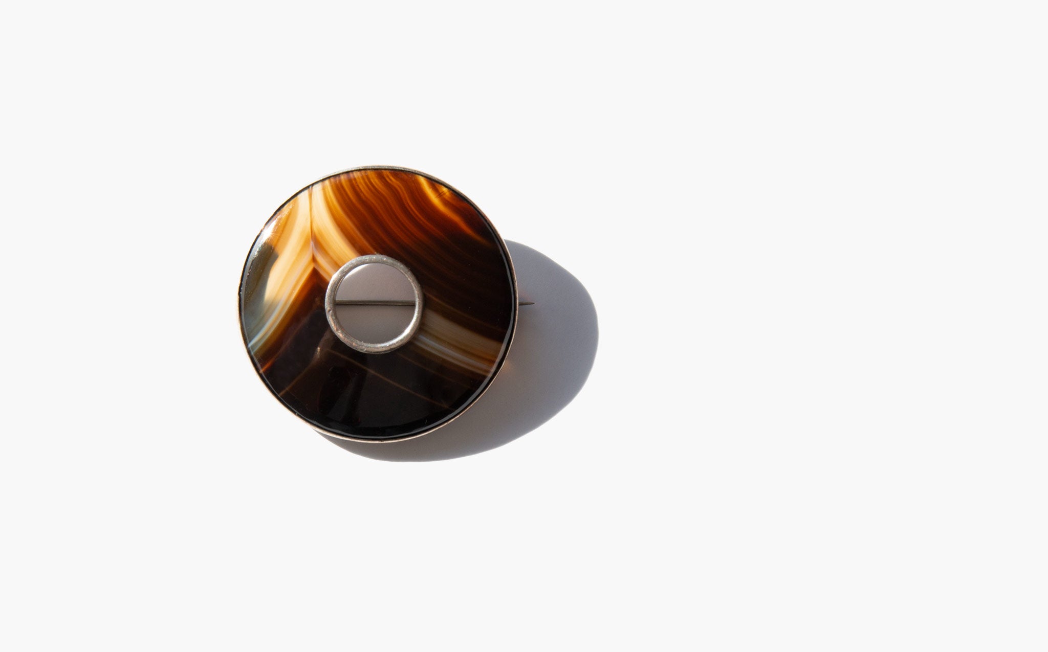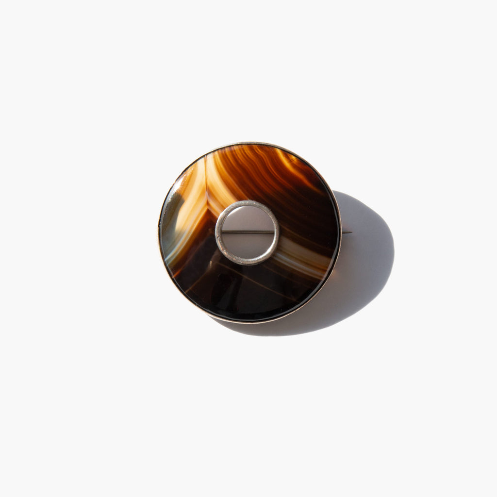 Beautifully banded, sculptural agate and sterling silver brooch.