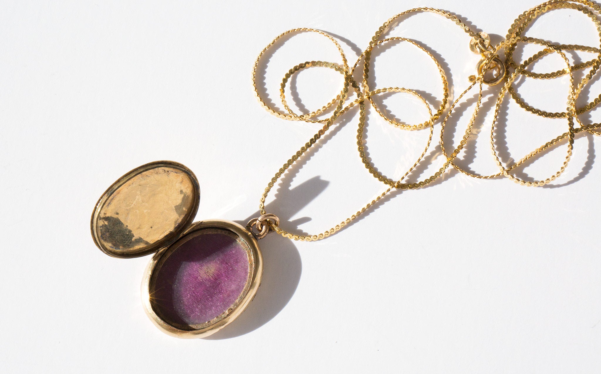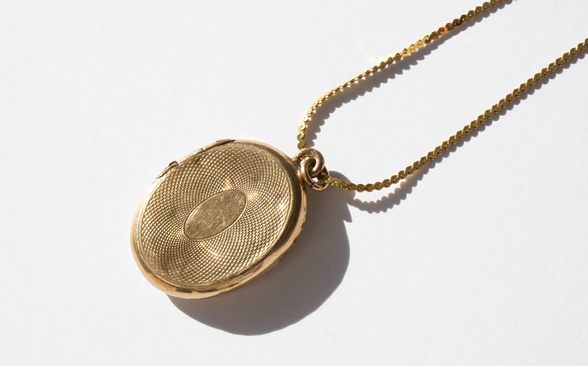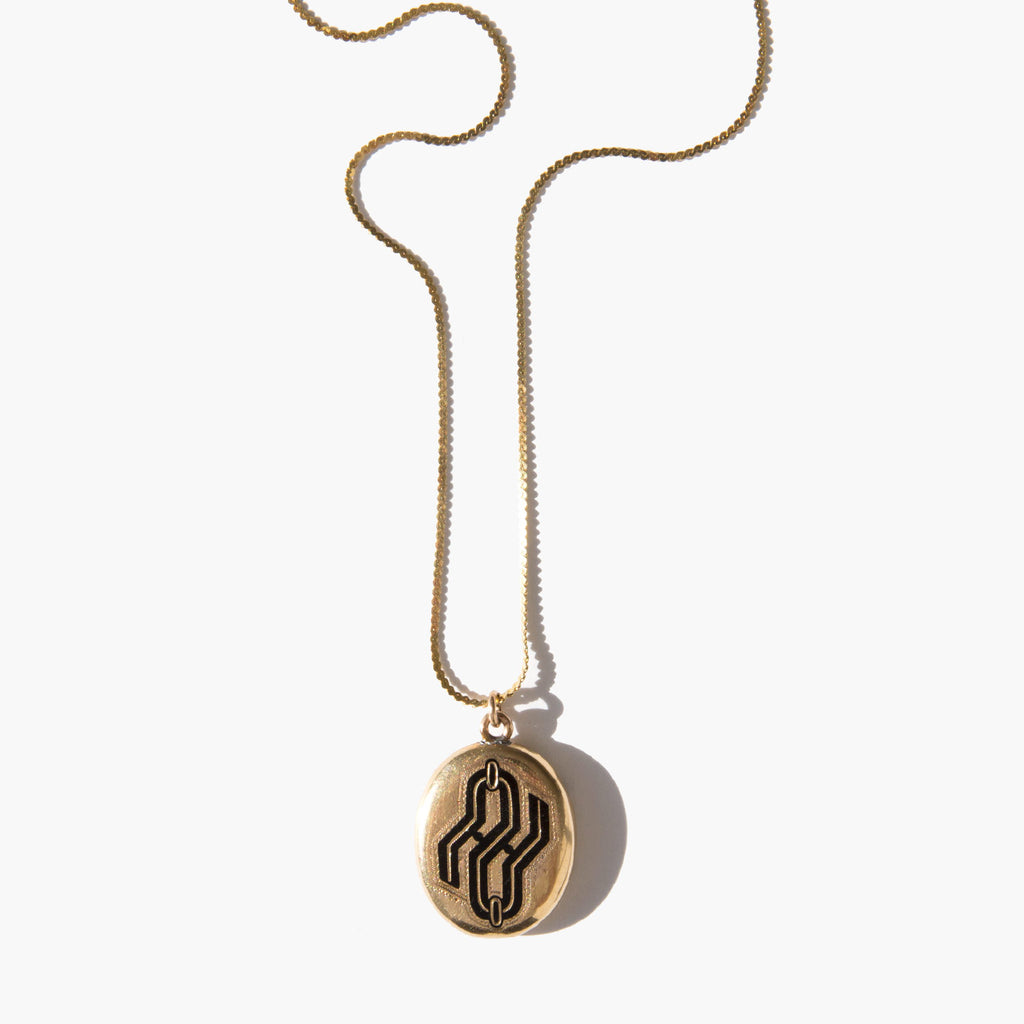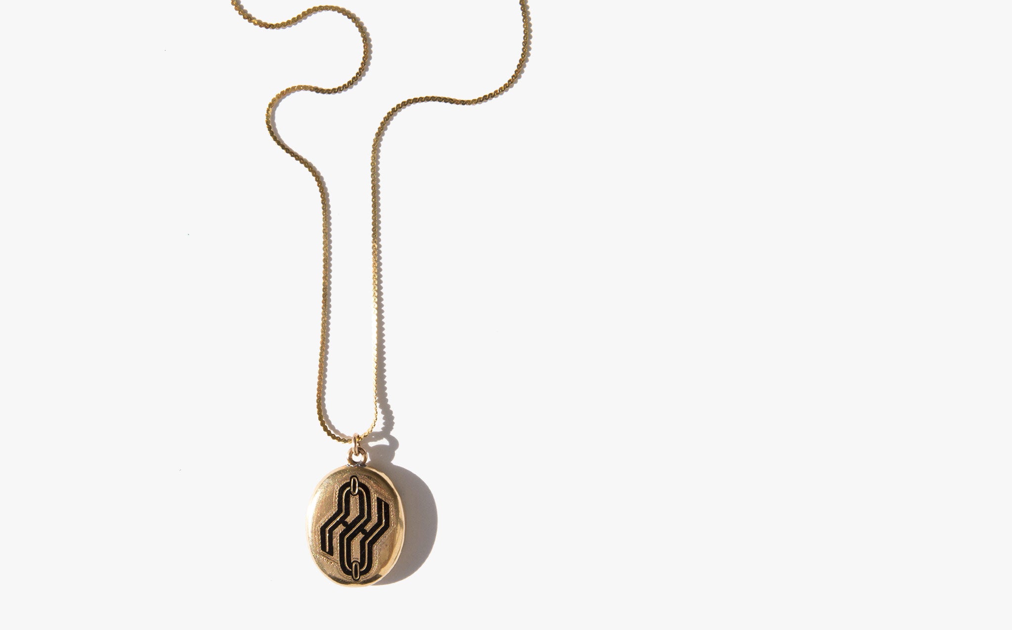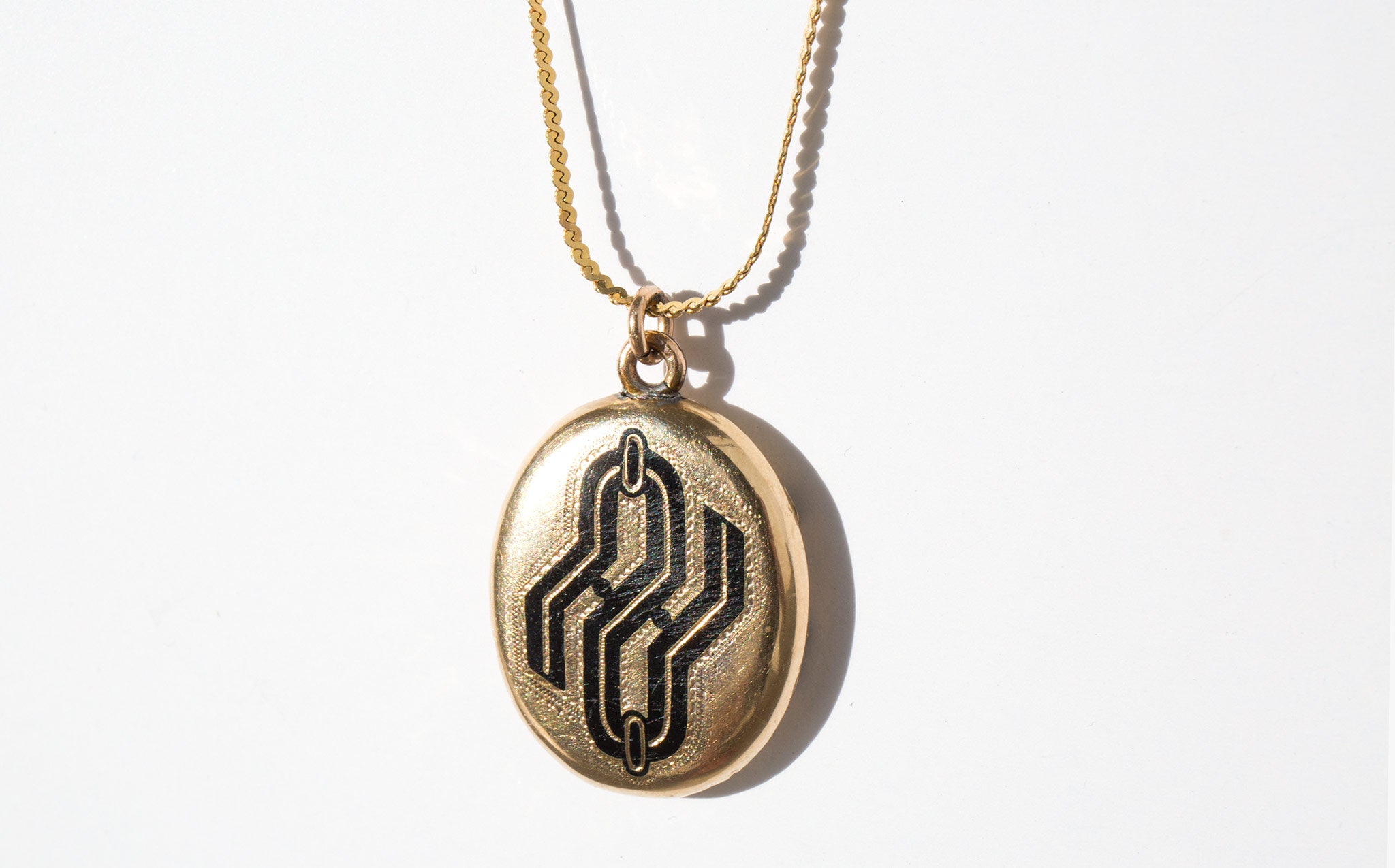 Art Deco 14k gold and black enamel locket on a long, sparkling 14k gold chain that can be worn loose or double wrapped.