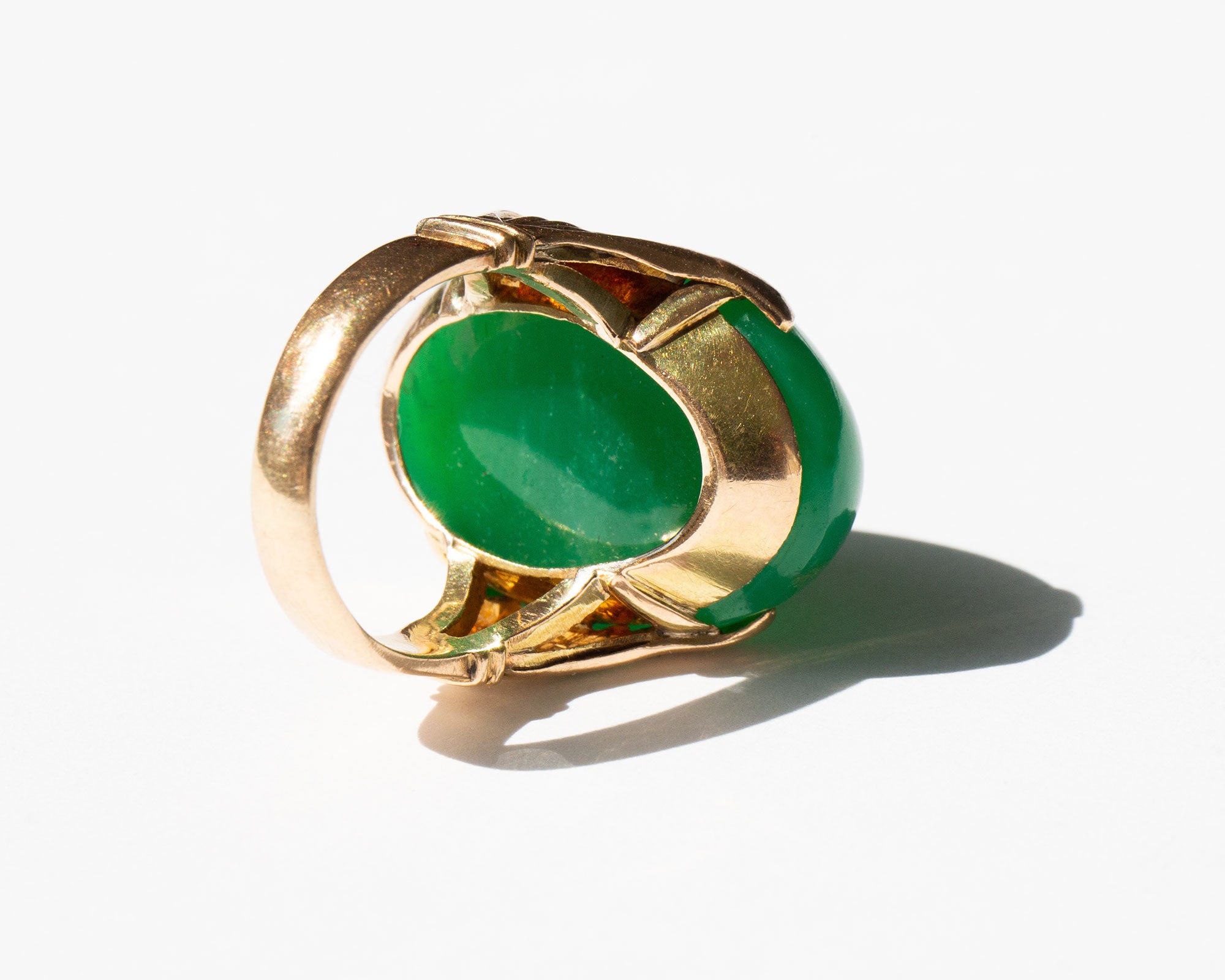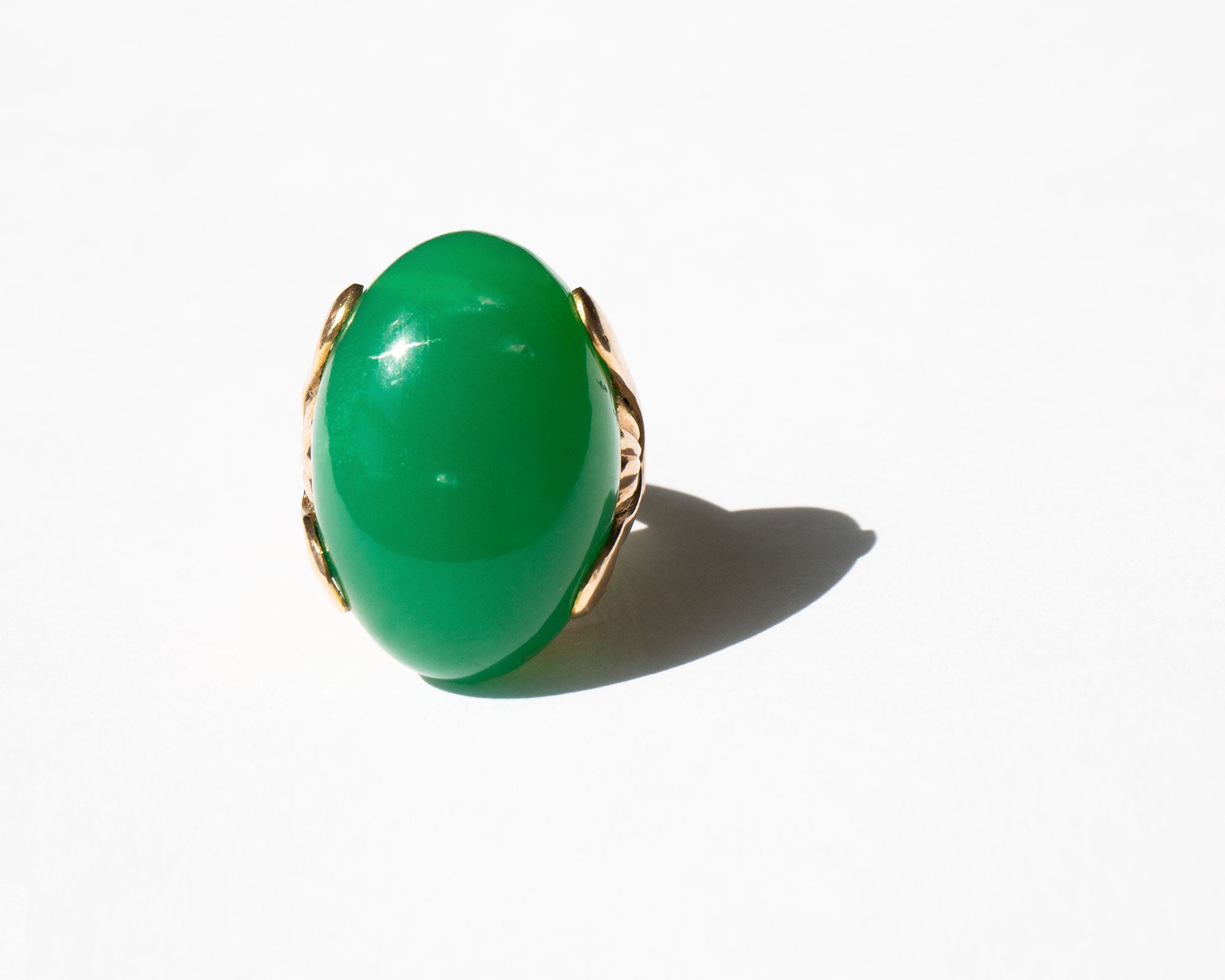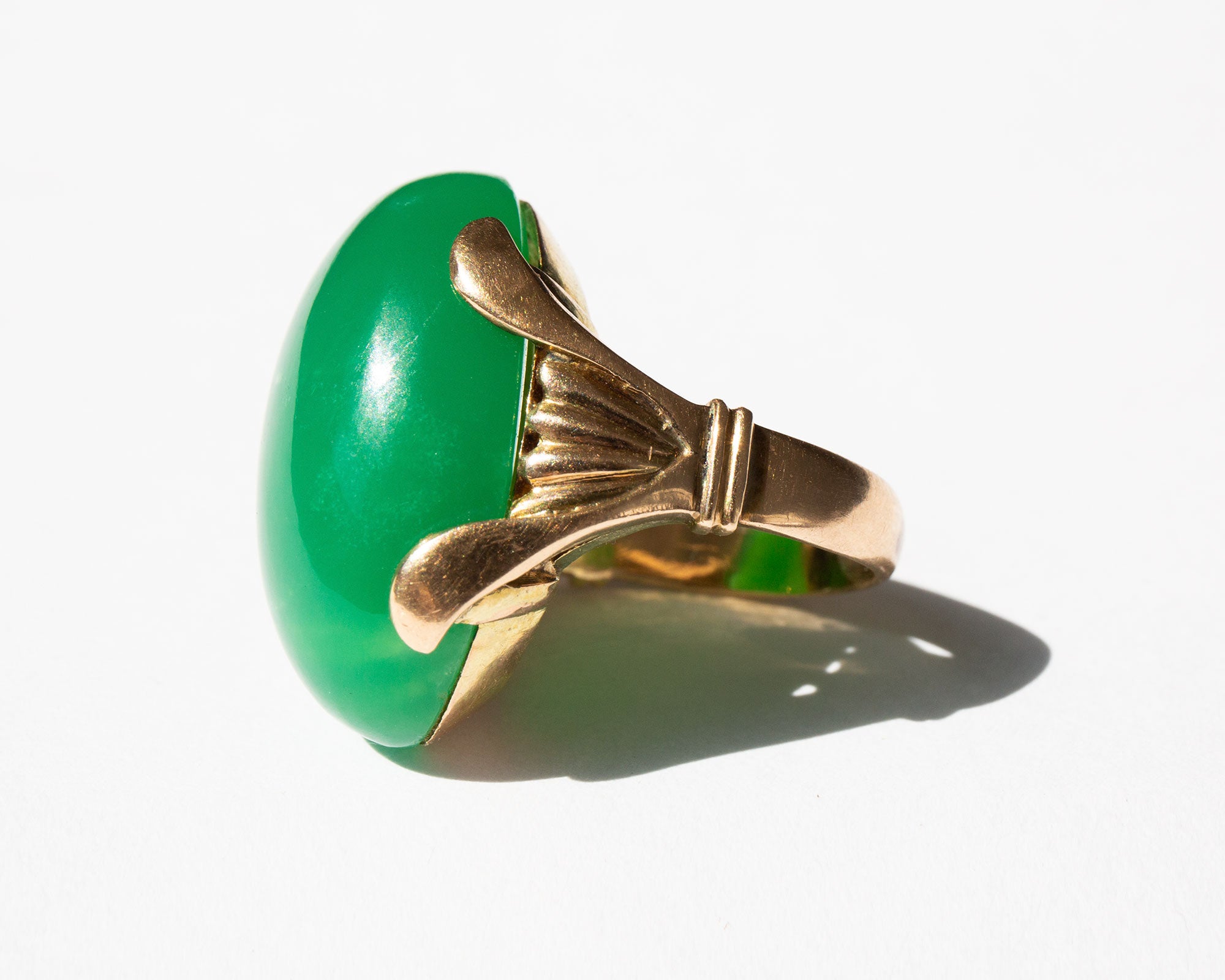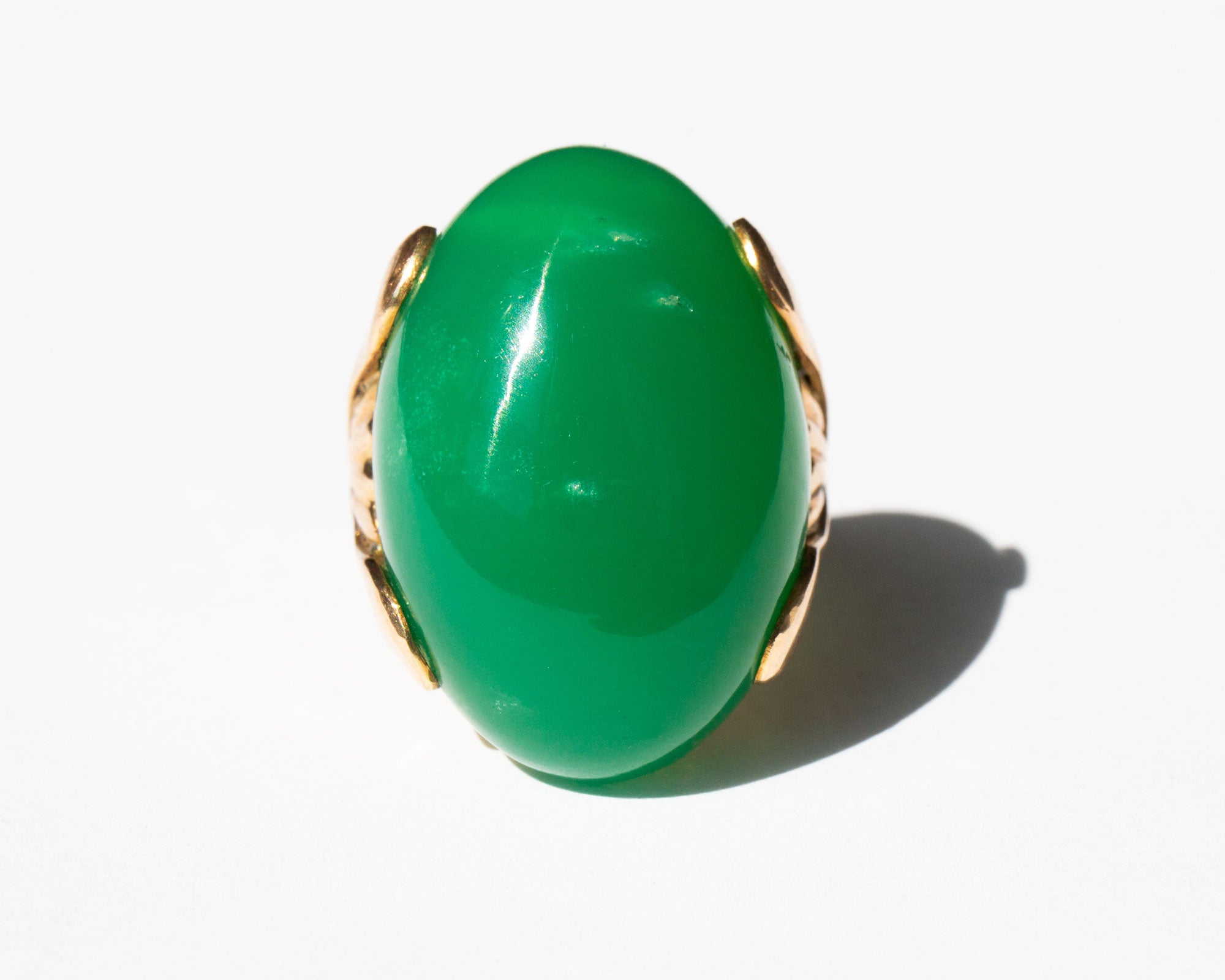 Stunning and colorful 1940s 14k gold ring with a large center chrysoprase cabochon. Chrysoprase is a variety of chalcedony and is known to be a symbol of a lust for life and is worn to promote growth, self-love, and a generally happy and positive outlook.