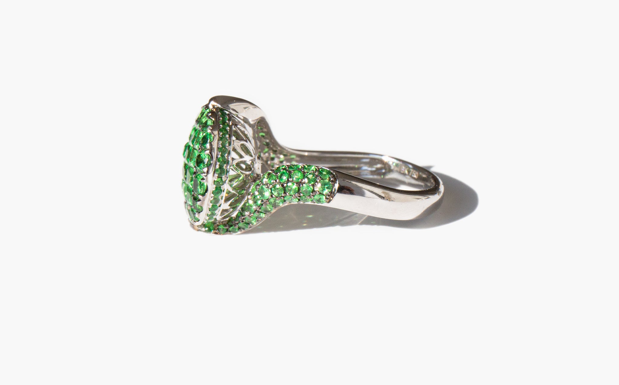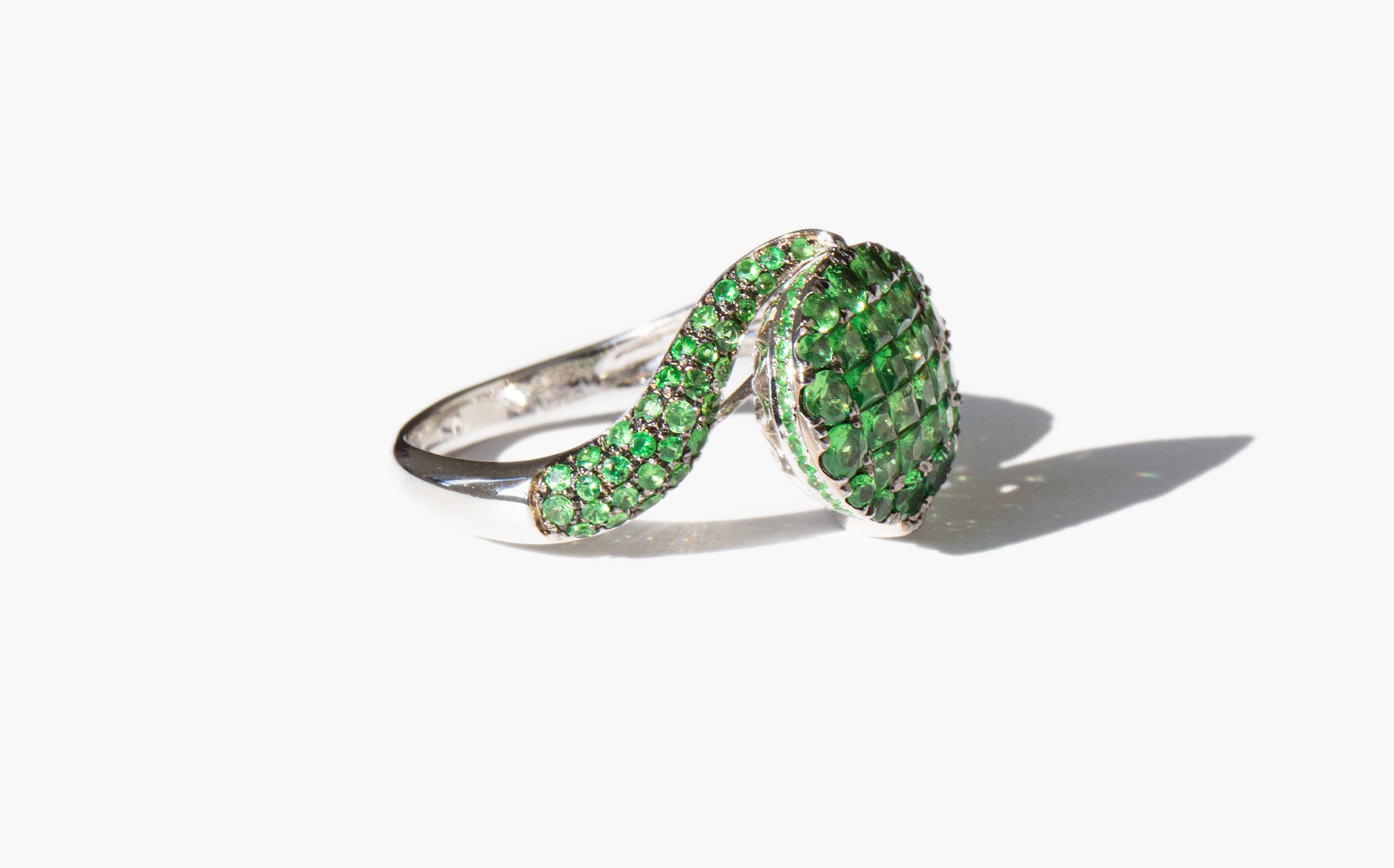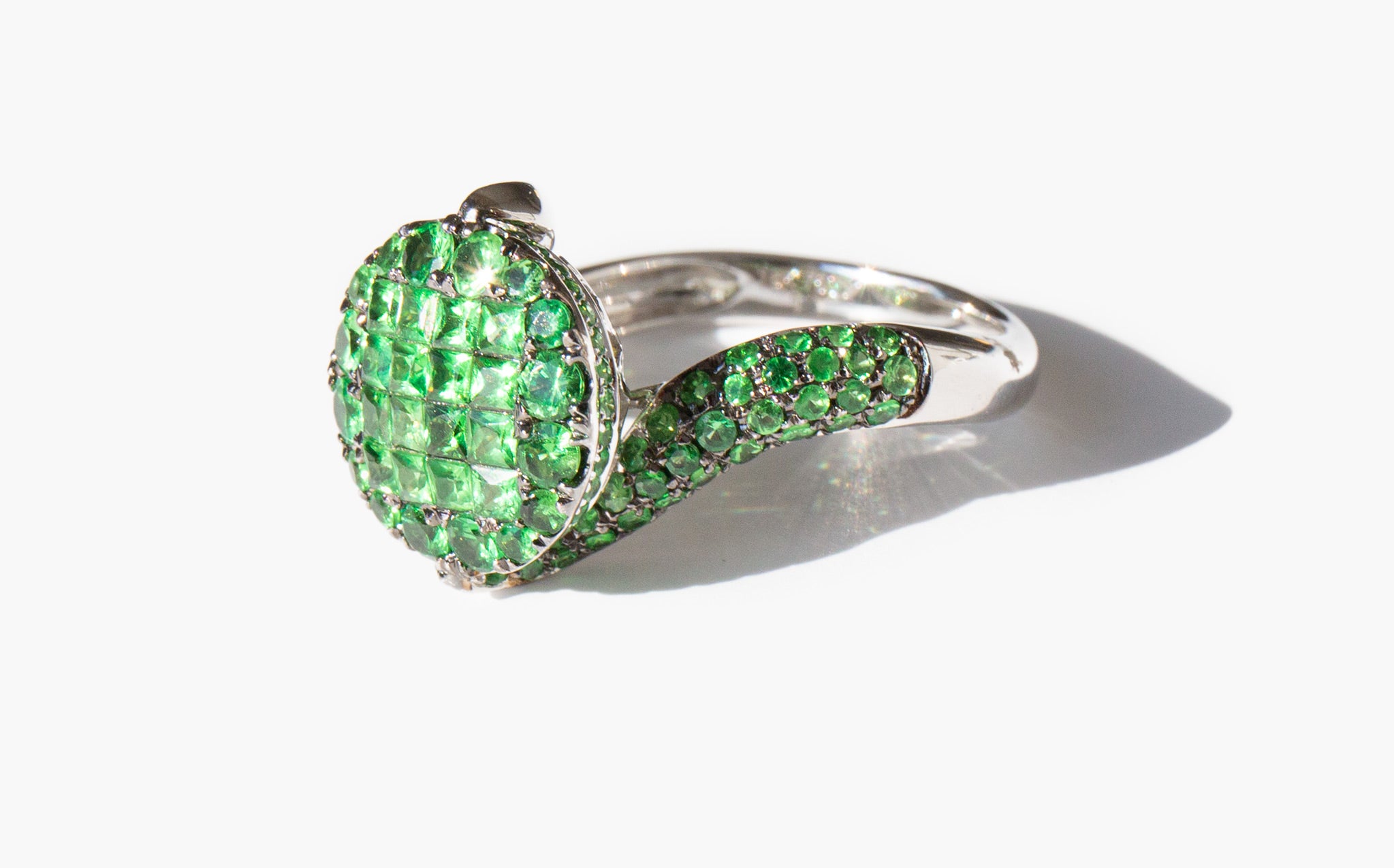 Elegantly sculpted 18k white gold ring with over 2 carats of invisibly set pave tsavorites.