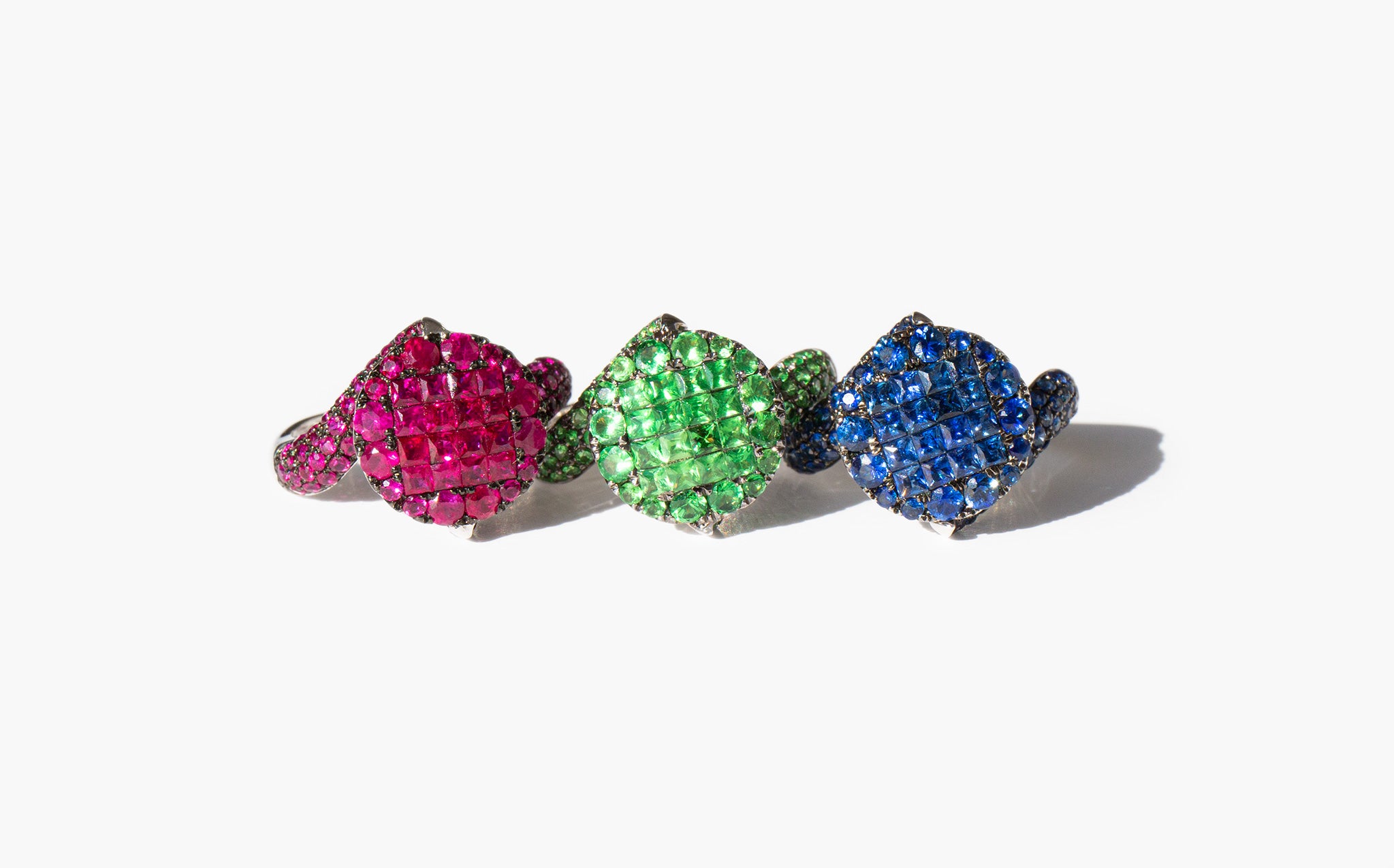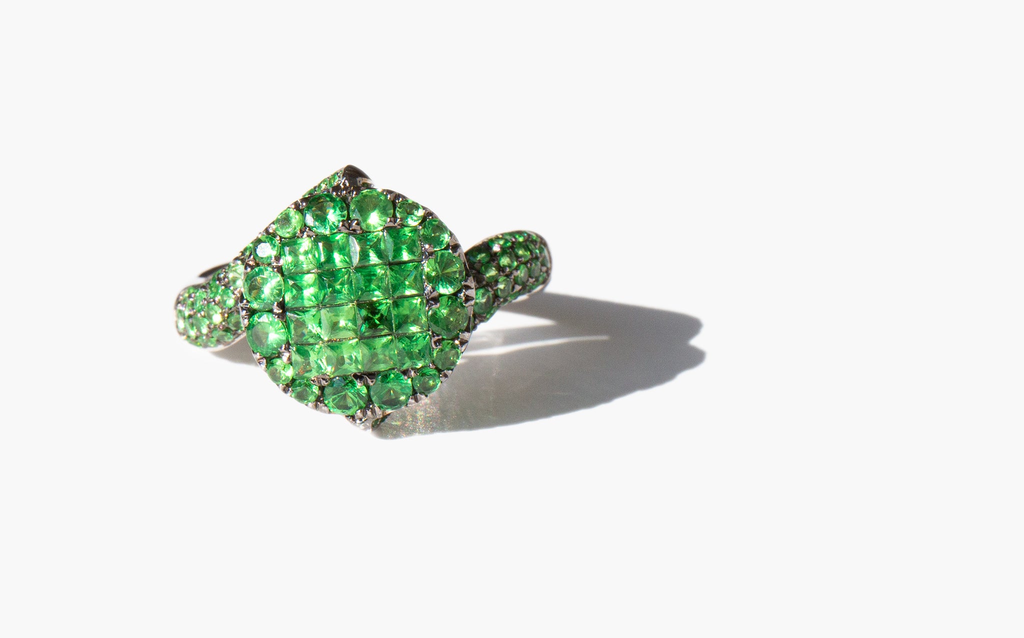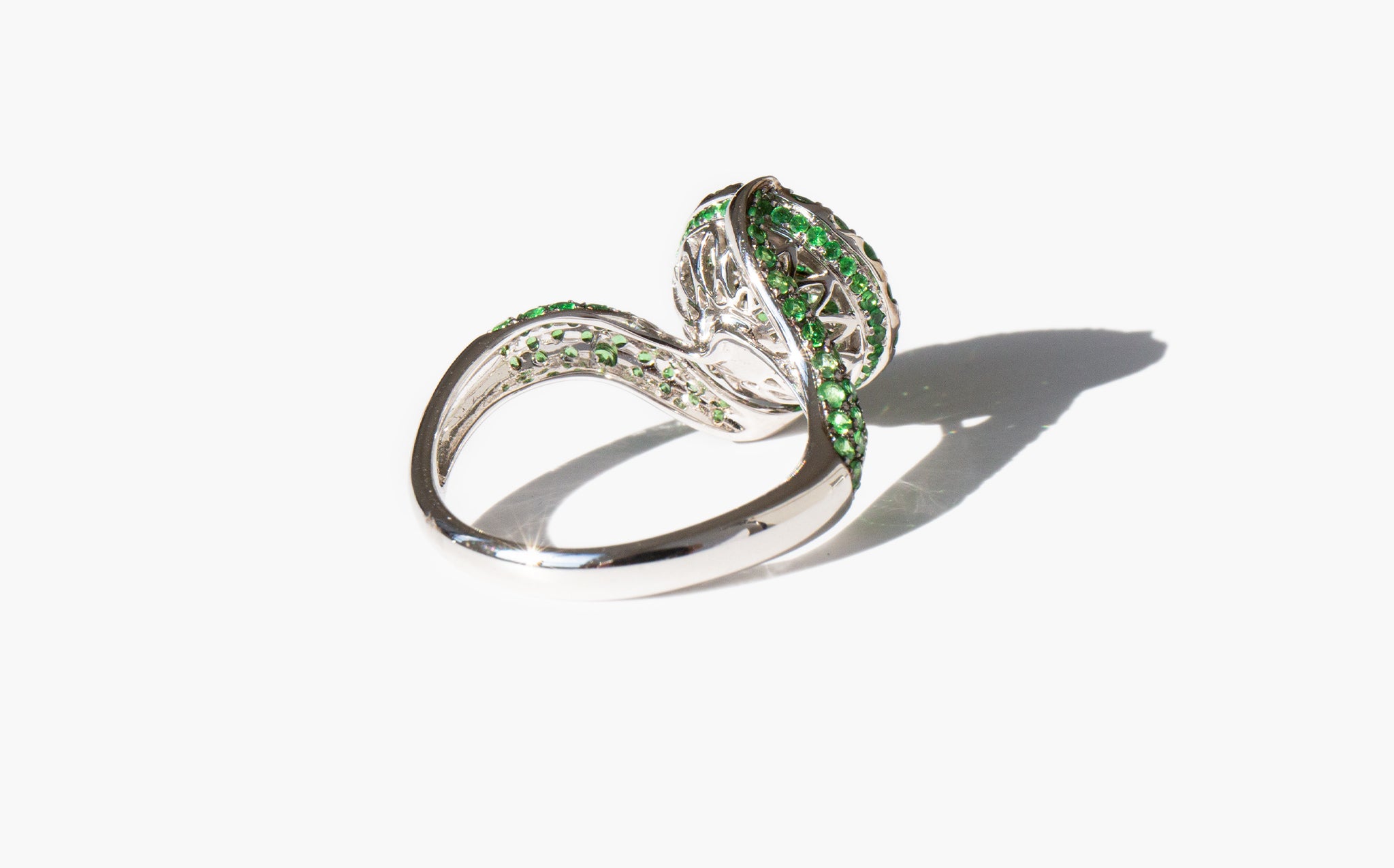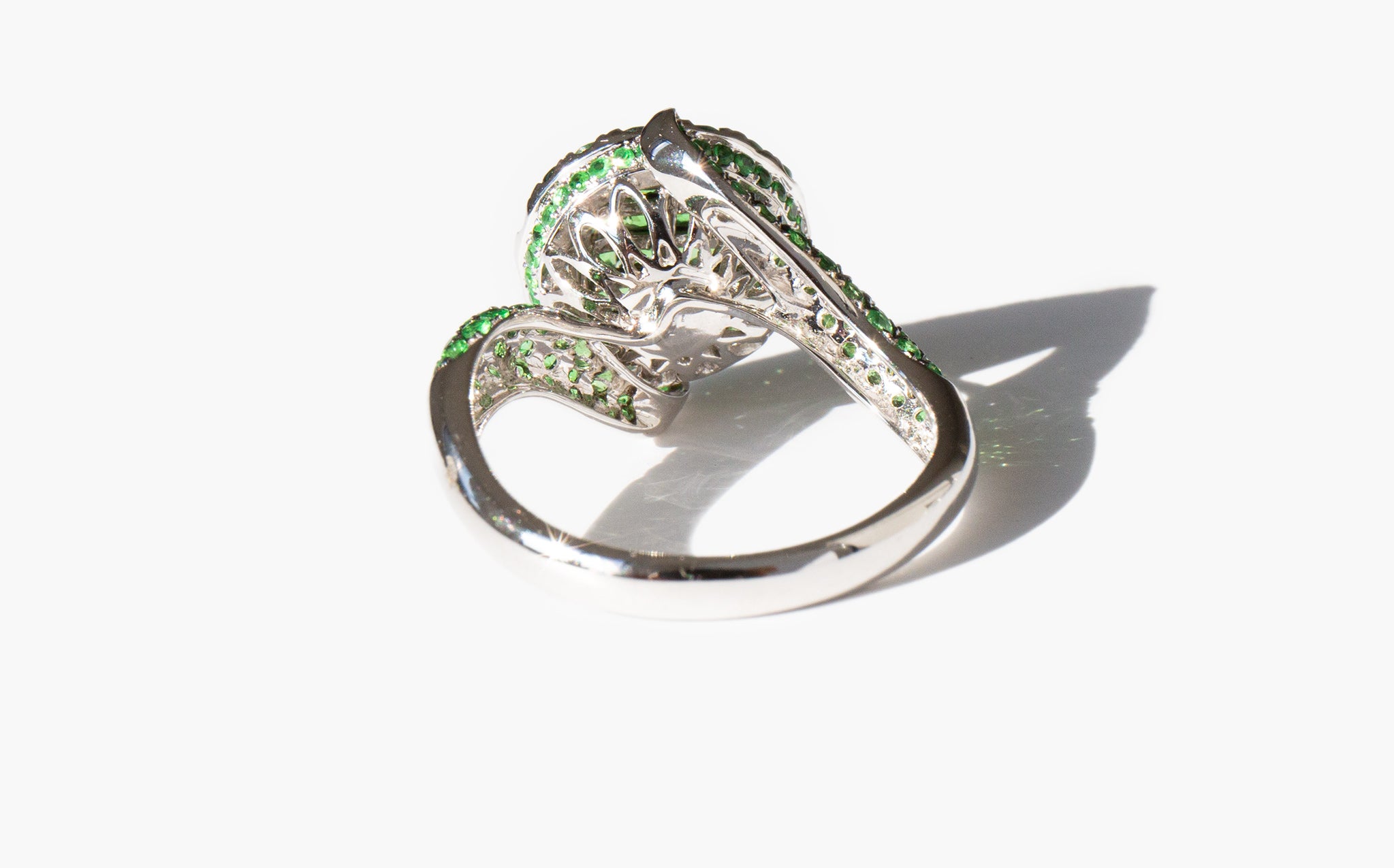 Elegantly sculpted 18k white gold ring with over 2 carats of invisibly set pave tsavorites.